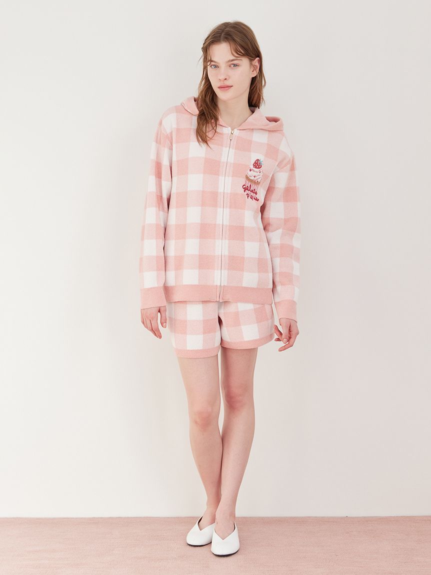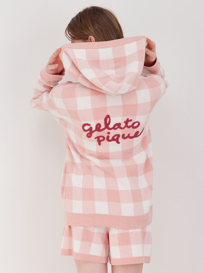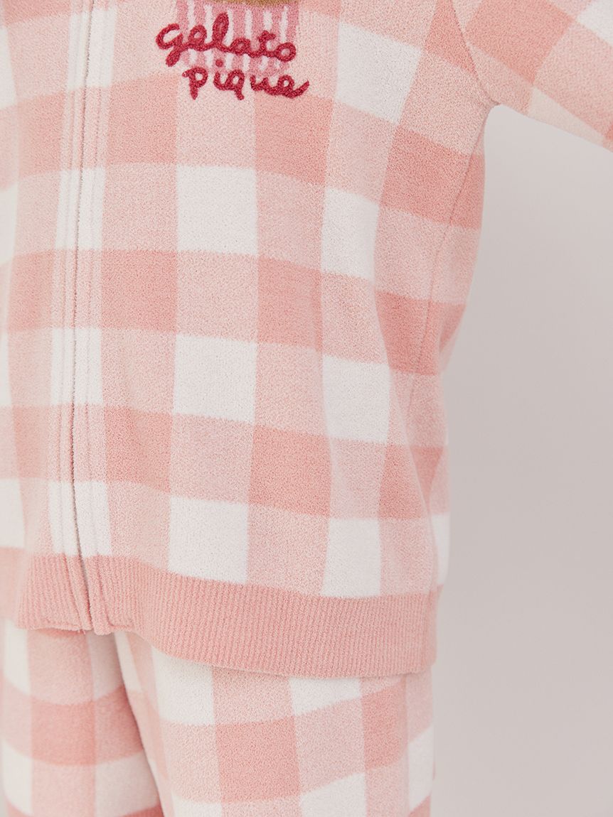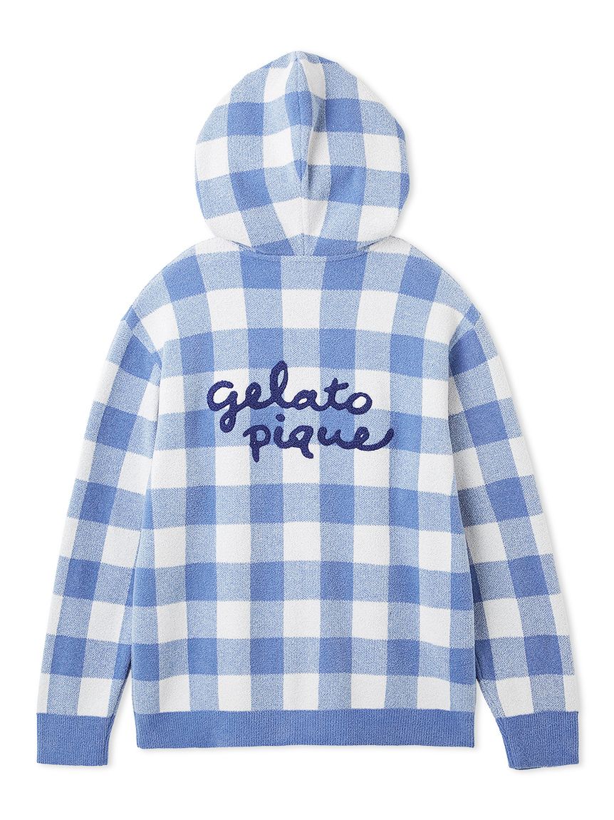 This knitwear series is perfect for the whole family, featuring bright, happy colors and cupcake and popcorn motifs. This zip-up hoodie is made from the lightweight 'Airy Moco' fabric, featuring a spring-like gingham check. Available in two colors: pink with a cupcake motif and blue with a popcorn motif in jacquard. The back features a large sagara pattern embroidery. This item is perfect for enjoying snack time with your child or watching a movie while munching on popcorn. We recommend pairing it with shorts and pullover from the same series.