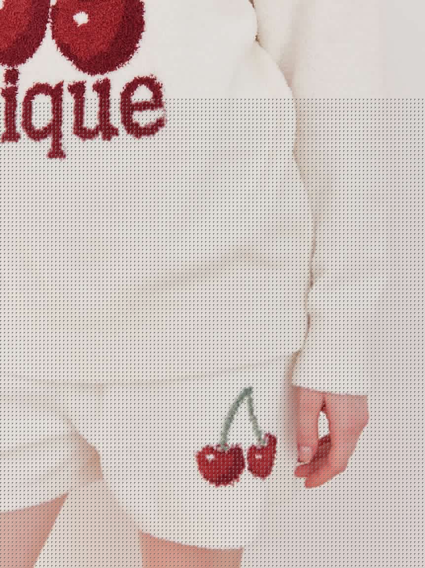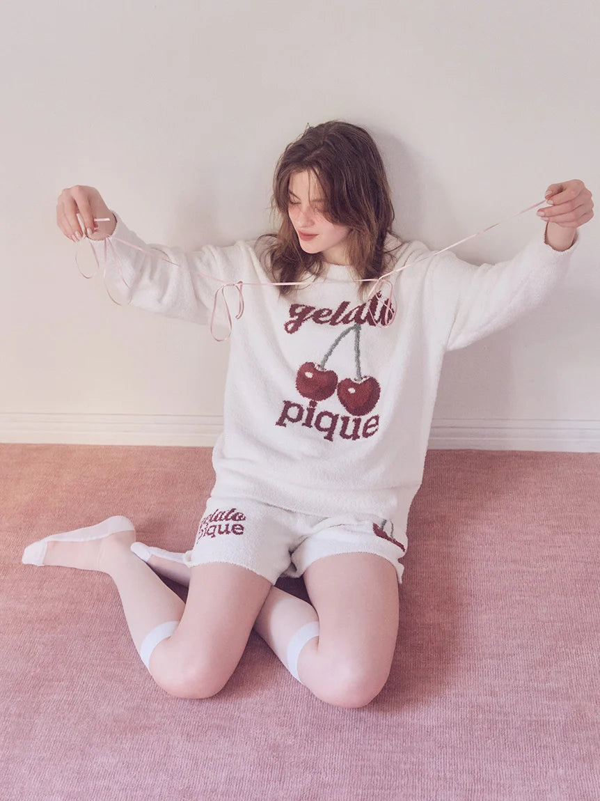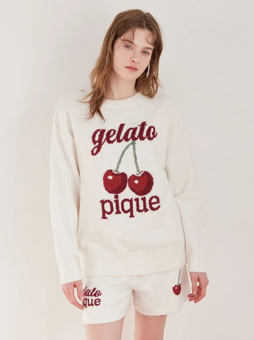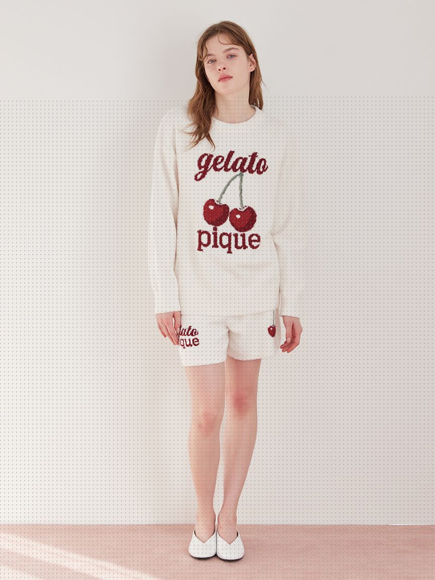 This adorable jacquard knitwear series features the popular cherry motif on soft 'BABY MOCO' fabric. This catchy pullover features a large cherry print and logo. The bold logo design features different fonts for "gelato" and "pique." Available in three colors: off-white, pink, and navy. We recommend coordinating it with the jacquard shorts or print long pants in the same collection.