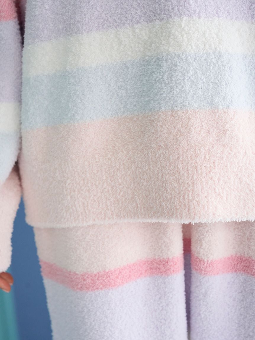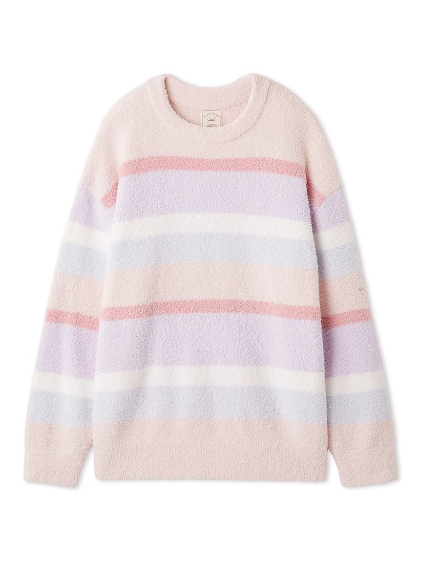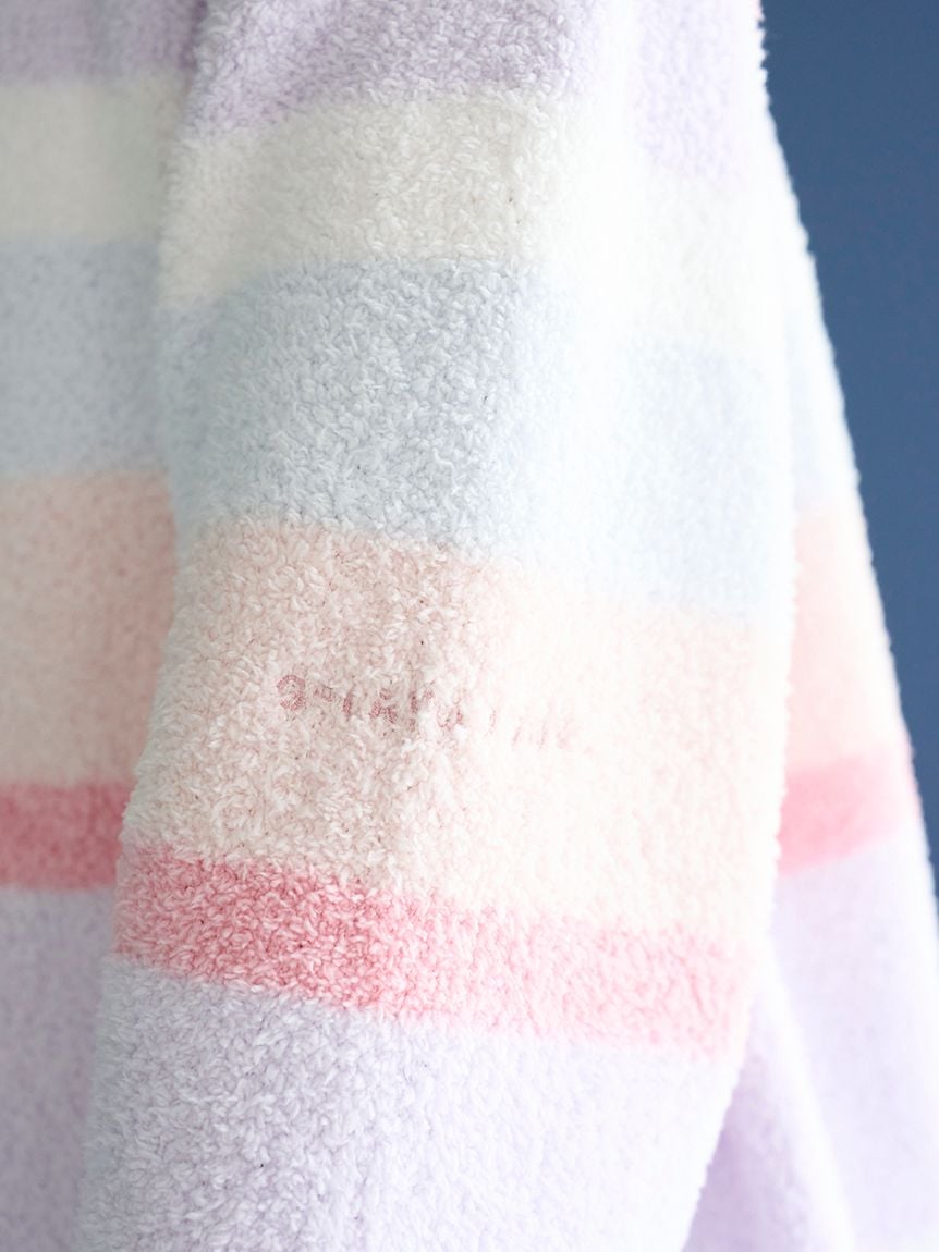 The 'Baby Moco' series features a colorful, candy-like striped pattern that creates a happy mood, making it a fun piece for both parents and children. This fluffy, lightweight pullover features a relaxed silhouette with roomy armholes. The pile is not too long, making it a versatile piece that can be enjoyed throughout the seasons, from the transition to early spring. It also features a logo embroidered on the left cuff. We recommend pairing it with the long pants from the same series or the candy-patterned series being released at the same time.