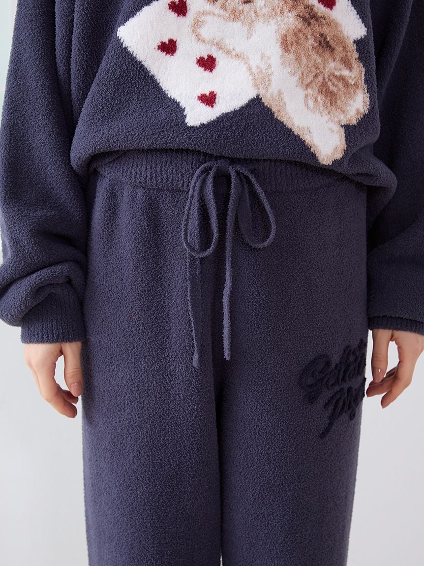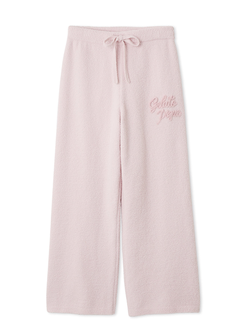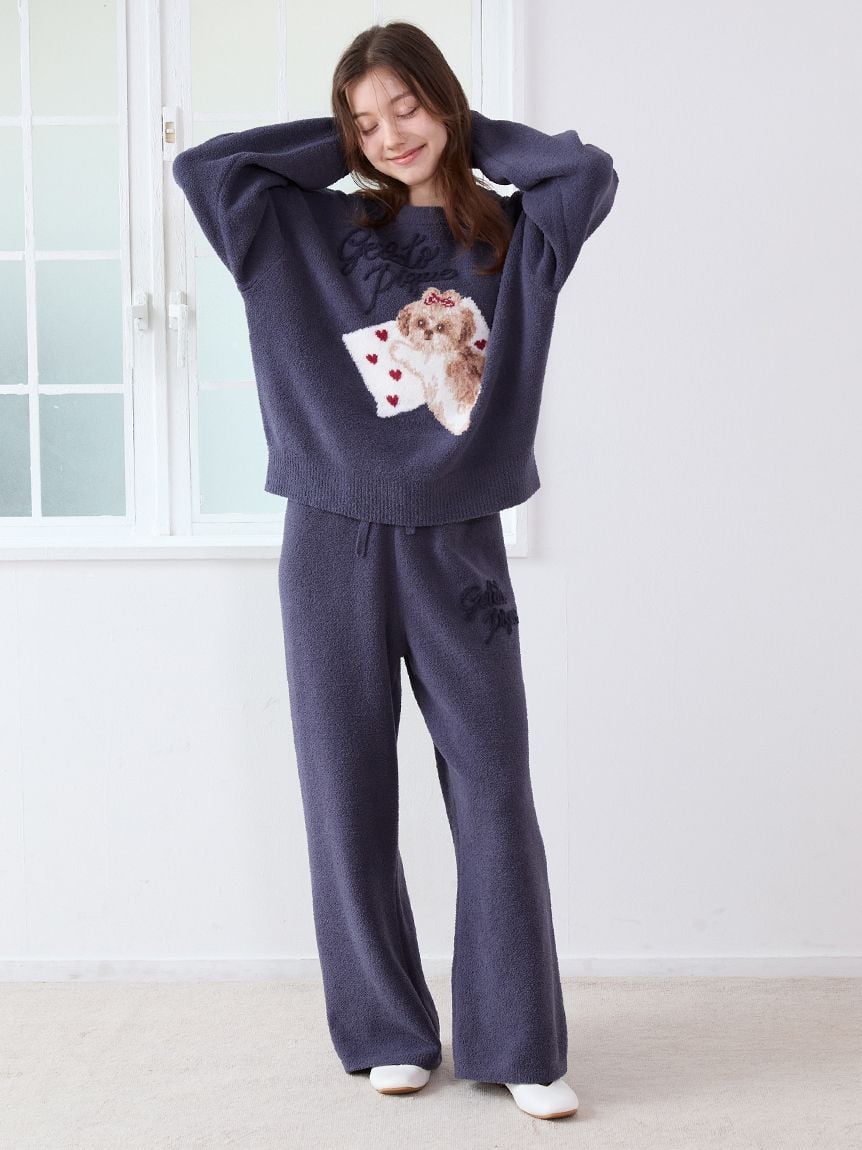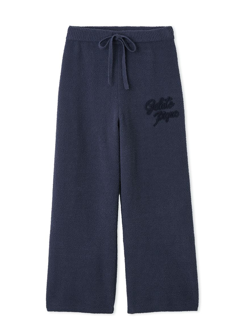 These long pants are made from 'Baby Moco' material and feature a striking, plump, three-dimensional logo. Their soft, fluffy texture and relaxed, straight silhouette make them perfect for all seasons. They feature a pocket on the right hip and a solid color that pairs well with a wide range of tops. Available in off-white, blue, and the online-exclusive navy. We recommend coordinating them with the Shih Tzu jacquard pullover, which will be released at the same time.