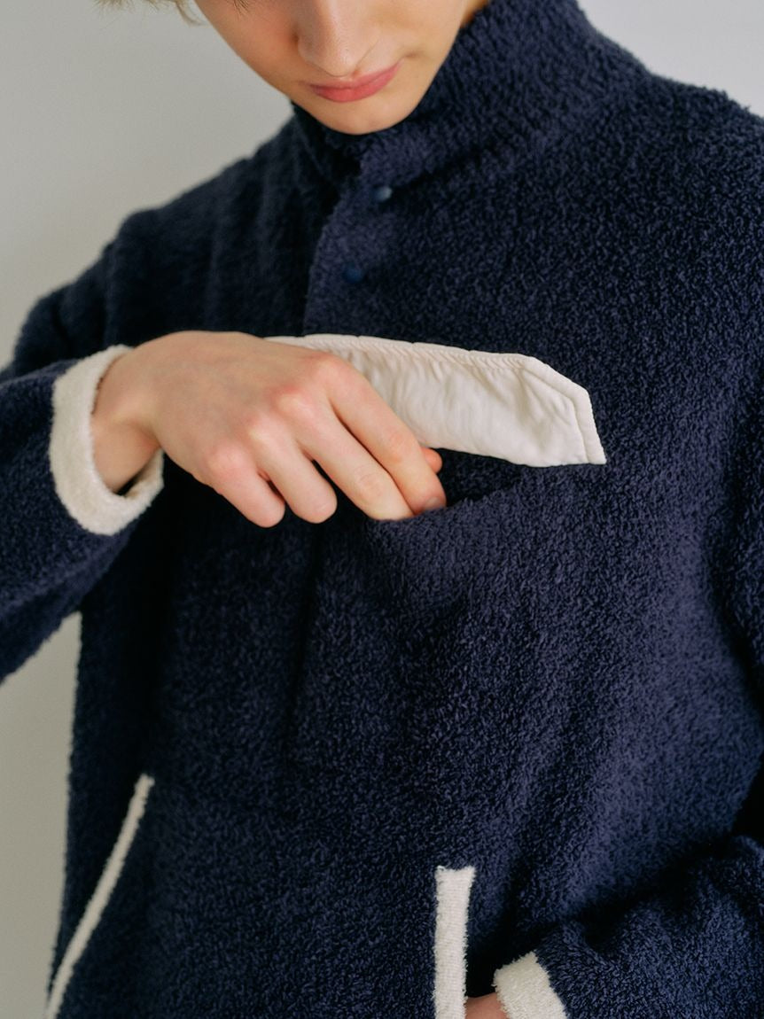 Created in collaboration with Japanese men fashion magazine BEGIN, these collaboration items were made with fluffy powder material while bringing outdoor fashion into the bedroom. Apart from a large pocket in the front, the biggest characteristic of this pullover is its cool color-scheme and cut which is designed with layering with other items in mind. Enjoy pairing this pullover with pants from the same collection, or feel free to explore more options and looks!