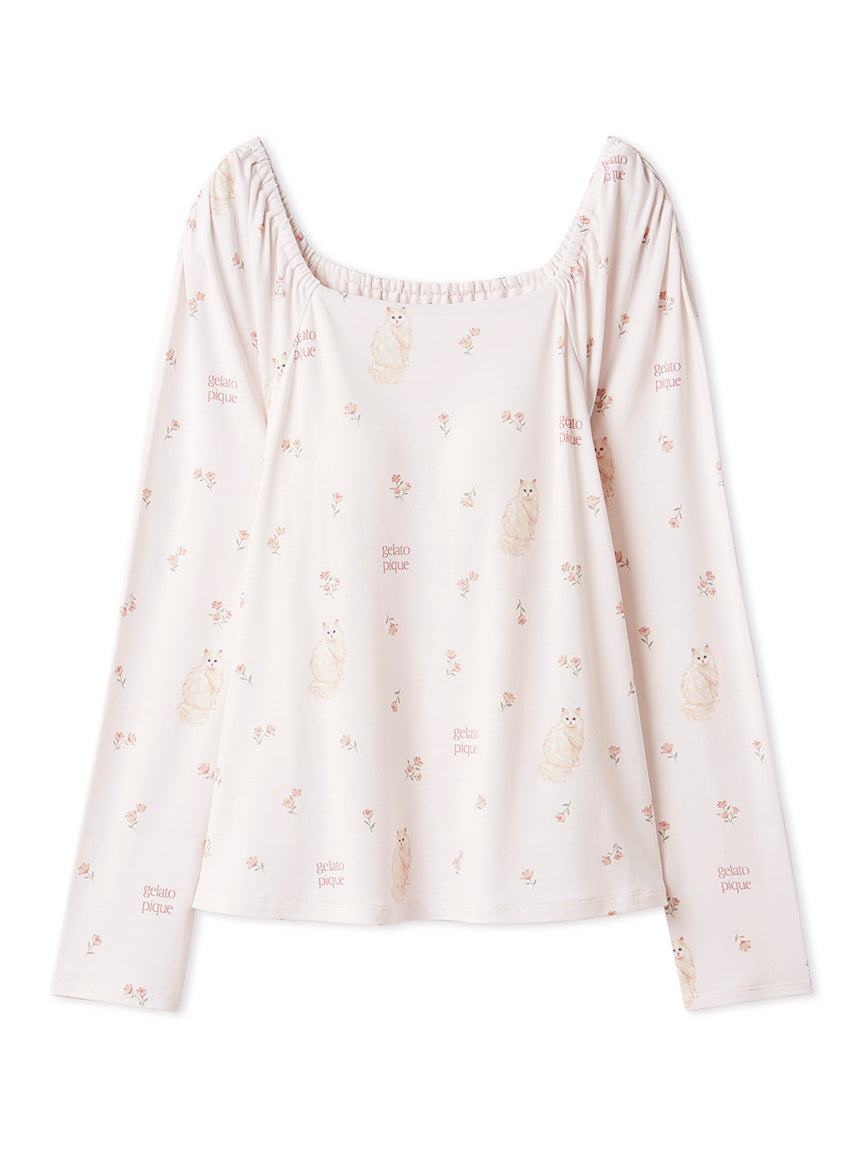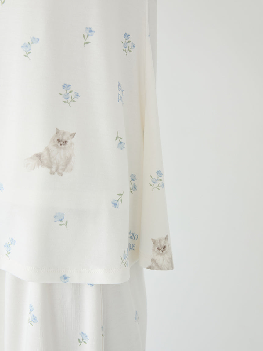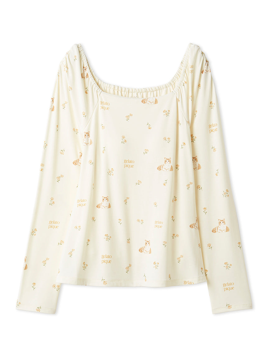 This cat cut-and-sew series features bright color that welcome you into the warm spring. Mixing blooming flowers of spring with cute cats, we bring you this cut-and-sew pullover with built-in cups. Available in yellow, pink, and blue, pair this pullover with the cat fur-like cardigan and long pants for a setup perfect for spring.