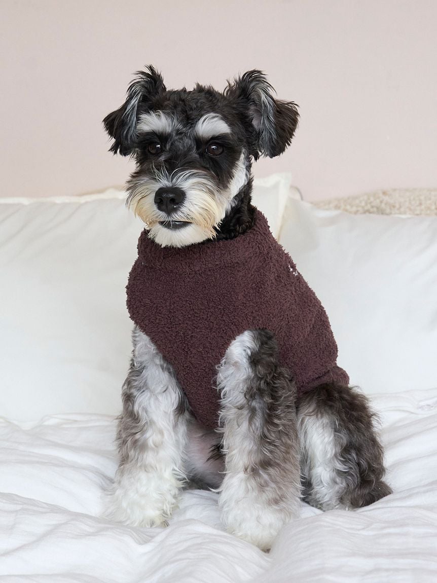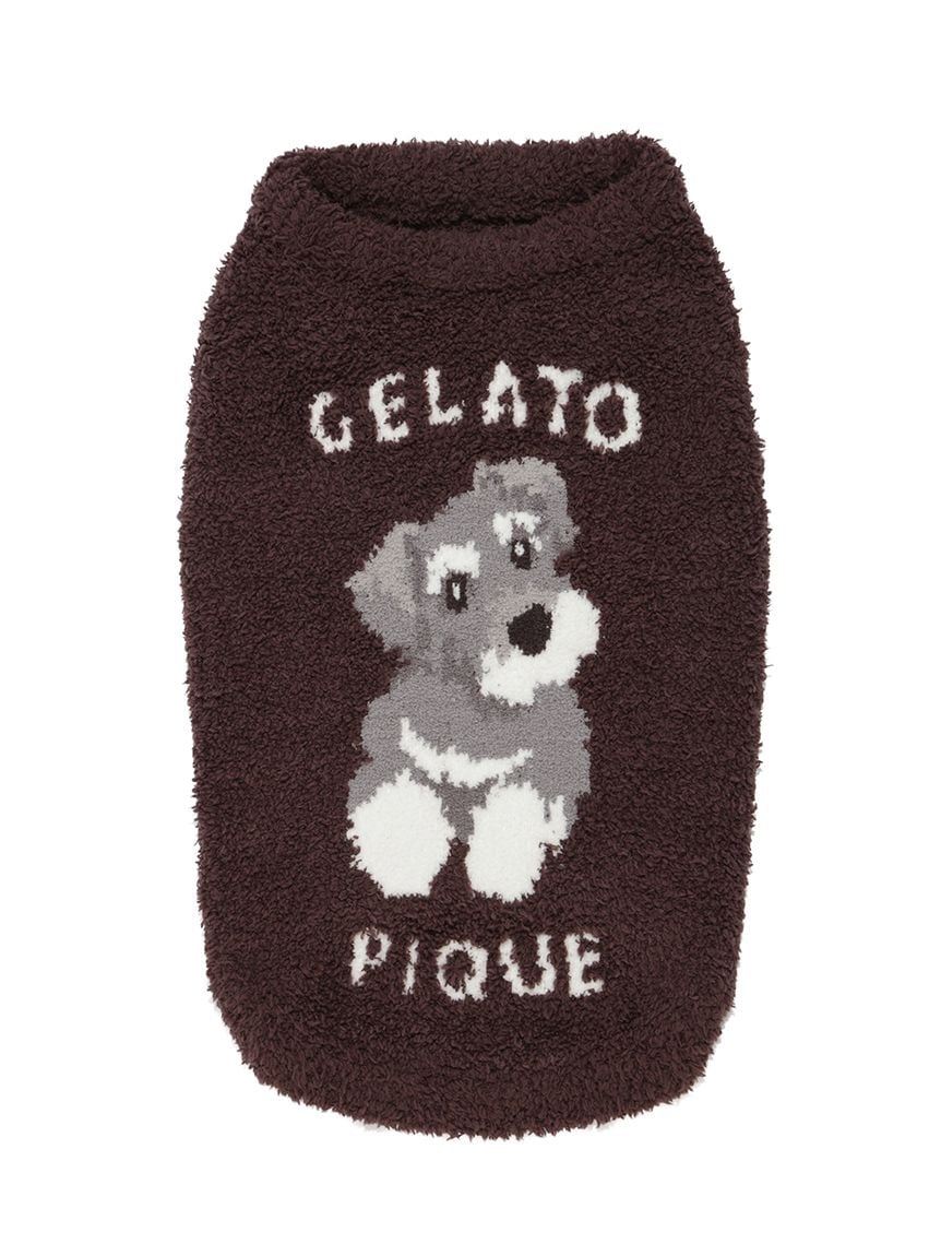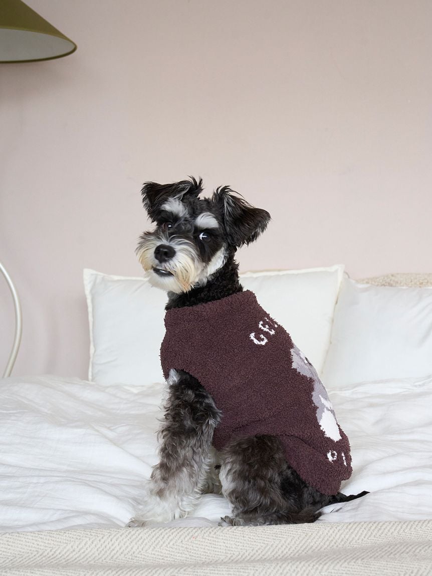 This schnauzer-patterned 'Baby Moco' pullover looks adorable on miniature schnauzers. The back features a jacquard print of a schnauzer. Available in two colors: a subdued blue that complements the schnauzer's coat color, and a chic brown. It also makes a great gift for schnauzer owners.