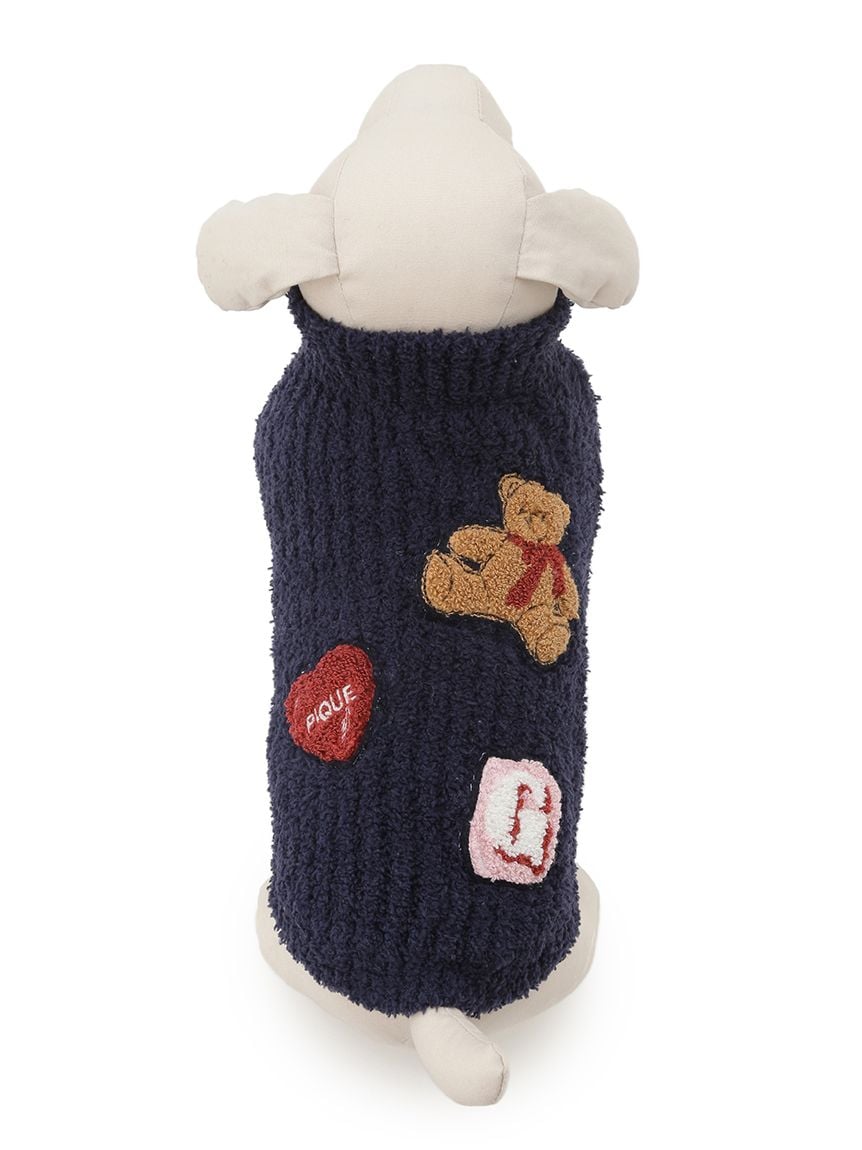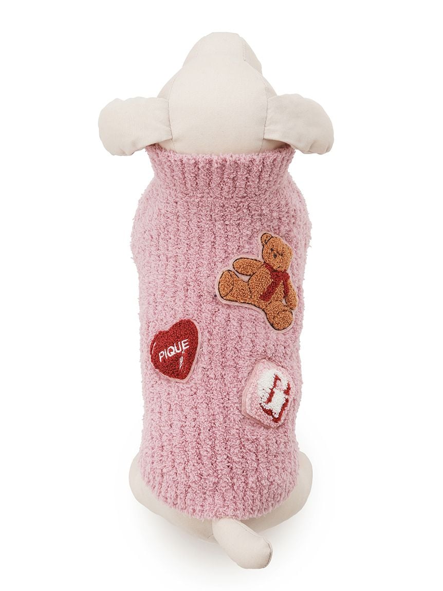This series is inspired by a girl's cute room, where she lives with her favorite stuffed bear. This pullover features soft, fluffy 'BABY MOCO' fabric in a rib knit. The back features a stuffed bear, a heart-shaped cushion, and a sagara patch with the letter 'G' cut out from a magazine. Available in three colors: ivory, pink, and navy. This item can be worn together with the owner's loungewear.