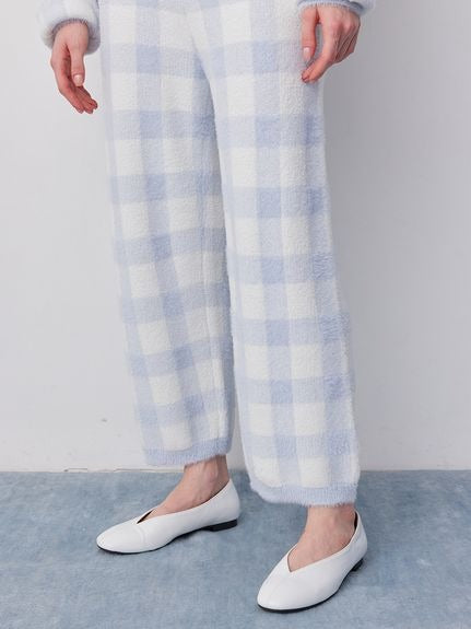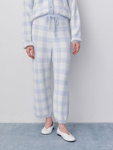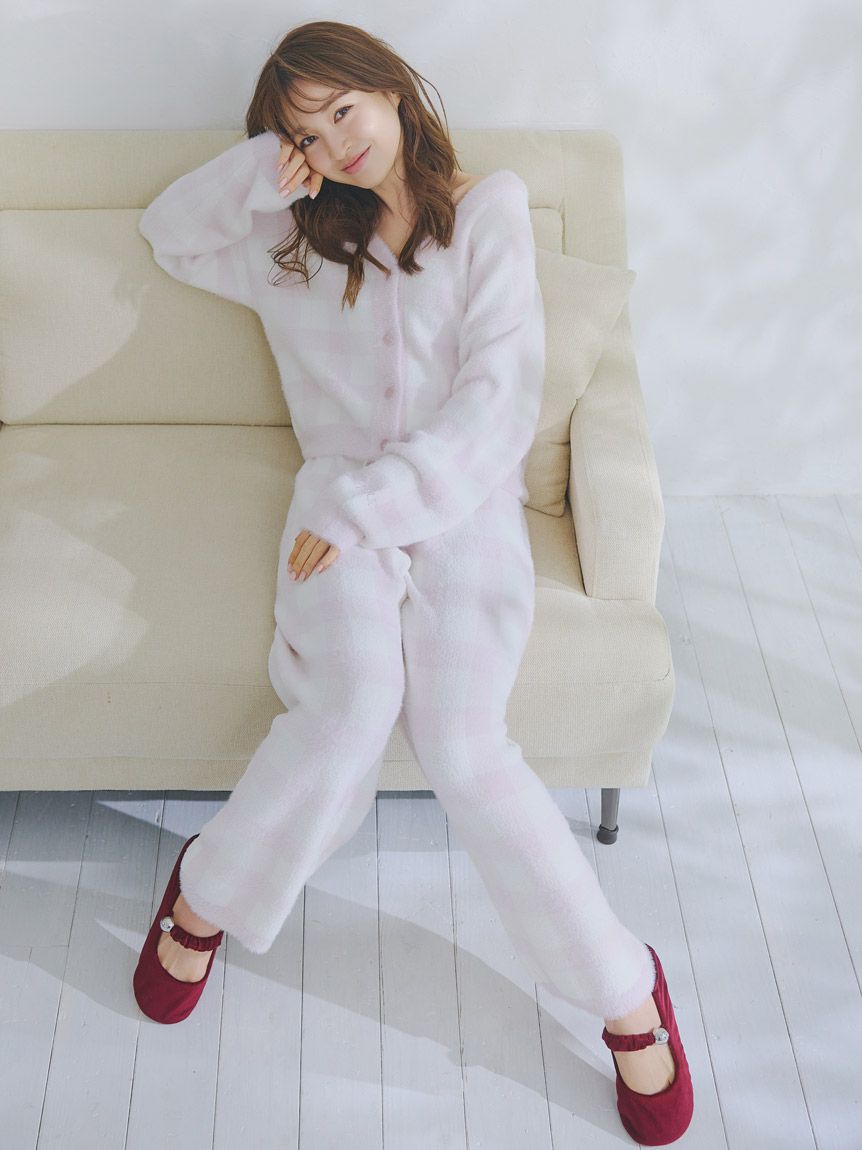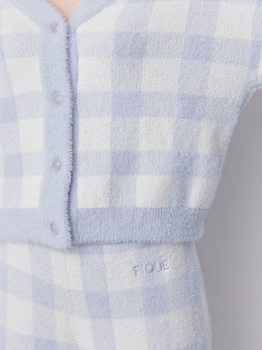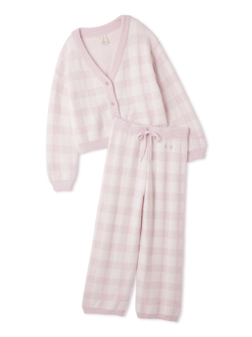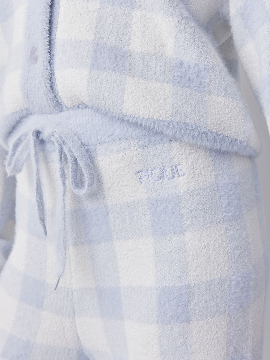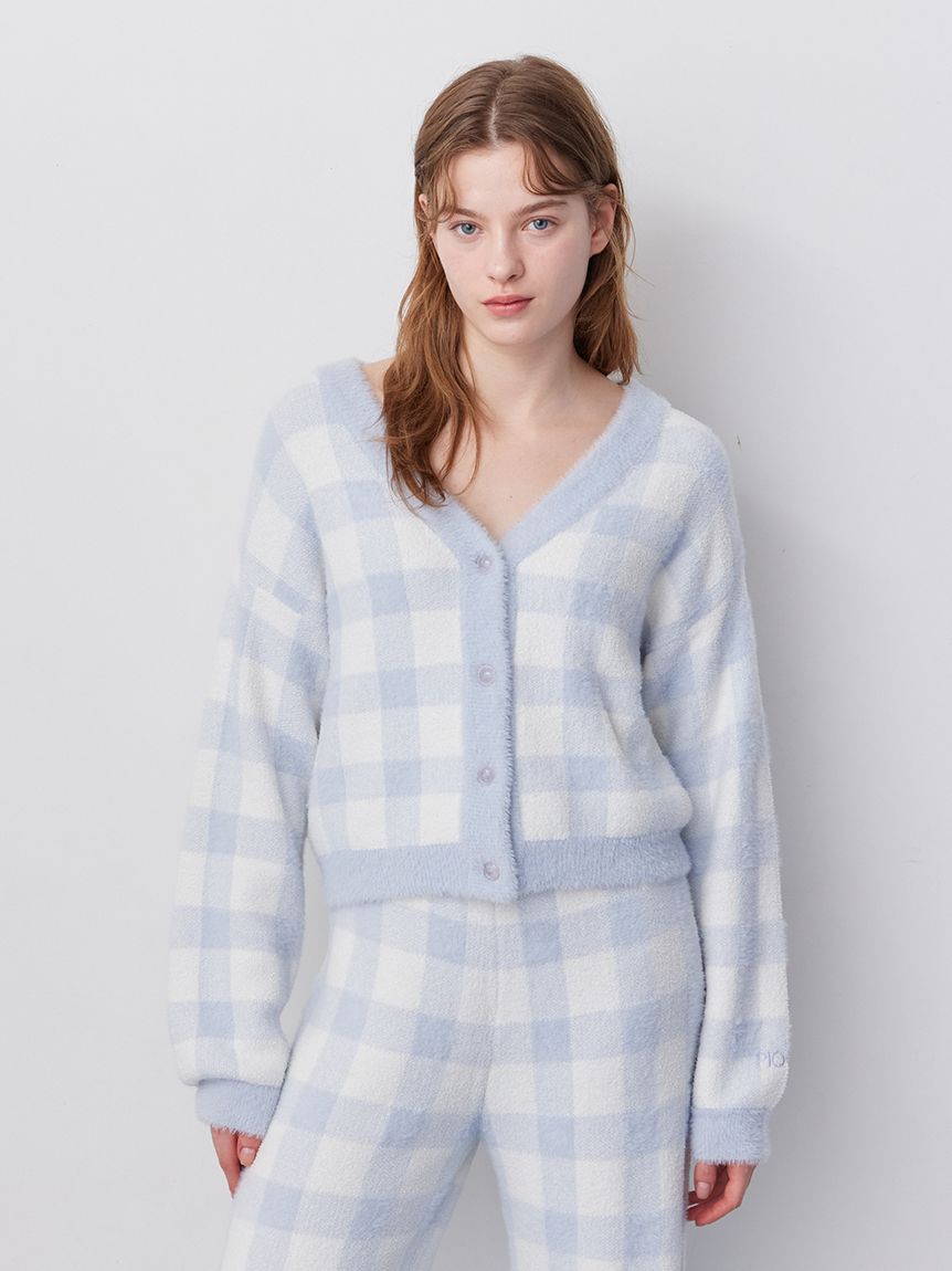 Created with a mix of smooth fabric, the popular checkered series returns with three different items. This set includes a soft cardigan and a pair of straight-cut long pants. A logo embroidery adds tiny detail to the simple design. Available in pink and blue, a cardigan & short set and a pet pullover is also released at the same time.
