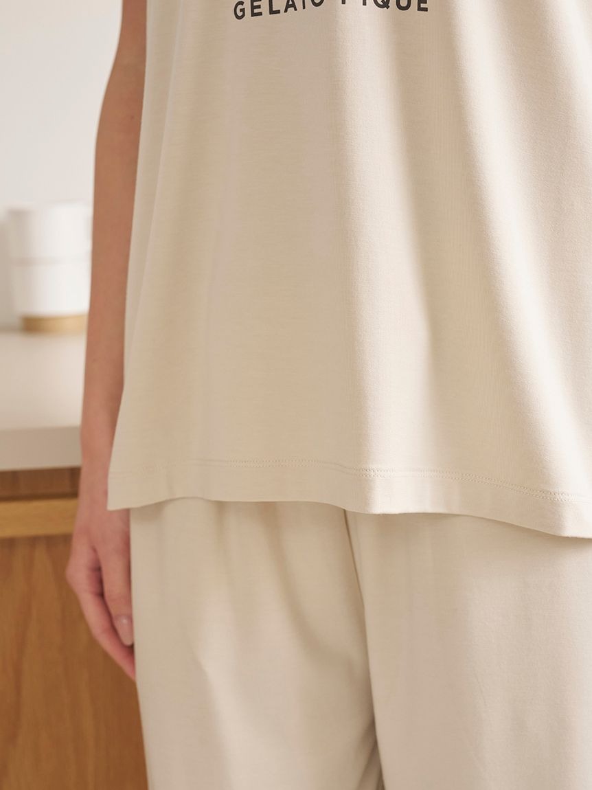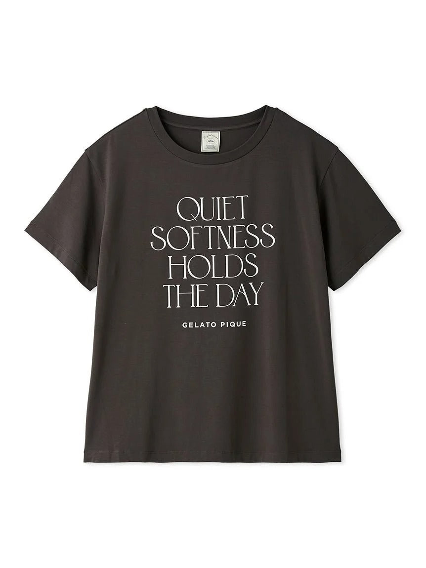 This short sleeve T-shirt is made of a smooth rayon fabric that gives a cool feeling to your skin, finished with a relaxing cut to provide you quiet softness for the summer, just as the printed quote suggests. Available in beige and dark gray, we recommend wearing this item with a bottom item from the same collection.