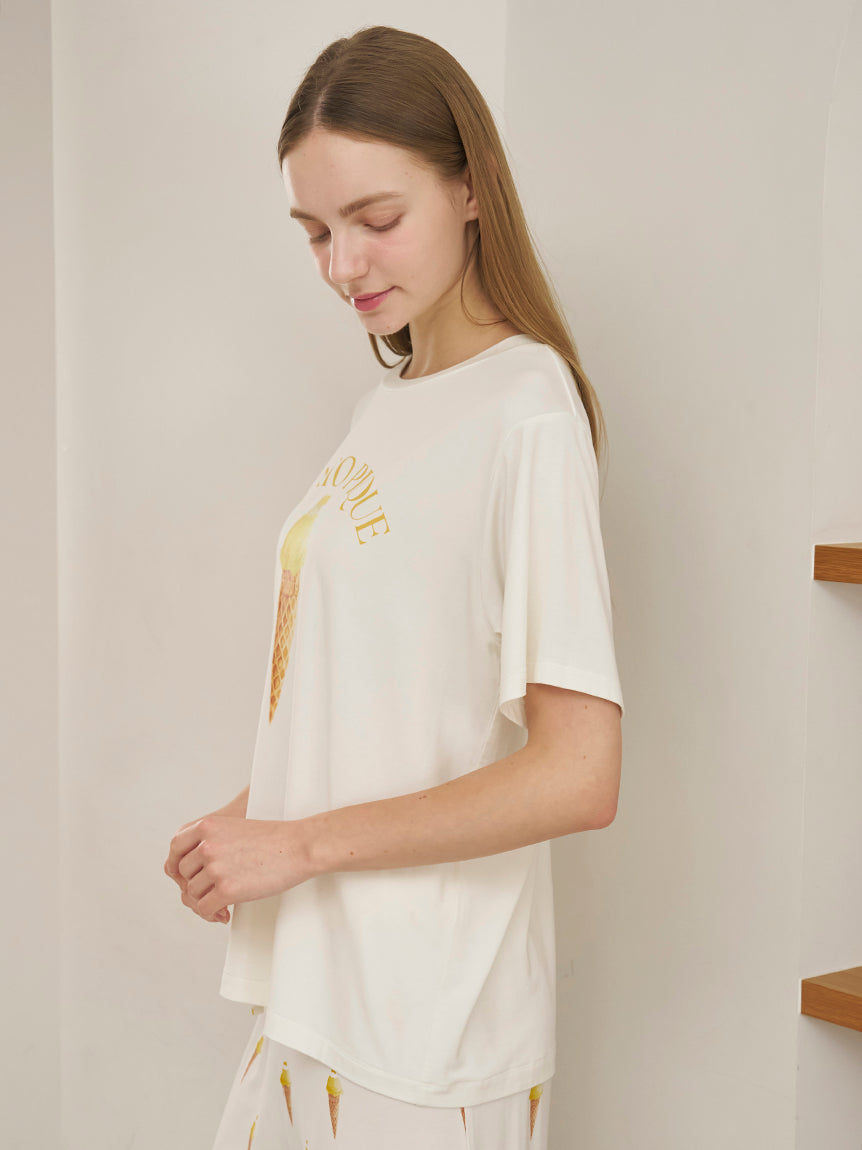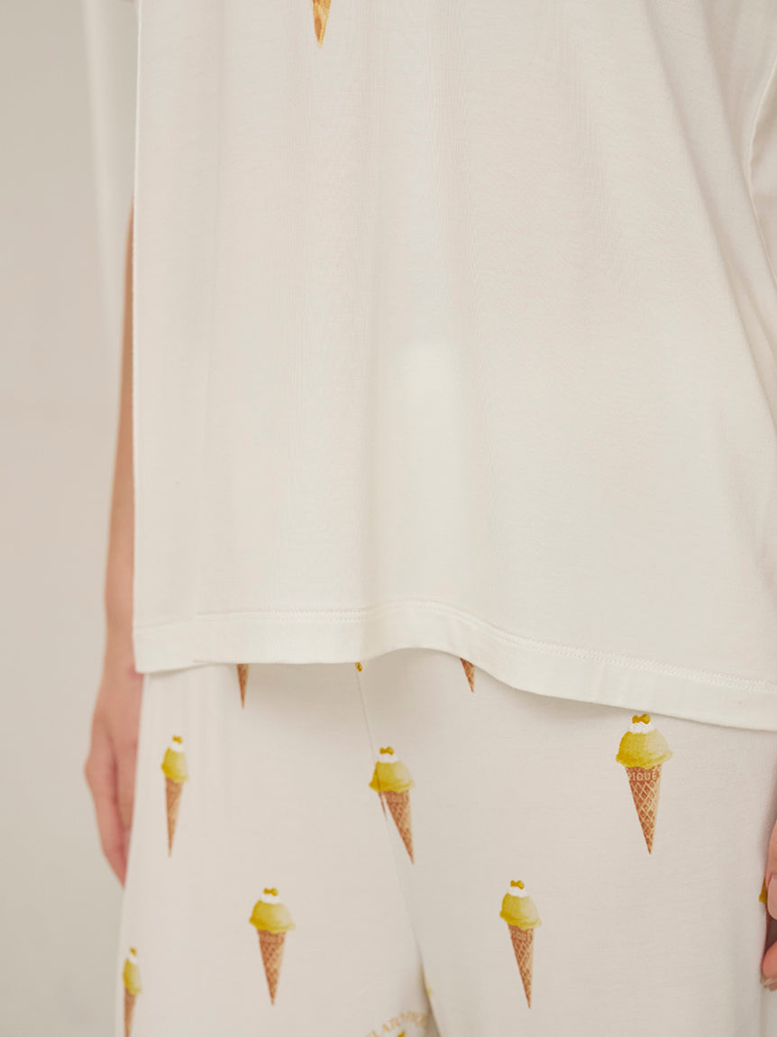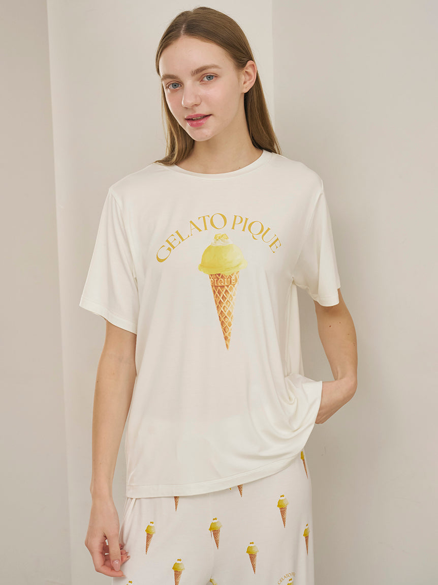 Lemon, strawberry, and soda flavor sorbet are printed on these T-shirts to cool you down in the summer. Made with cool rayon material, this item would be perfect for the upcoming sweaty season. Available in yellow, pink, and blue, don't forget to also checkout the matching bottoms and Smoothie Striped items from the same collection!