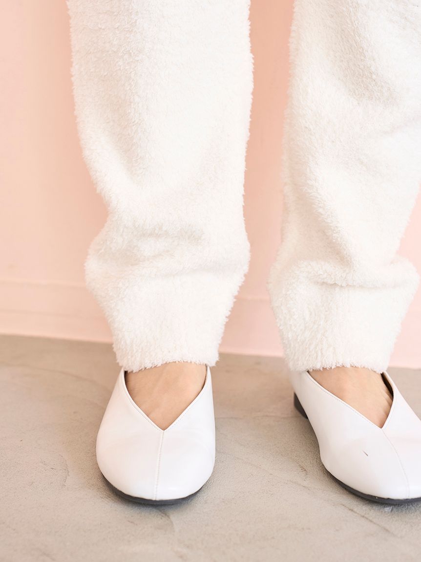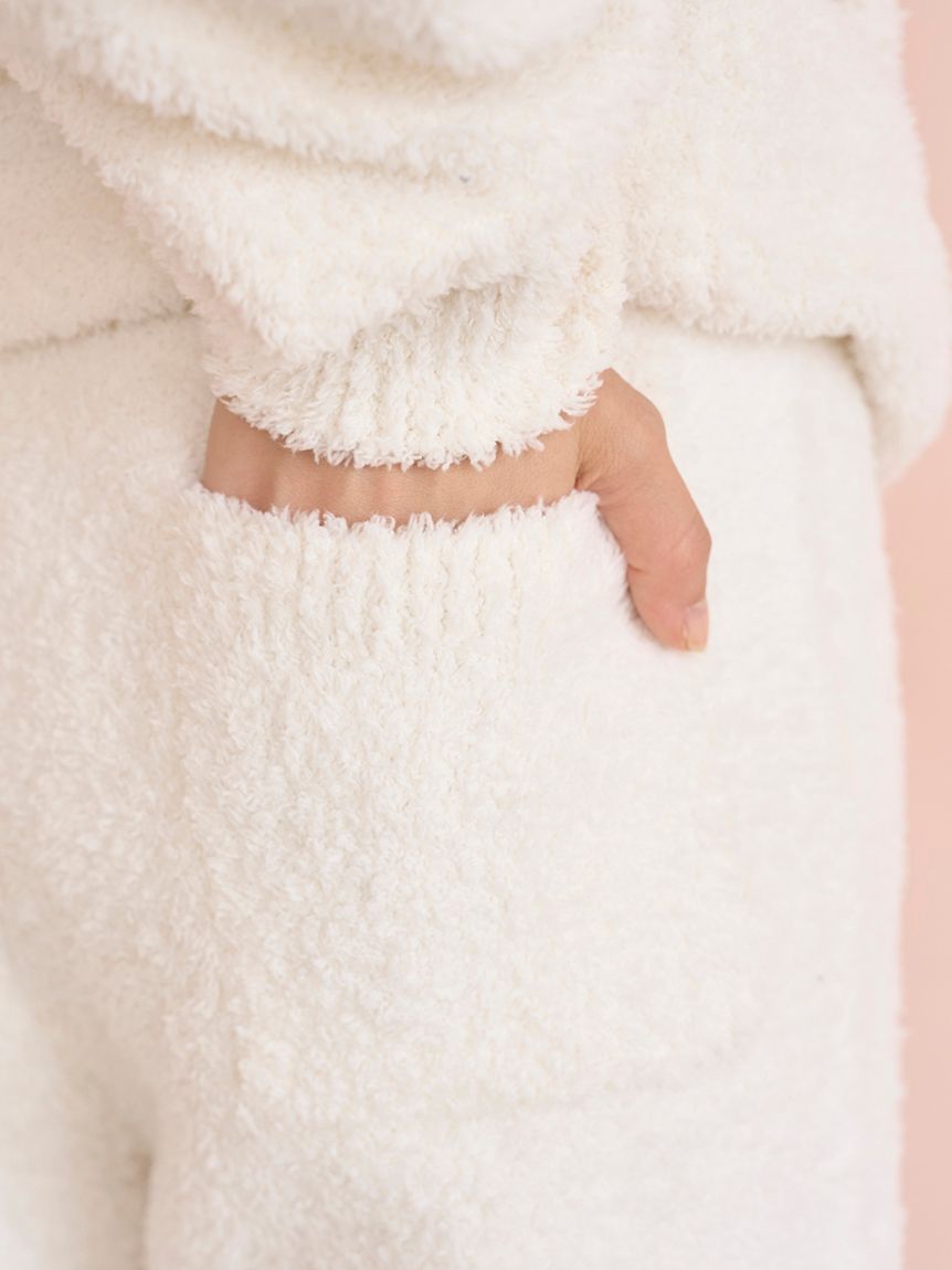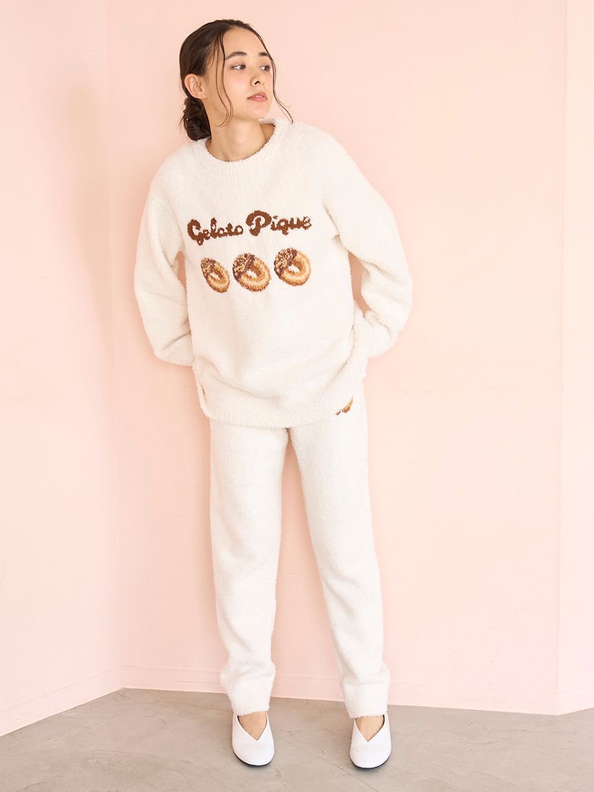 A sweet treat at the end of a hard day. The Donut Jacquard series embodies the happy feeling you get before eating a donut. These long pants are made from a warm, fluffy material, featuring a donut jacquard design and a sagara embroidered logo on the left hip. The tapered hem allows for a relaxed fit, allowing for easy movement even while doing housework. Available in three colors: cream, pink, and navy, each featuring a different donut flavor. Pair them with the pullovers and cardigan, or other items from the same collection.