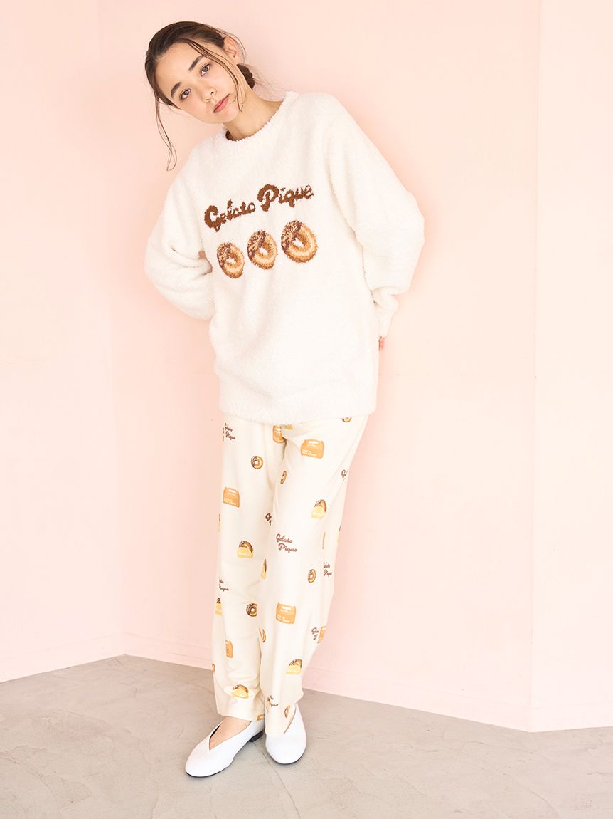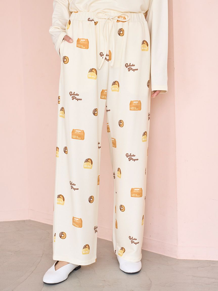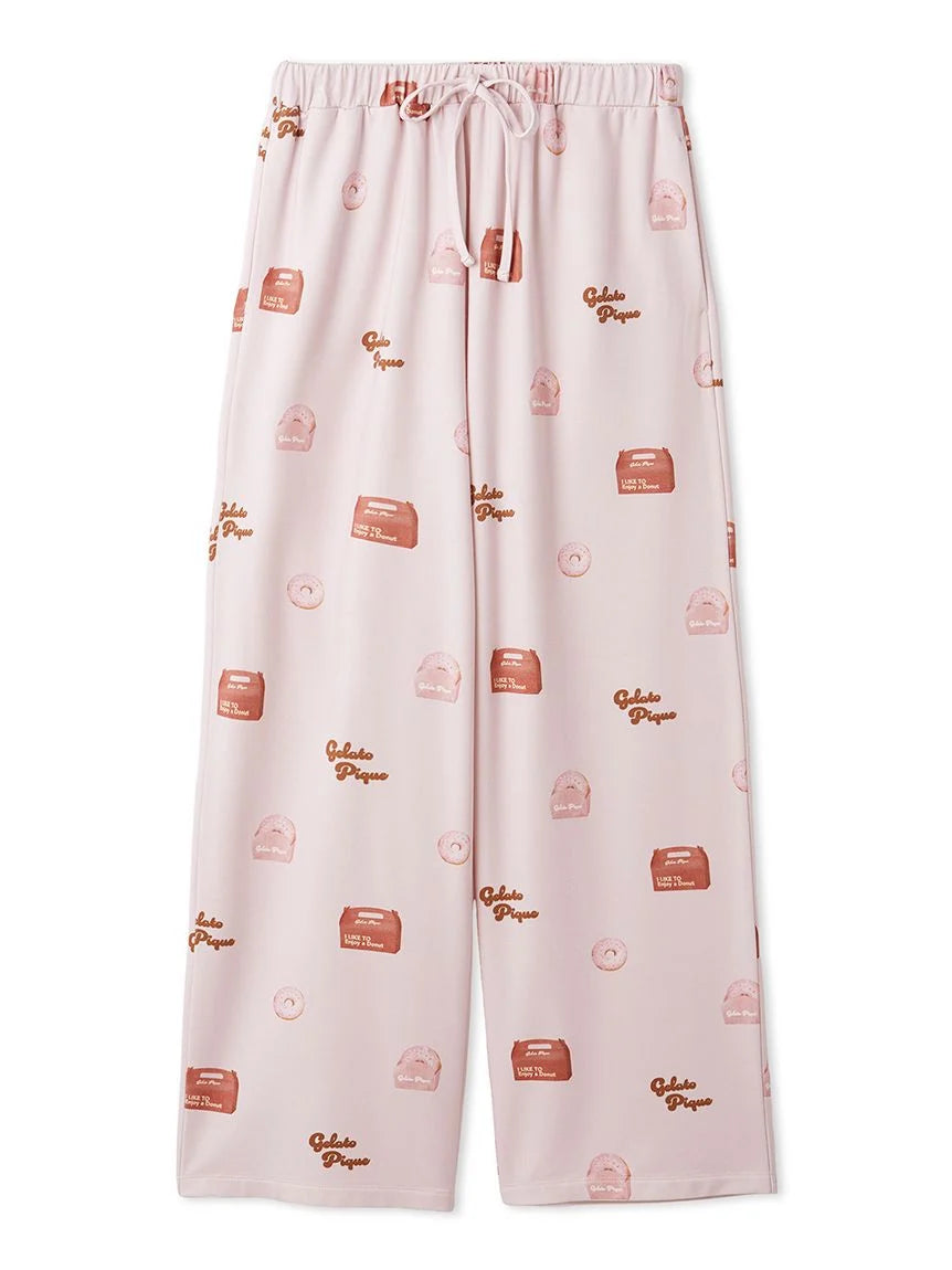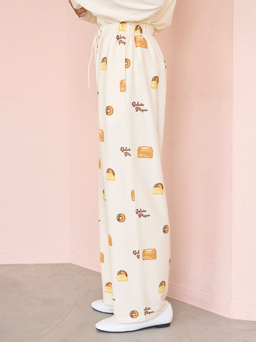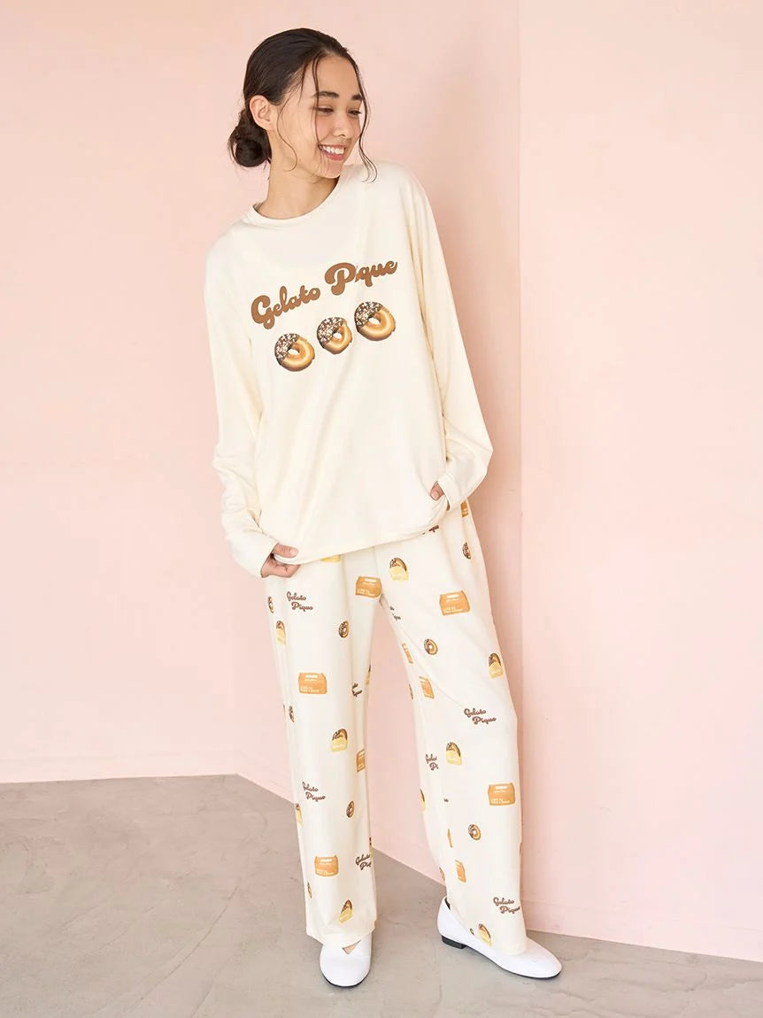 A sweet reward for a hard day's work. This cutely colored cut-and-sew series evokes the joy of donut time. These long pants feature a delicious all-over print that combines ring donuts, donut boxes, and the plump brand logo. They feature pockets on both sides and a basic straight silhouette perfect for everyday wear. Available in two colors: cream and pink. Each color features a different donut flavor. Pair them with the Donut One-point Long-sleeved T-shirt or other items from the same collection!