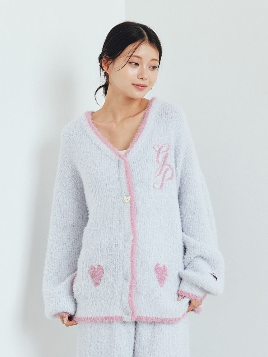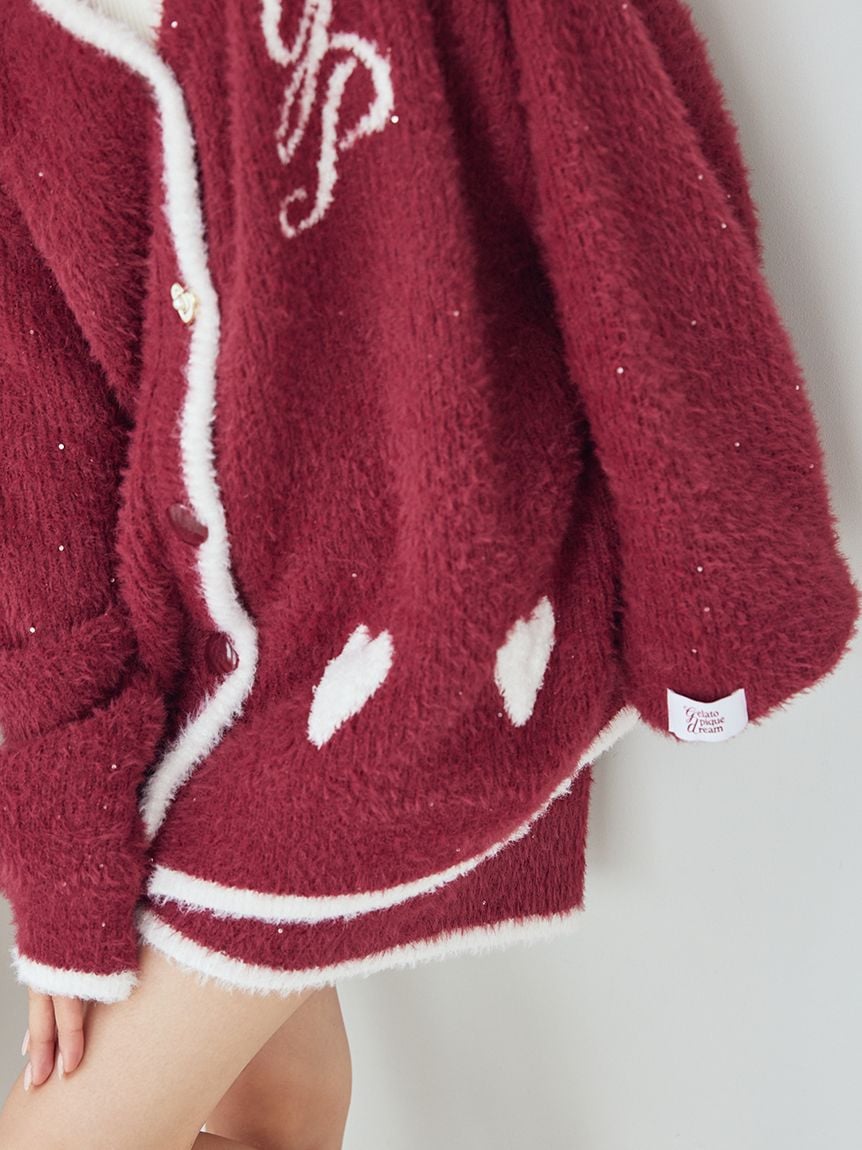 This feather knit series is filled with the joy of the holiday season, featuring snowflake-like glitter and sequins. This cardigan features a long, fluffy, and lightweight fabric, accented by a large logo jacquard on the back. The front features a heart and emblem logo, and the cuffs and hem feature color-coordinated designs for a cute look. The relaxing cut provides comfortable coverage around the waist. Available in three colorful colors: light blue, pink, and red, we recommend pairing this item with glittering feather shorts or pants releasing the same time.