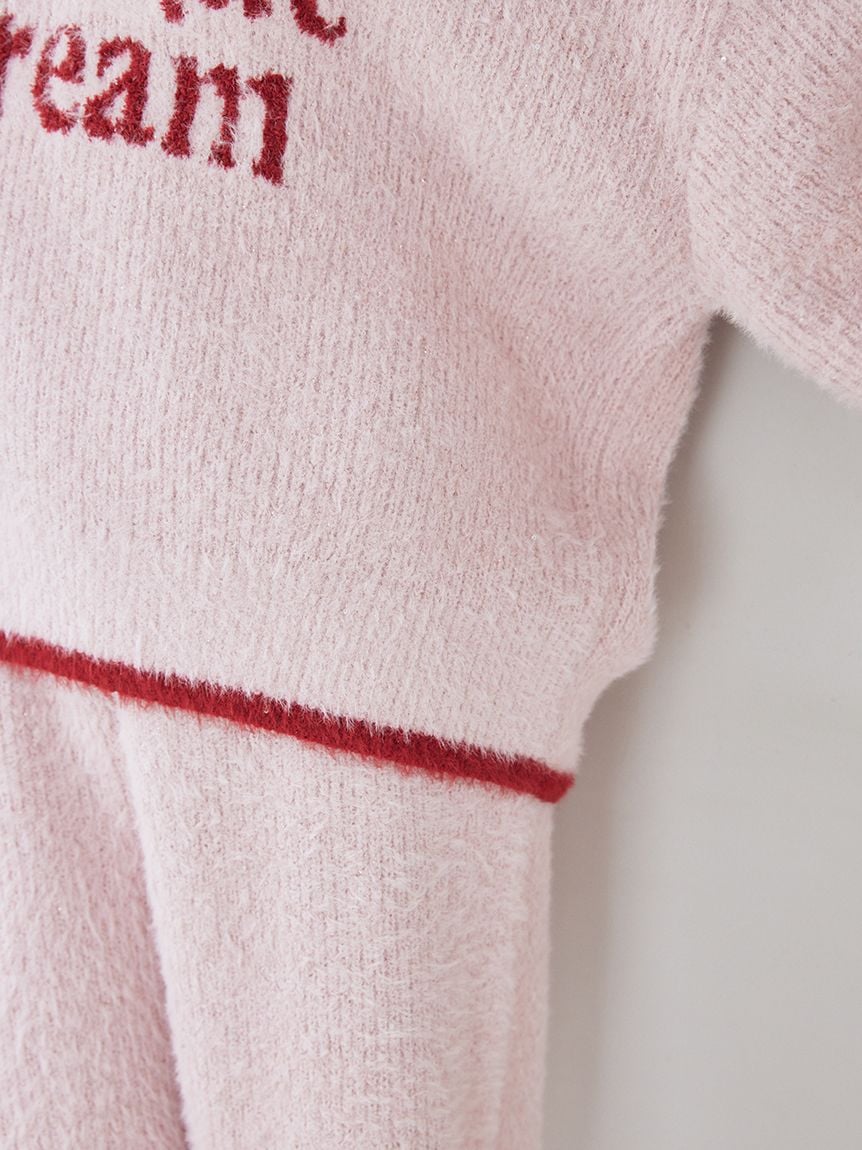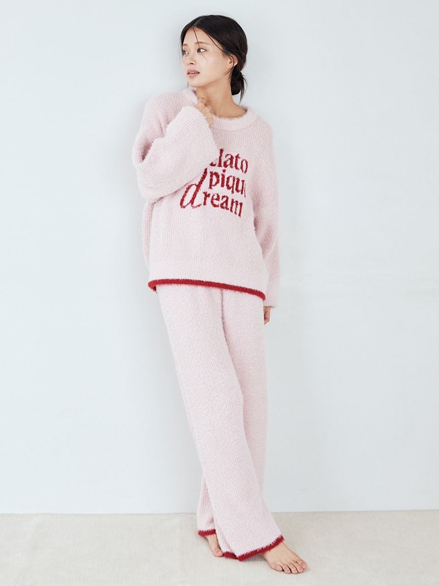 This feather knit series is filled with the joy of the holiday season, featuring snowflake-like glitter and sequins. This fluffy, light-weight pullover features a long pile and a large logo jacquard on the front. The moderate length and contrasting color designs on the cuffs and hem add a captivating accent. Available in three colorful colors: light blue, pink, and red, complete the look with shorts or long pants from the same collection.