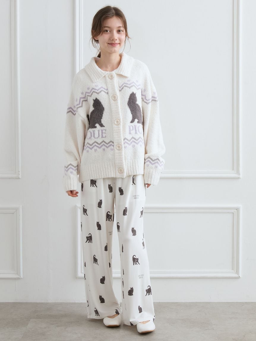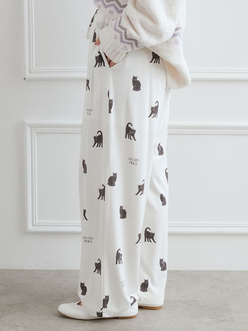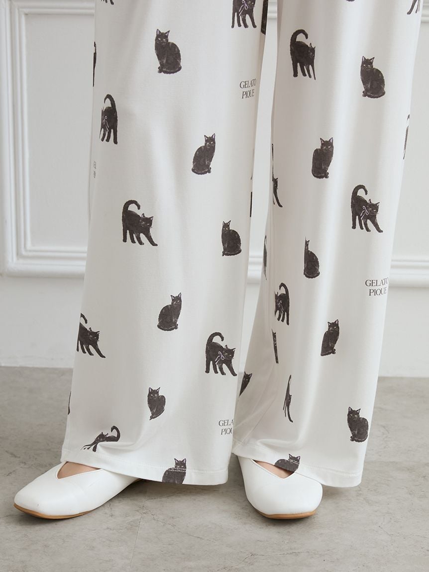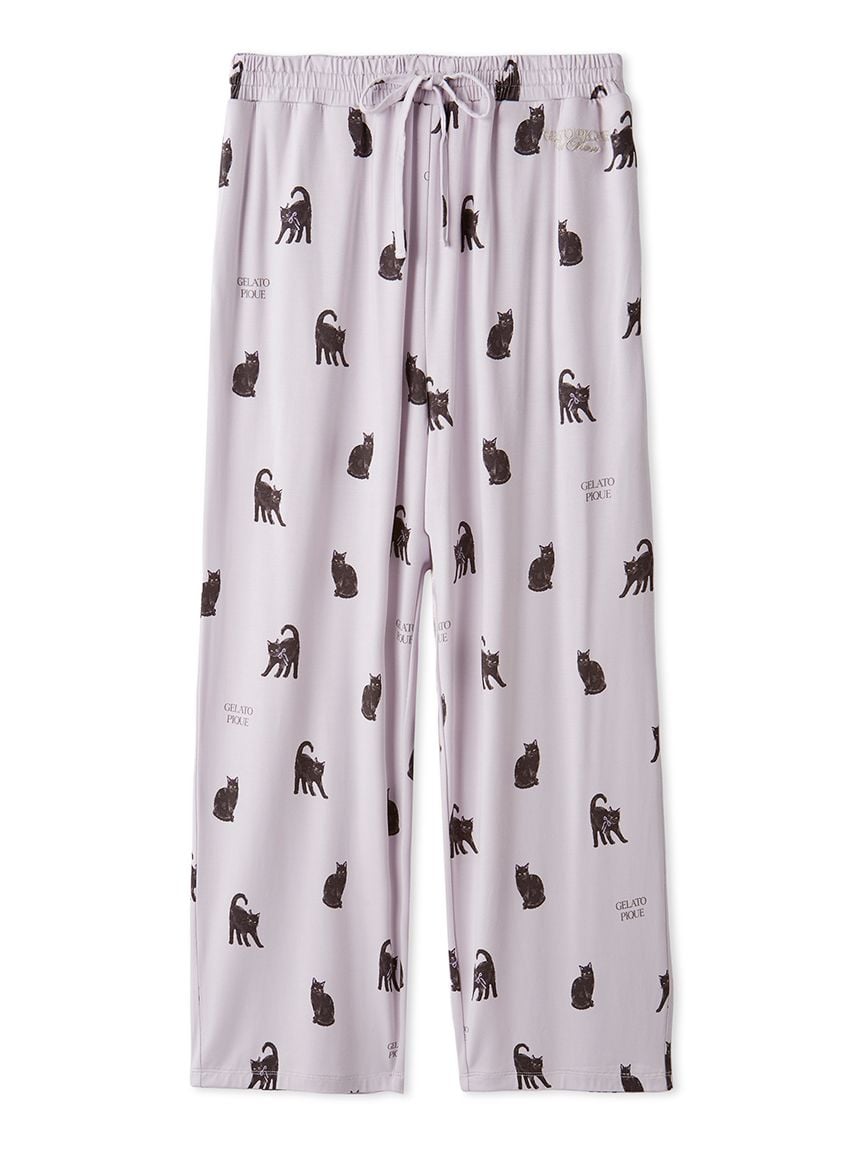 This year's HALLOWEEN COLLECTION features a feminine monotone style with a black cat theme. These long pants are made of soft knit fabric and feature an all-over print of expressive black cats, from sitting poses to menacing poses that all cat lovers will love. The purple cat ears add a Halloween touch. Sparkling silver embroidered logos on both sides and the left hip add a touch of glamour. Pair these pants with shirts, long-sleeved t-shirts, and knitwear from the same series.