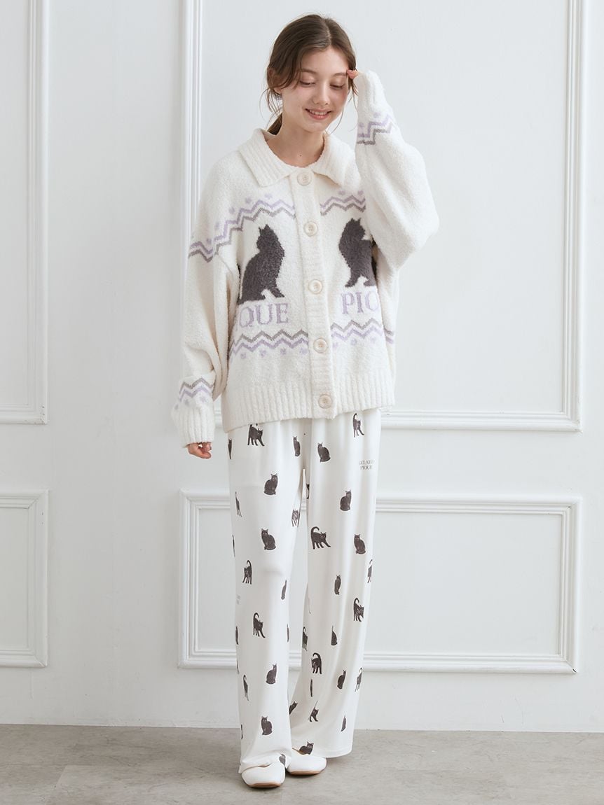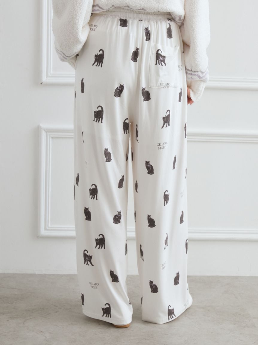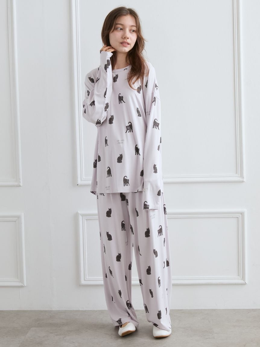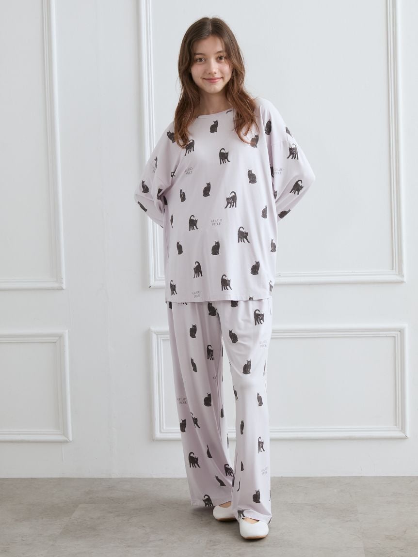 This year's HALLOWEEN COLLECTION features a feminine monotone style with a black cat theme. These long pants are made of soft knit fabric and feature an all-over print of expressive black cats, from sitting poses to menacing poses that all cat lovers will love. The purple cat ears add a Halloween touch. Sparkling silver embroidered logos on both sides and the left hip add a touch of glamour. Pair these pants with shirts, long-sleeved t-shirts, and knitwear from the same series.