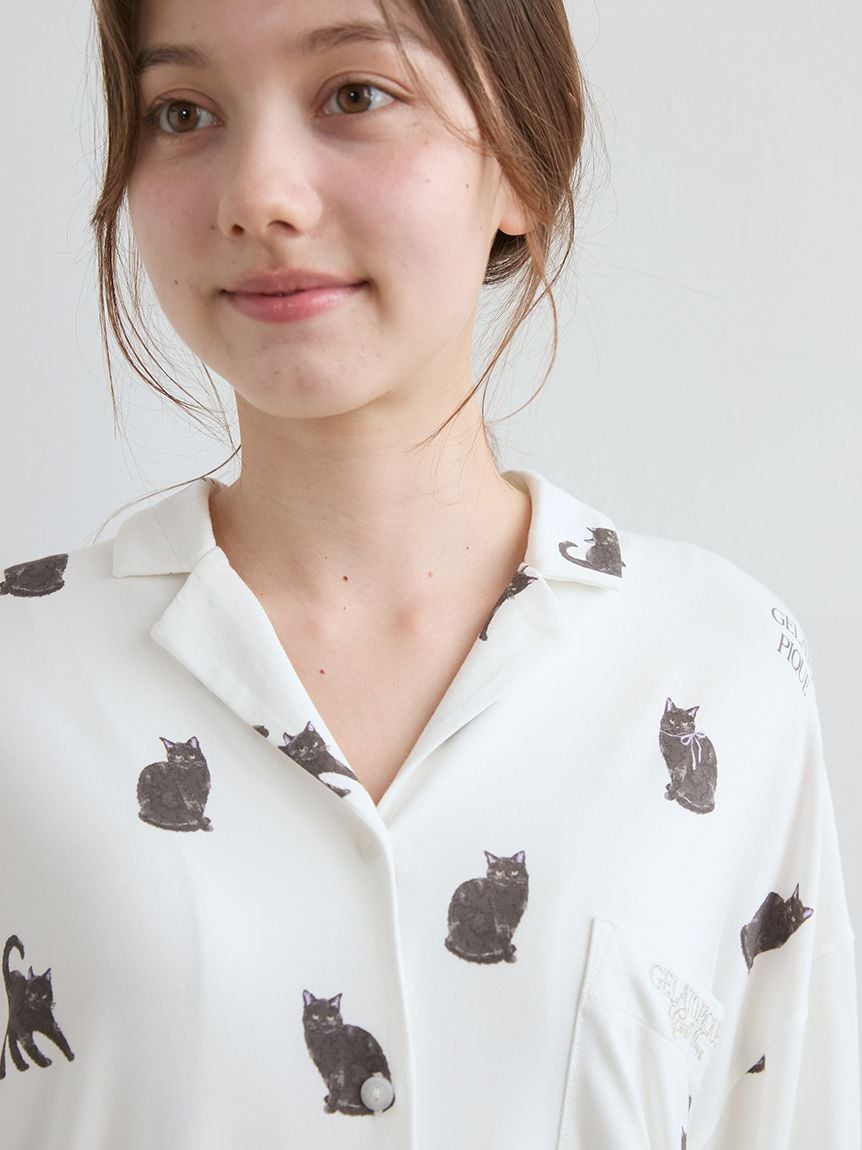 This year's HALLOWEEN COLLECTION features a feminine, monochromatic black cat theme. This soft cut-and-sew shirt features an all-over print of expressive black cats, from sitting poses to menacing poses that cat lovers will love. Purple cat ears add a Halloween touch. A sparkling silver embroidered logo is featured on the chest pocket. Pair this with the matching long pants and knitwear.