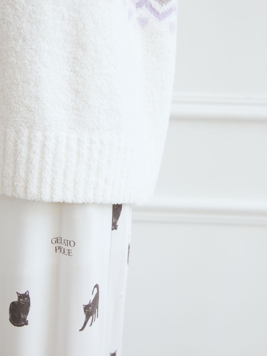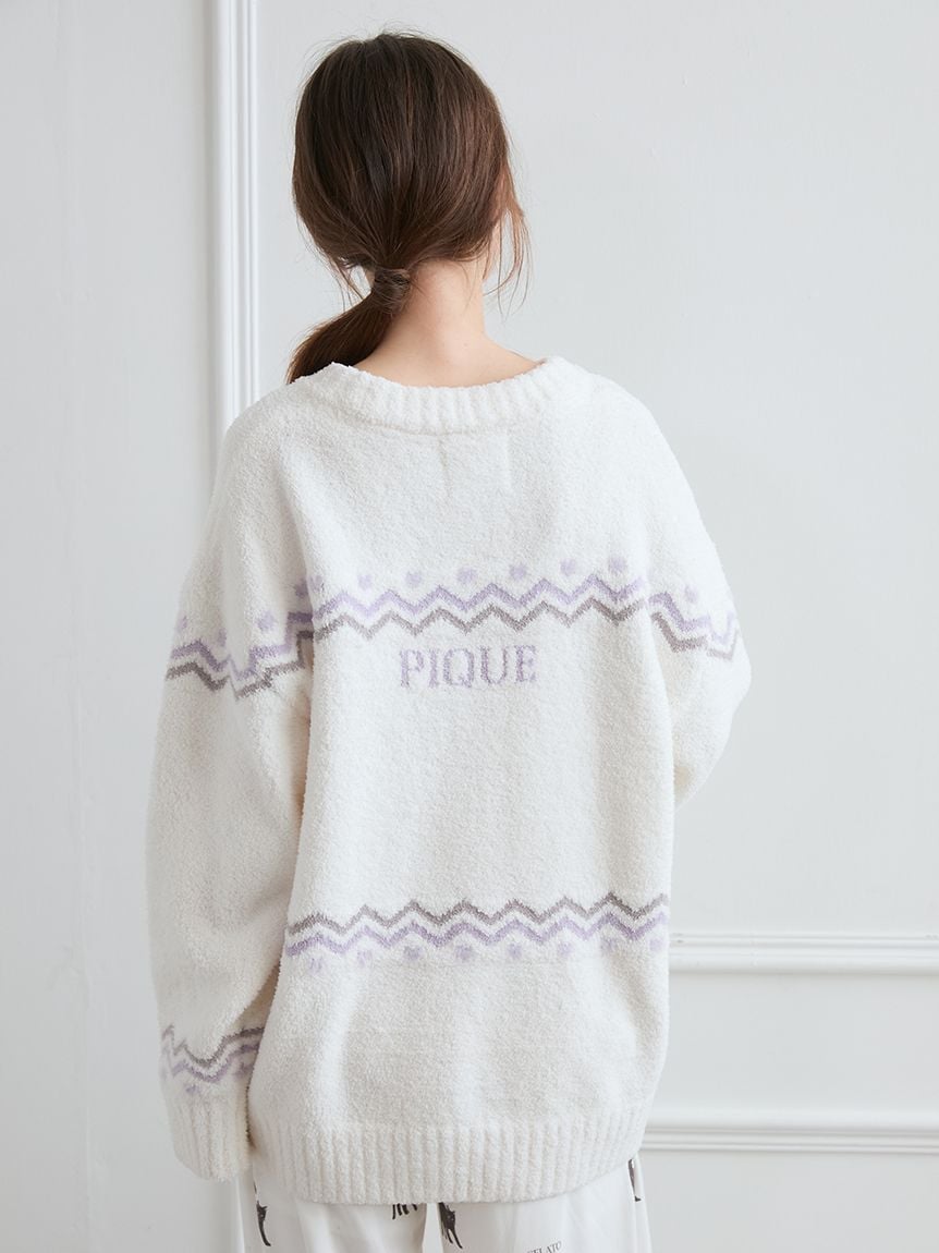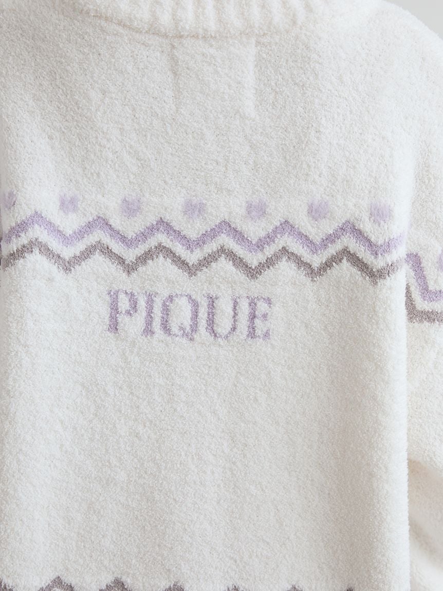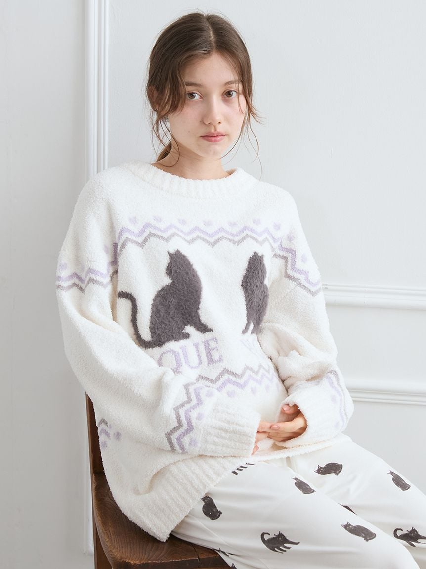 This year's HALLOWEEN COLLECTION features a feminine monotone style with a black cat motif. This jacquard pullover features a warm Nordic print, a furry black cat, a heart, and the PIQUE logo. The soft, fluffy knit fabric and relaxed silhouette create a feminine, cute look. Available in two colors: off-white with a touch of purple and a chic dark gray that doesn't look too heavy. Pair it with the shorts and tops in the same series.
