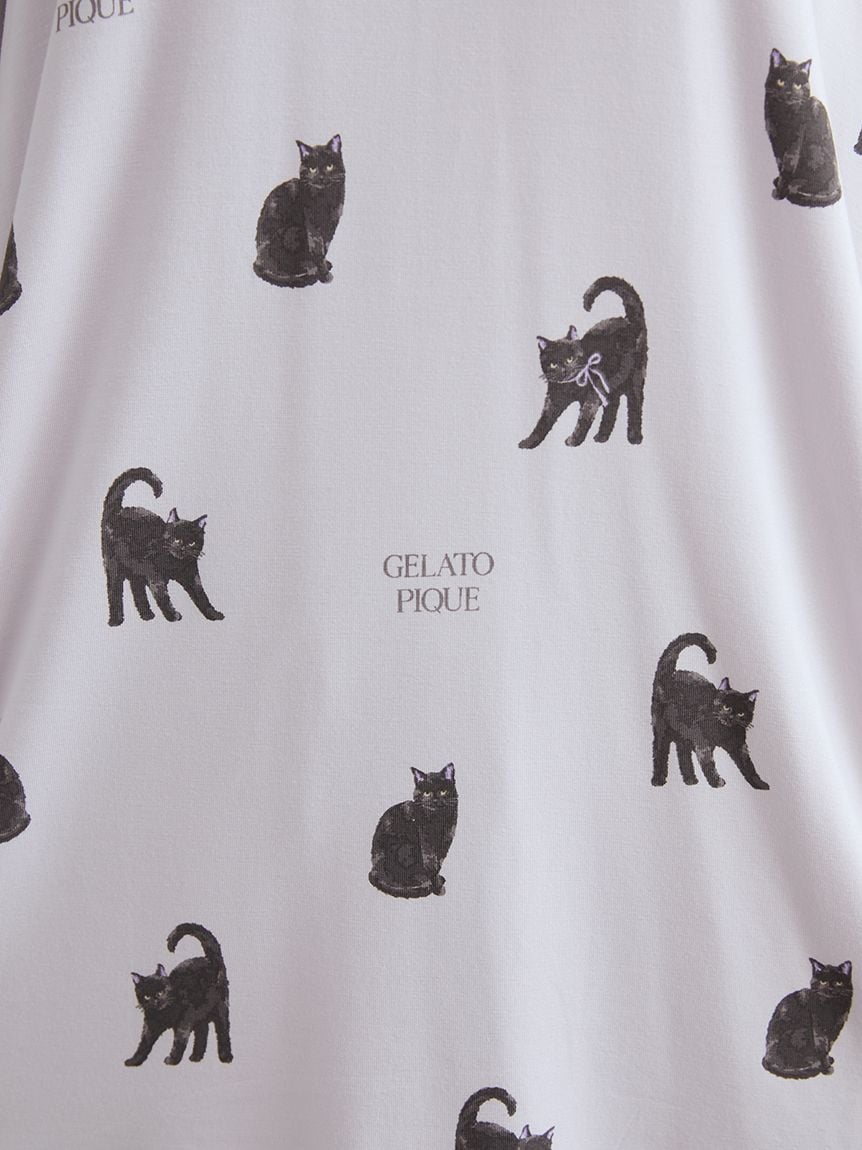 This year's HALLOWEEN COLLECTION features a feminine, monochromatic black cat theme. This soft-touch long-sleeved T-shirt features an all-over print of expressive black cats, from sitting poses to menacing poses that cat lovers will love. The cat's ears feature purple accents for a Halloween-inspired look. A sparkling silver embroidered logo is featured on the left cuff. Pair it with the matching long pants and knitwear.
