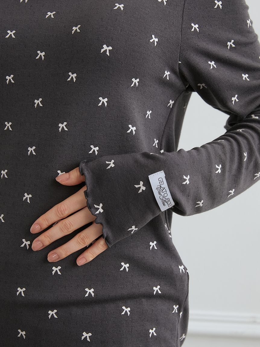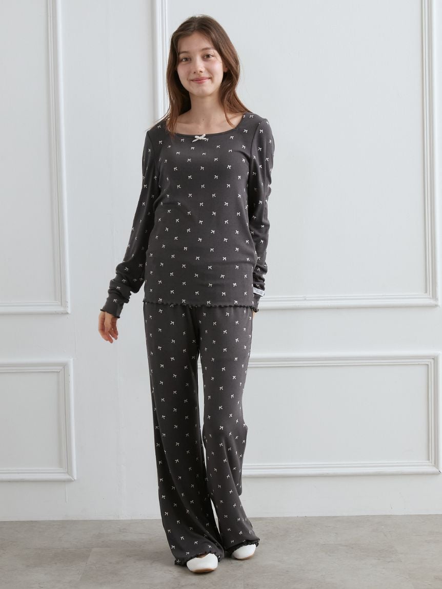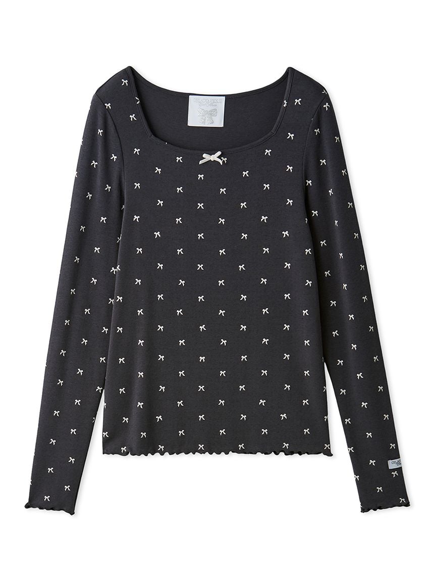 This year's HALLOWEEN COLLECTION features a feminine monotone style featuring the trendy ribbon pattern. This pullover features a soft, needle-punched top with a small, dotted ribbon print. The scalloped hem and cuffs, along with a small velvet ribbon at the elegant square-shaped chest, add a touch of style. This design can be worn on its own or as an inner layer under a dress. We recommend pairing it with the knit cardigan and long pants from the same series.