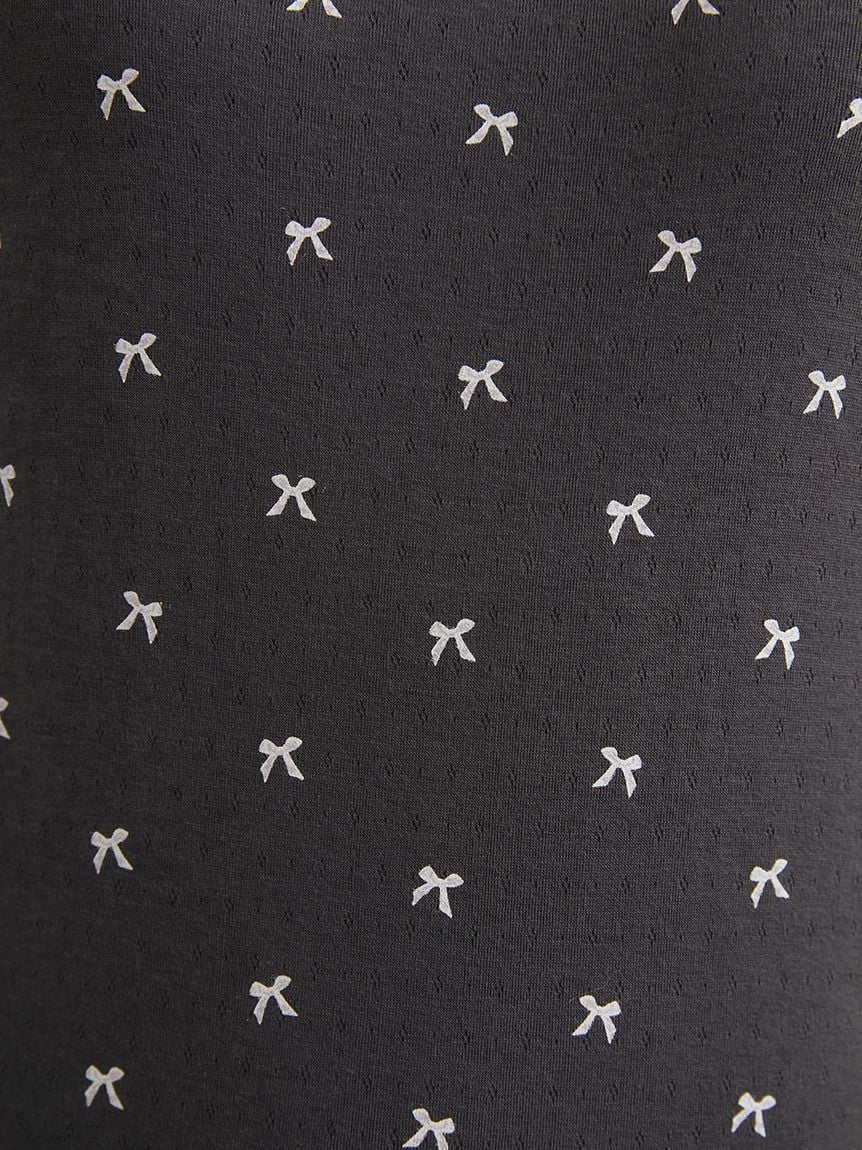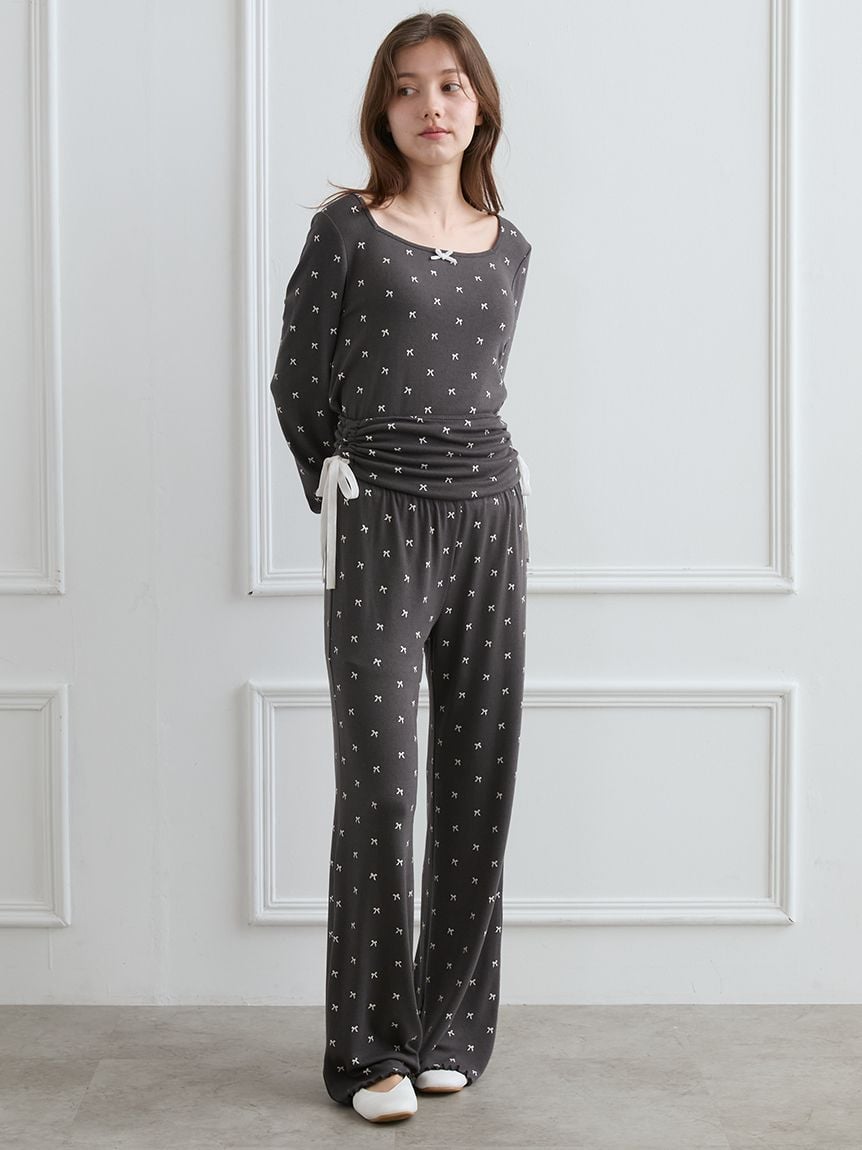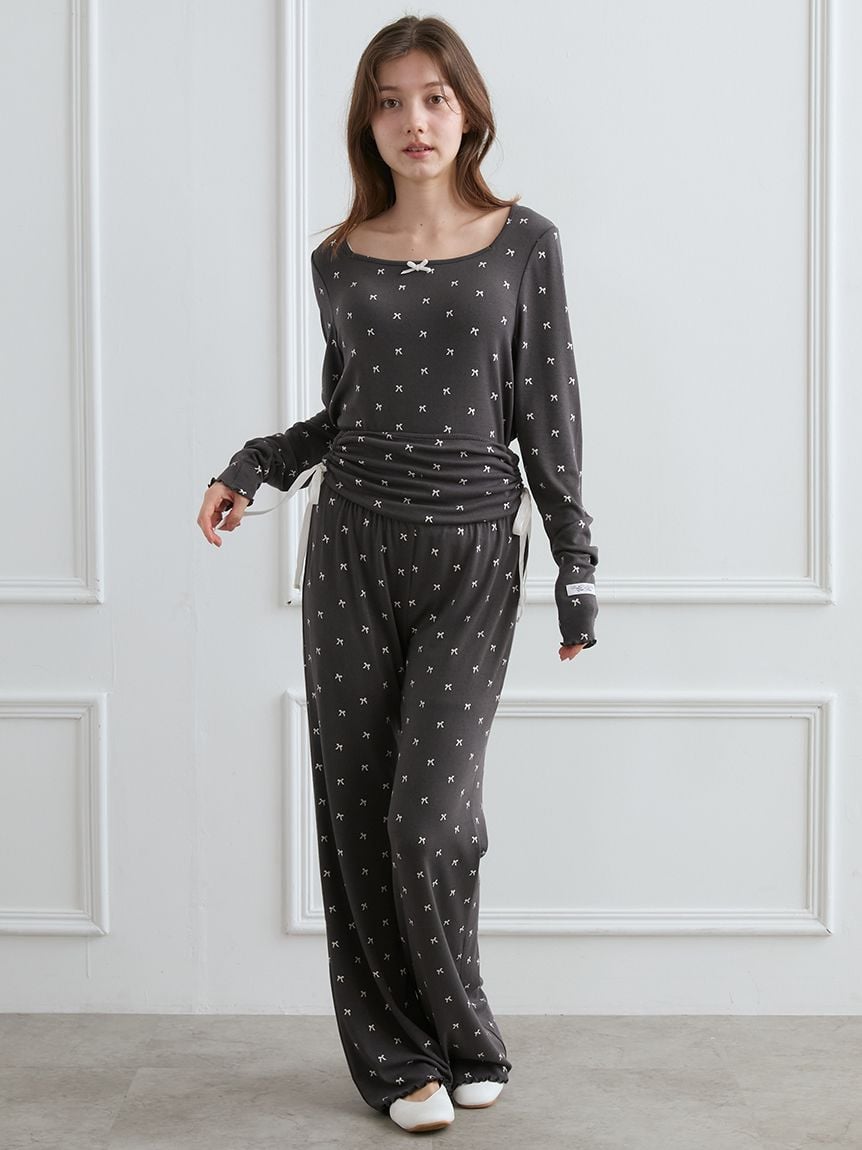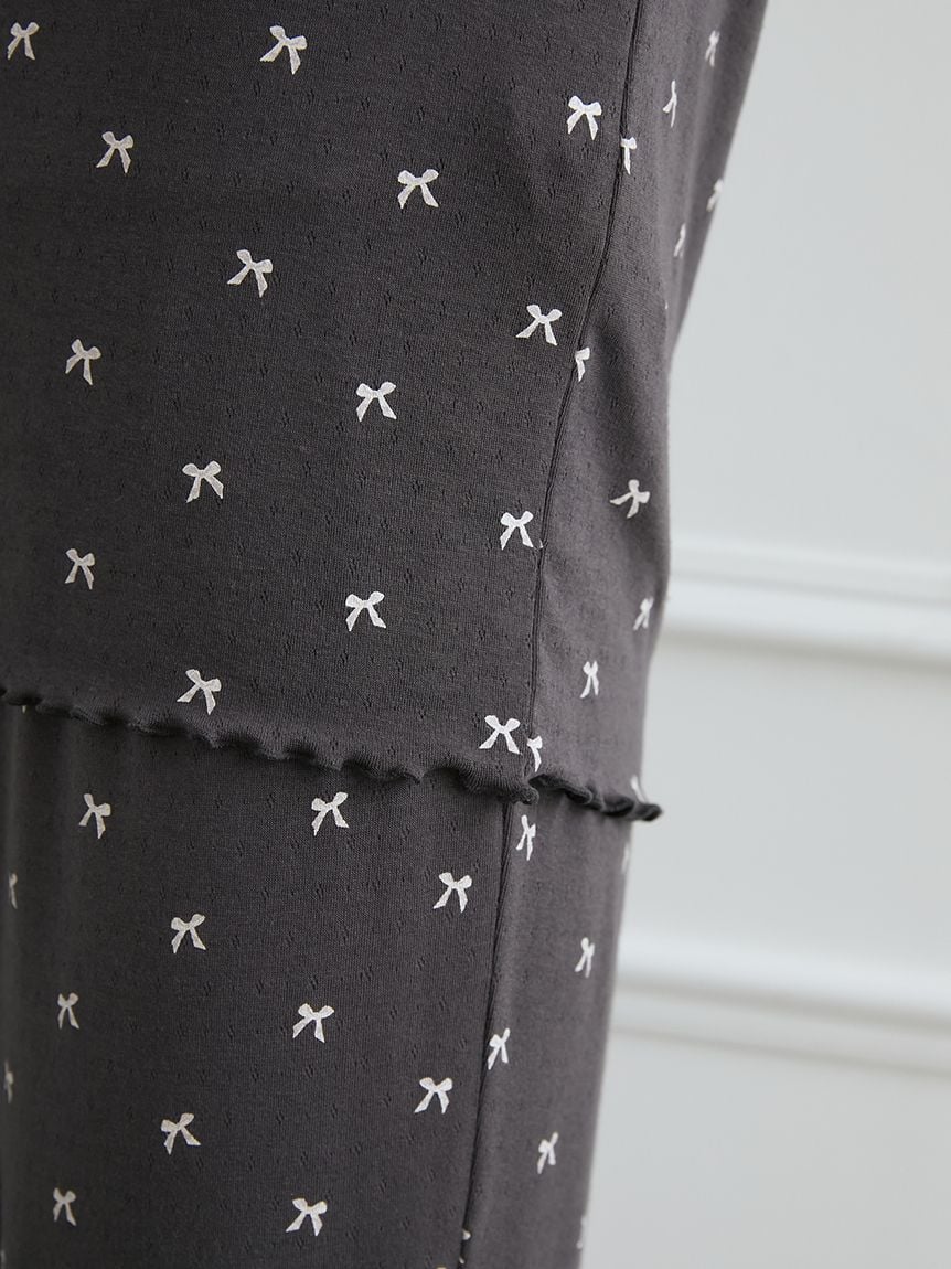 This year's HALLOWEEN COLLECTION features a feminine monotone style featuring the trendy ribbon pattern. This pullover features a soft, needle-punched top with a small, dotted ribbon print. The scalloped hem and cuffs, along with a small velvet ribbon at the elegant square-shaped chest, add a touch of style. This design can be worn on its own or as an inner layer under a dress. We recommend pairing it with the knit cardigan and long pants from the same series.