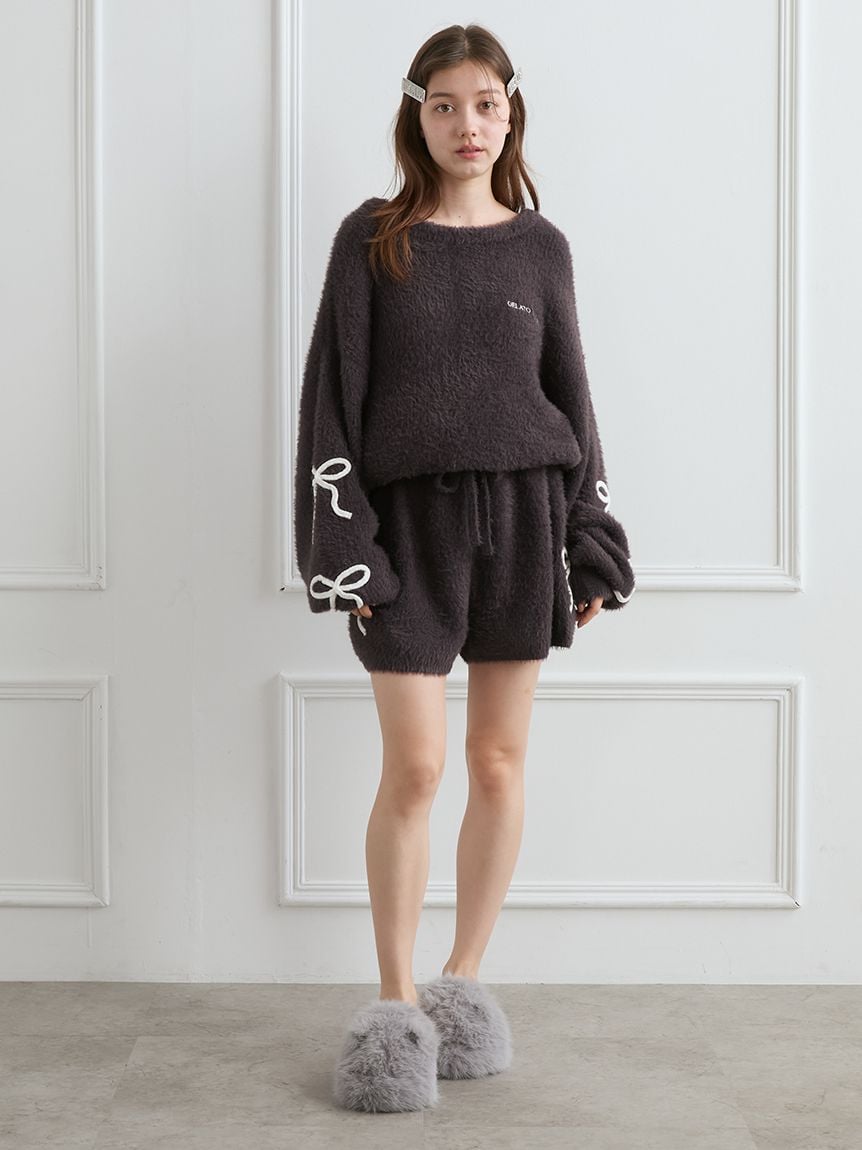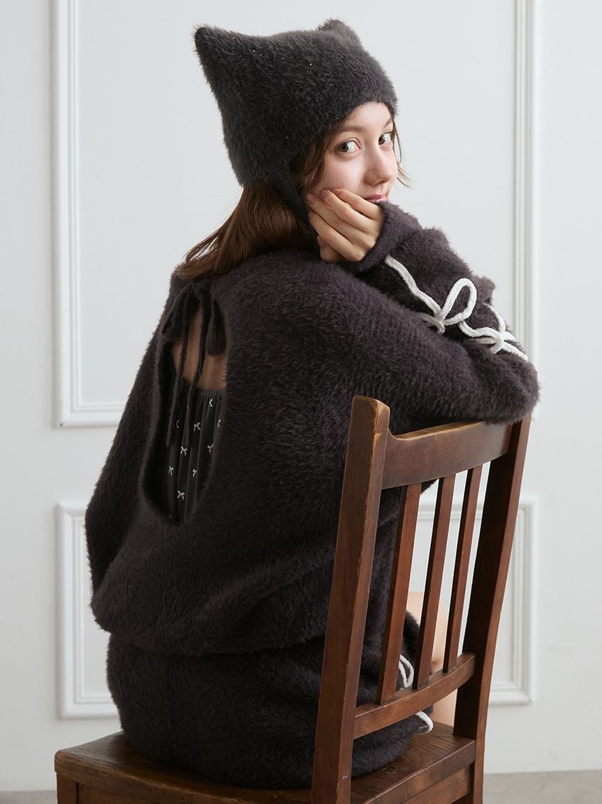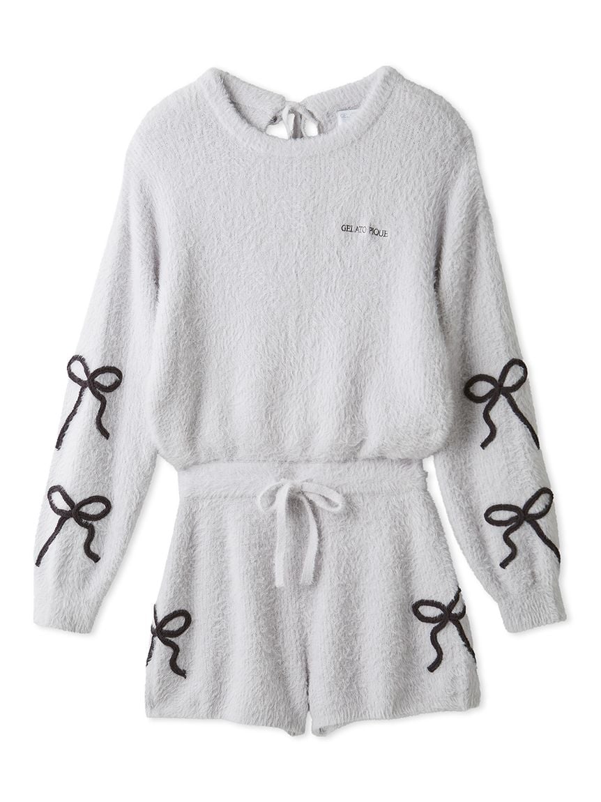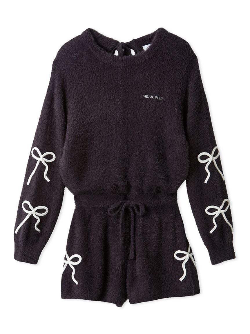 This year's HALLOWEEN COLLECTION features a feminine monotone style featuring trendy ribbon patterns. This romper features a feather-light feather knit with a sewn-on puffy, three-dimensional ribbon. The wide opening at the back with a tie makes it easy to put on and take off, and it's a cute, one-piece design. The brand logo is subtly embroidered on the left chest. We recommend pairing it with the cat ear balaclava and leg warmers from the same series.