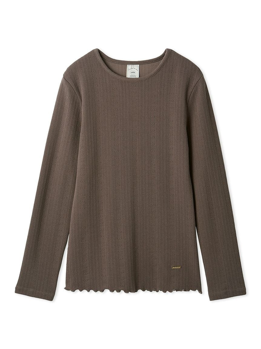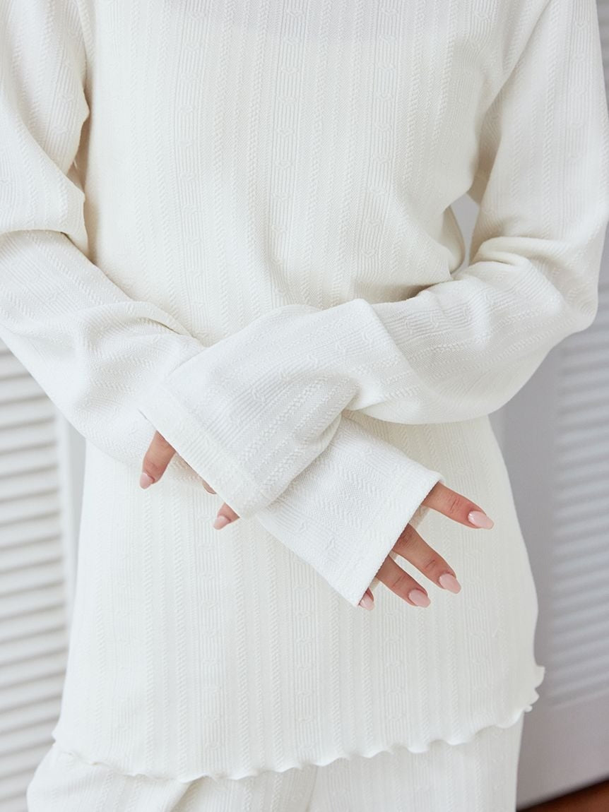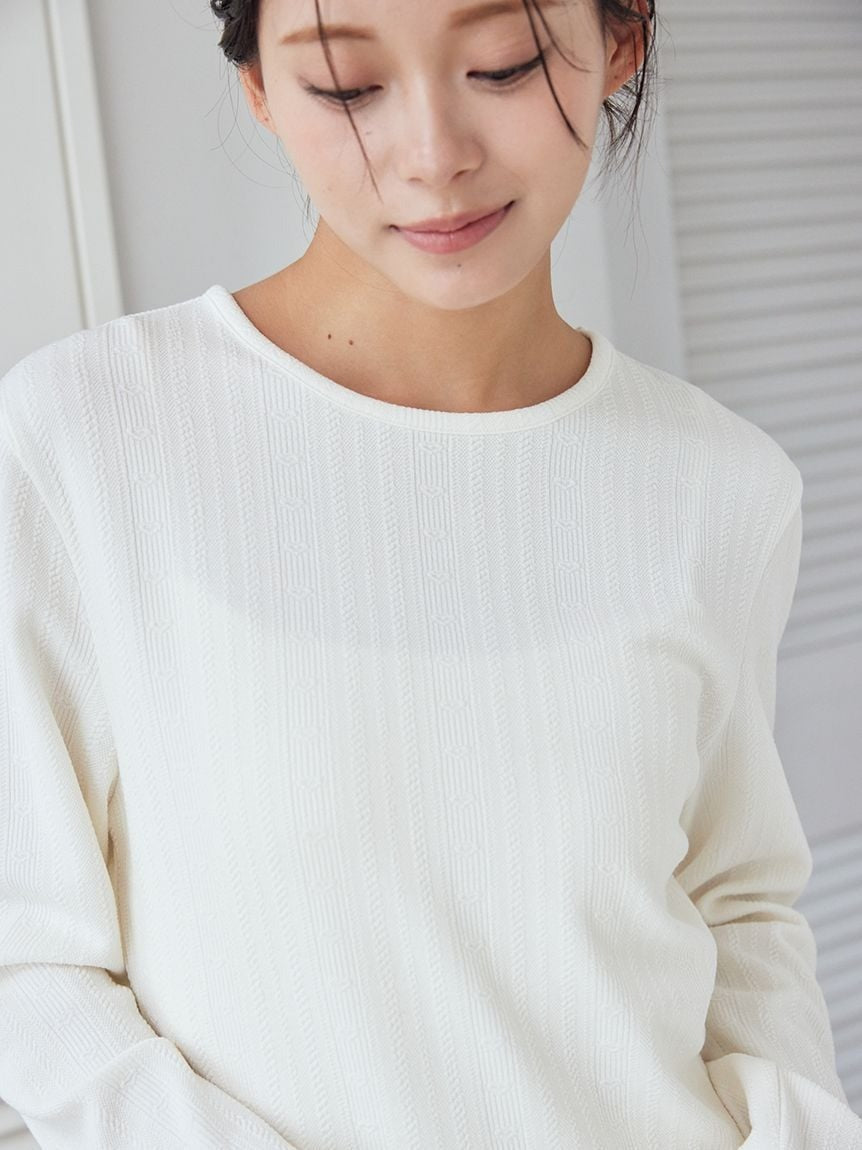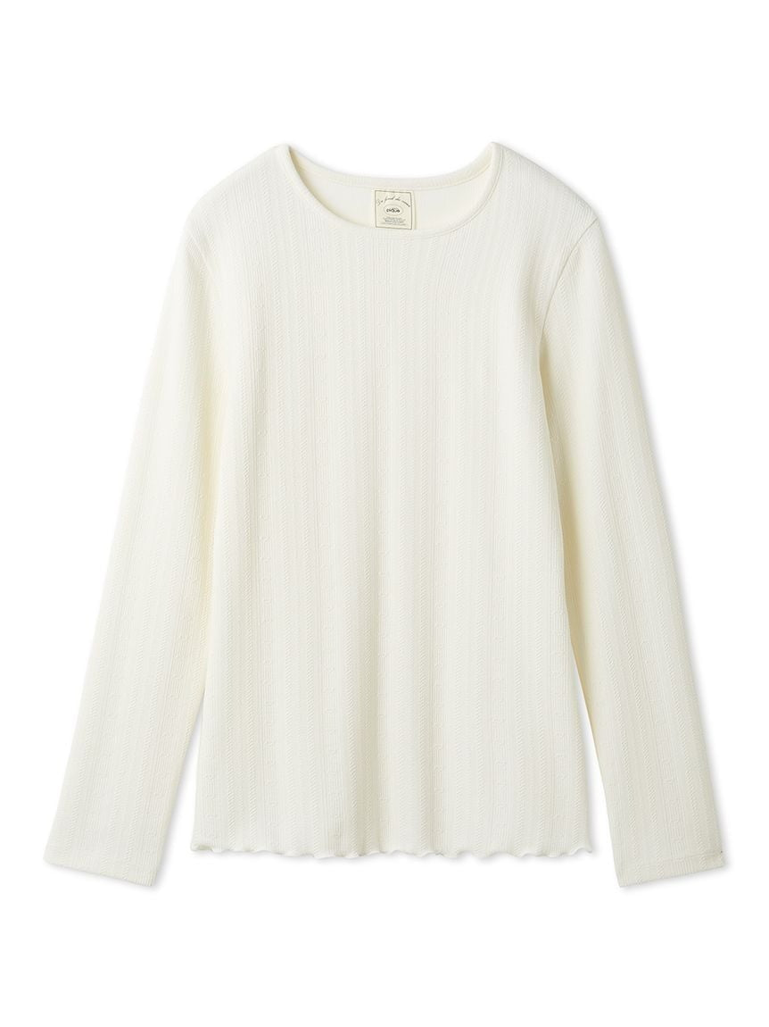 This cut-and-sew series features a small heart-shaped Aran pattern in puffed jacquard. This simple, stretchy pullover is perfect as an inner layer during chilly weather. The silhouette is streamlined, but the long sleeves and length provide ample coverage for a secure fit. It can be layered over a hoodie or cardigan for a versatile look. The gold plate, a common feature of the series, adds a subtle accent. Available in two colors: cream and brown. Pair it with bottoms from the same series or coordinate it with the heart-pattern knit series being released at the same time.