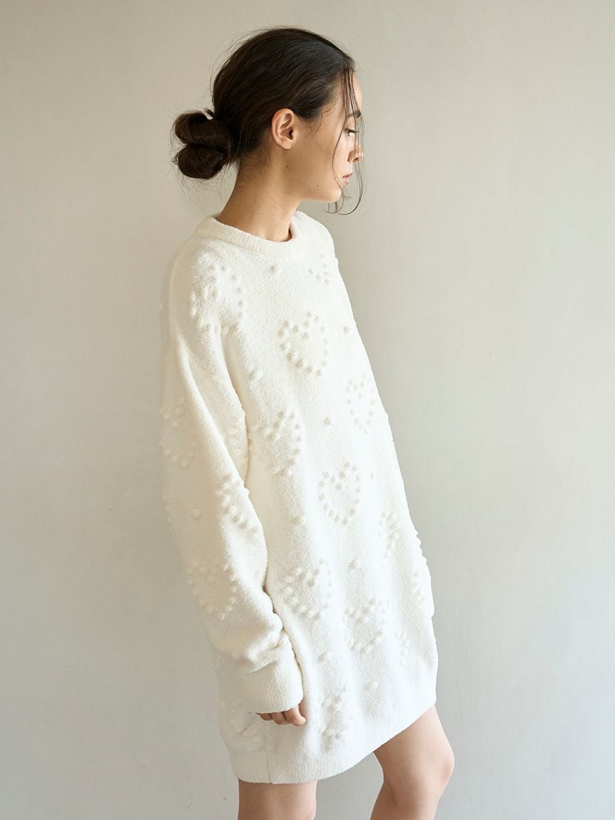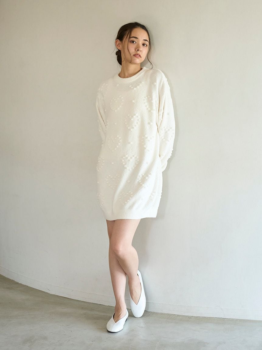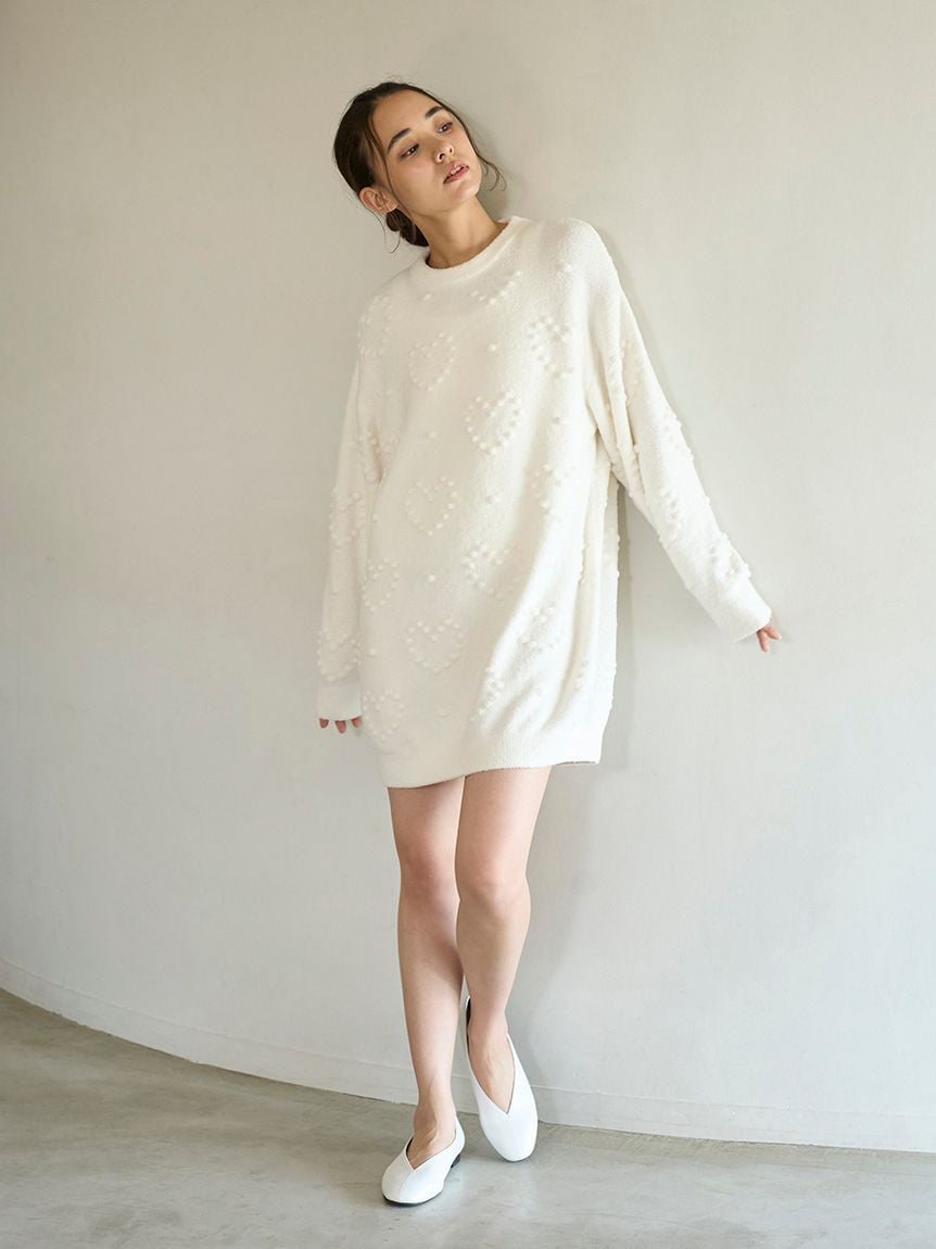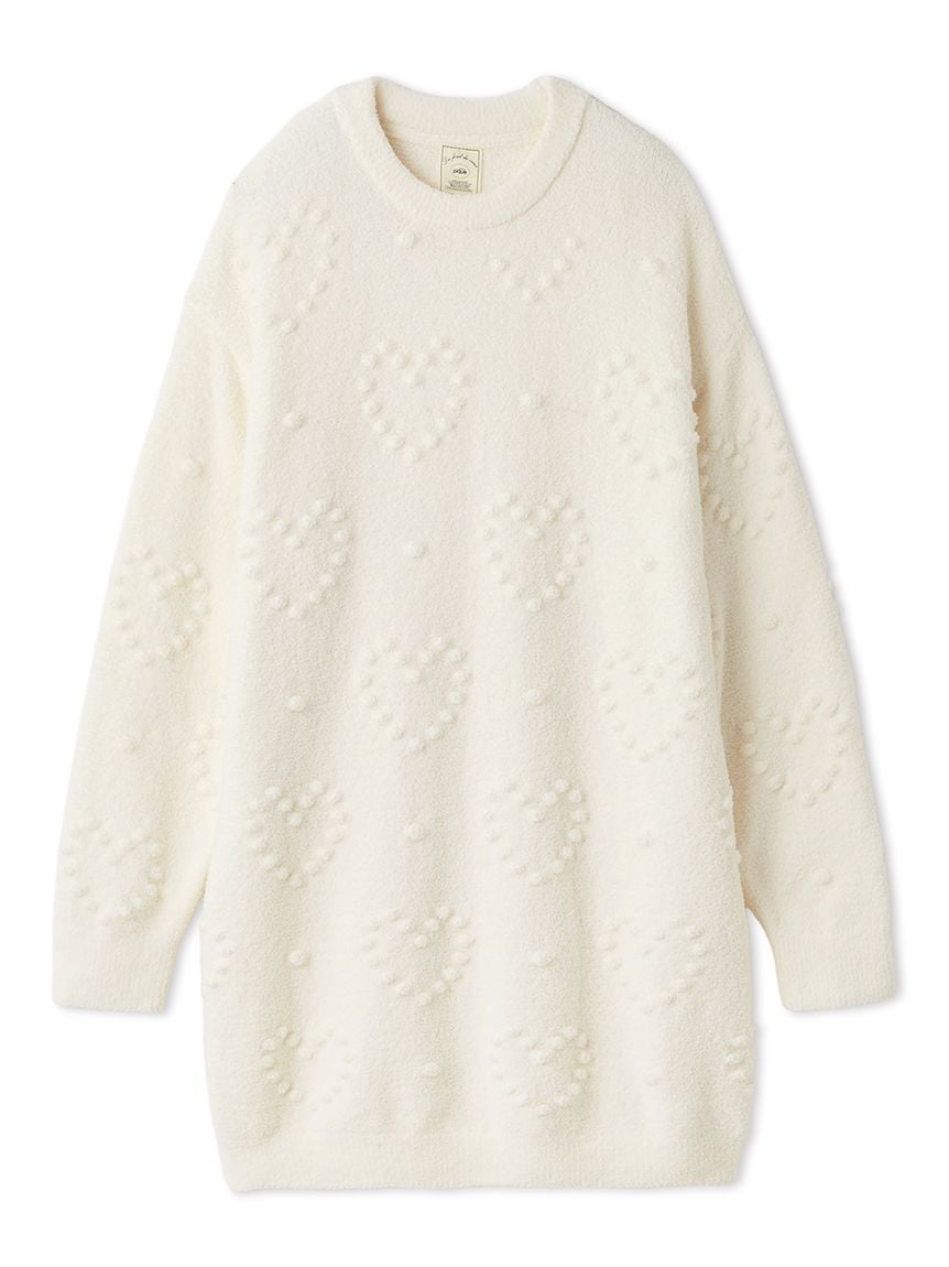 This knit series features a warm texture, featuring a heart pattern made of dimpled, rounded knit stitches. The slightly cropped length of this dress creates a stylish silhouette, balanced by voluminous sleeves. The simple color scheme makes it versatile and versatile, pairing it with your favorite leggings and bottoms. Available in two colors: natural cream and pale blue.