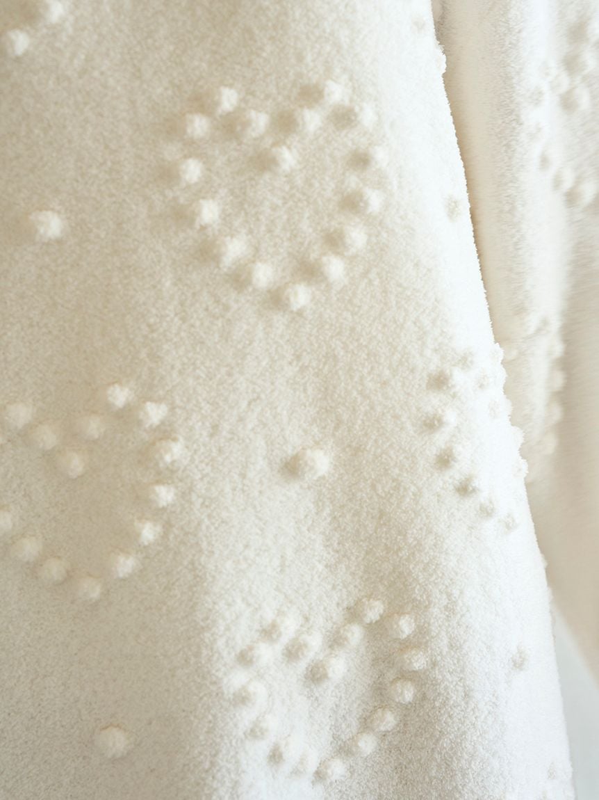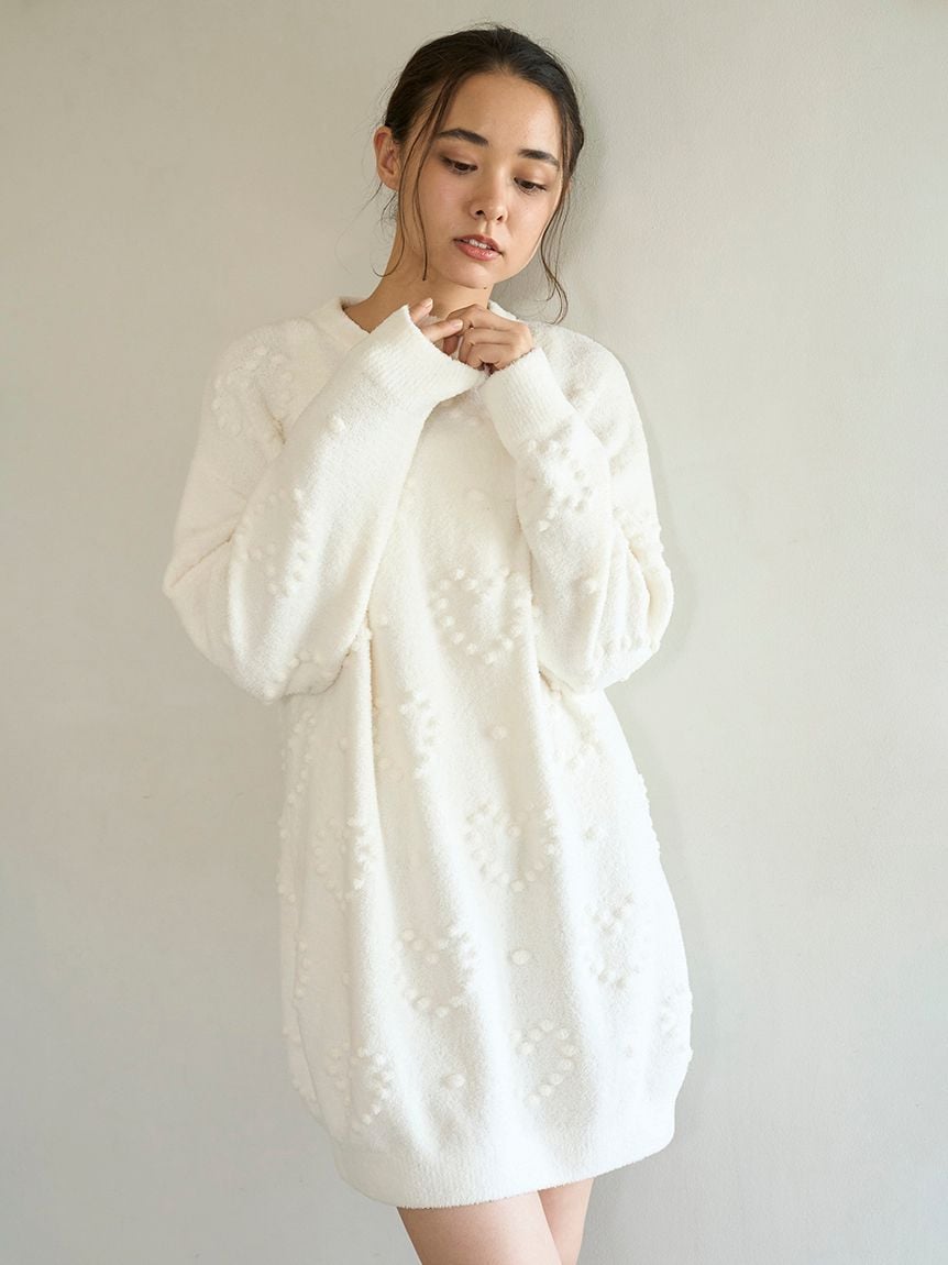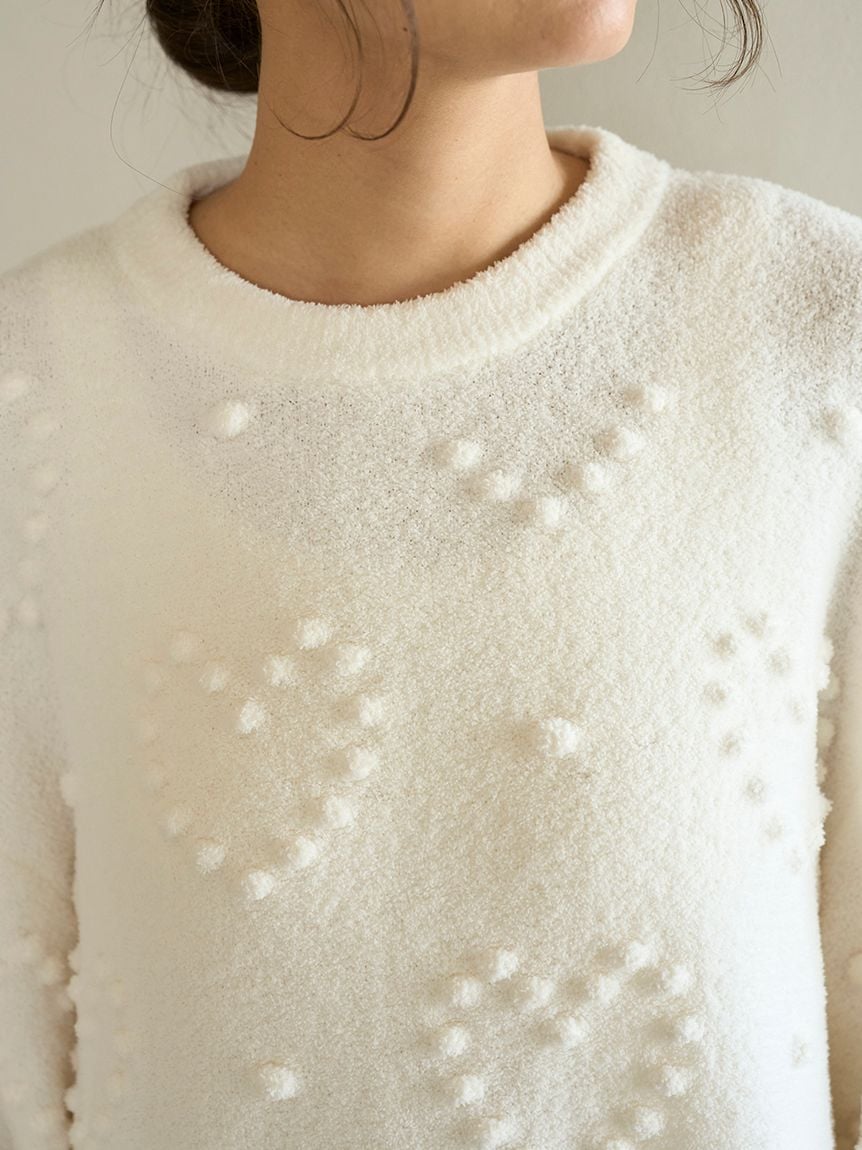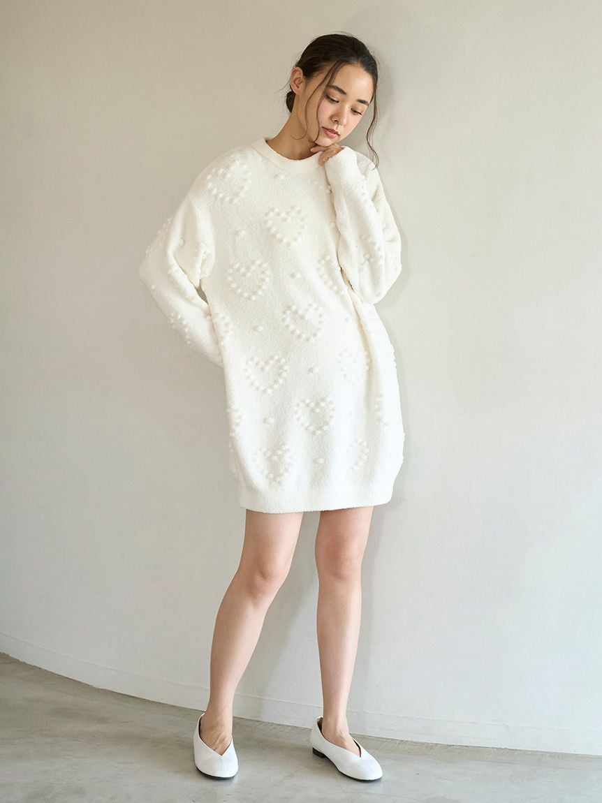 This knit series features a warm texture, featuring a heart pattern made of dimpled, rounded knit stitches. The slightly cropped length of this dress creates a stylish silhouette, balanced by voluminous sleeves. The simple color scheme makes it versatile and versatile, pairing it with your favorite leggings and bottoms. Available in two colors: natural cream and pale blue.