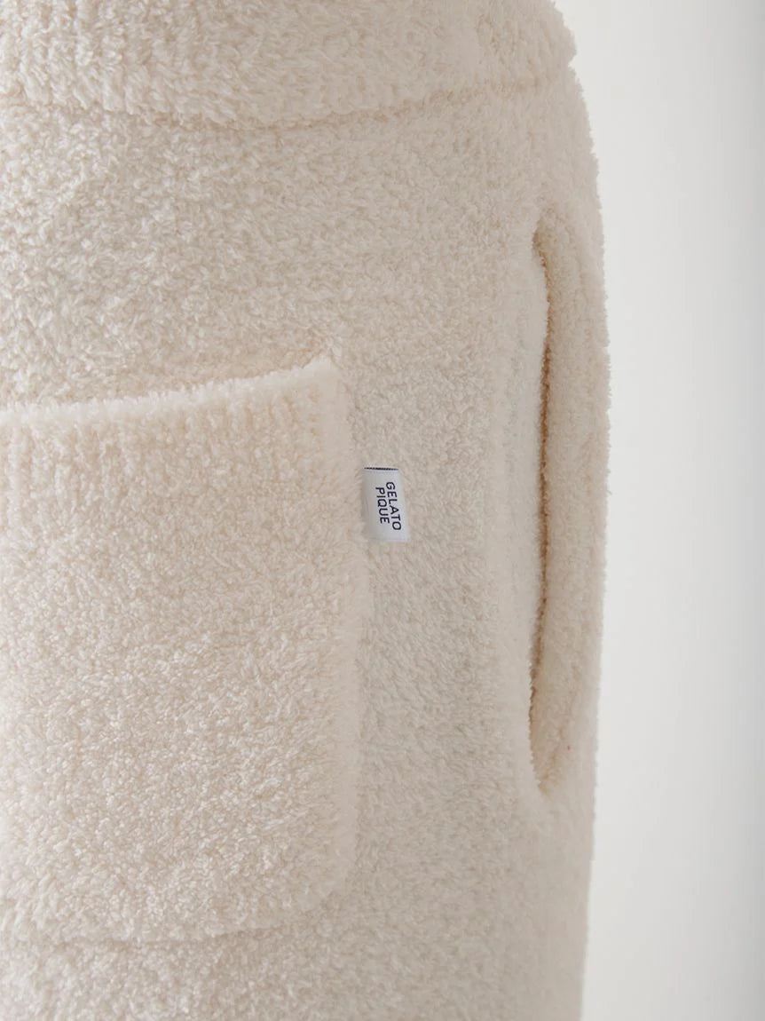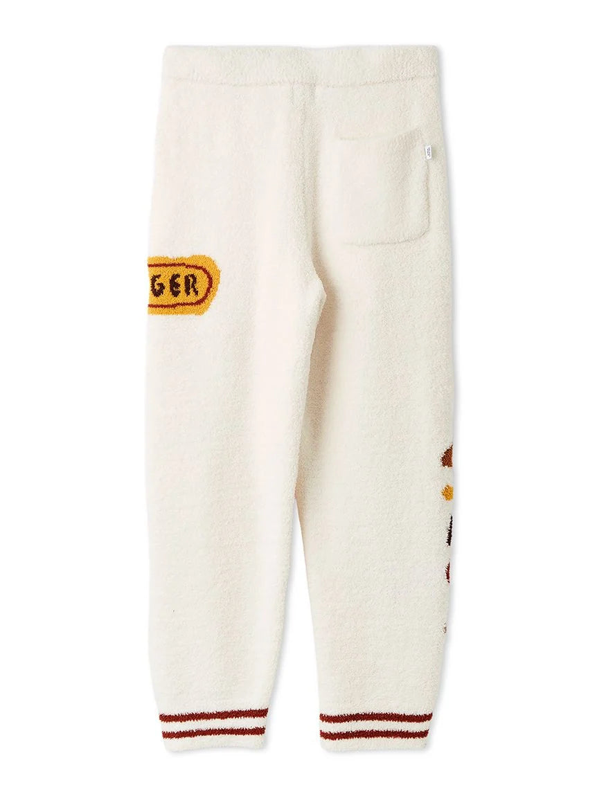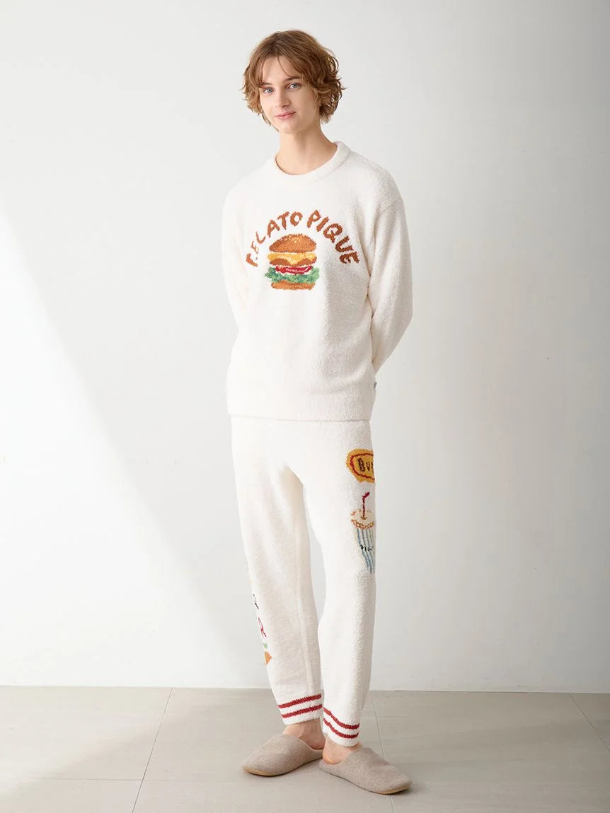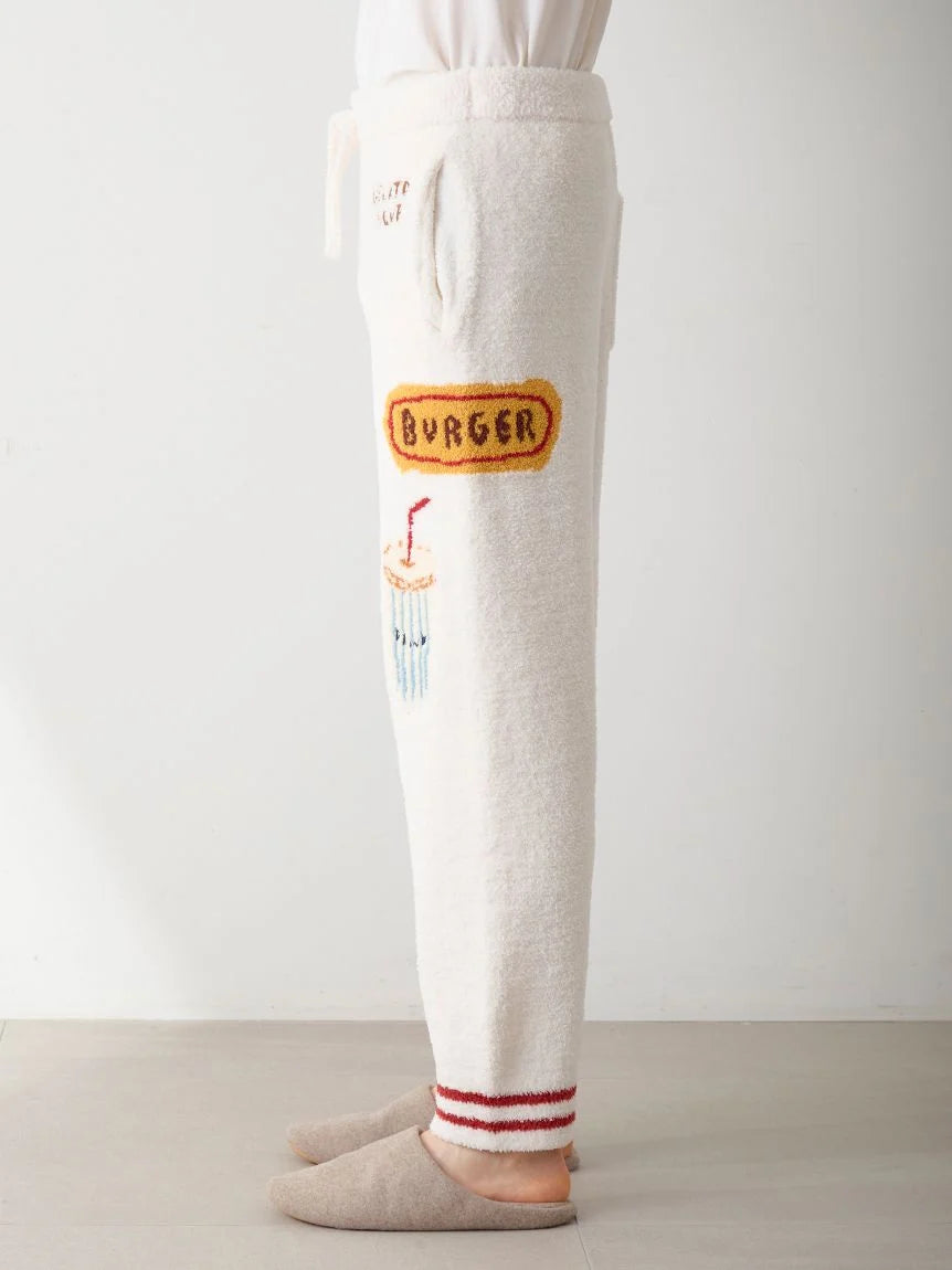 This new collaboration series, featuring original illustrations by illustrator Hirano Toshiyuki, is inspired by delicious burgers that everyone loves. These long pants are made from a light and airy "powder" material, featuring a colorful hamburger print and logo jacquard. Pockets are also included on both sides and the back right. Available in two colors: ivory and navy, we recommend burger lovers to pair this item with the pullover or blouson from the same collection.