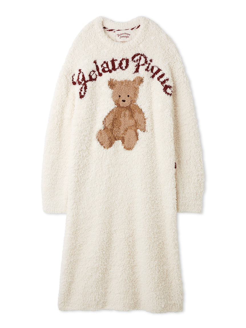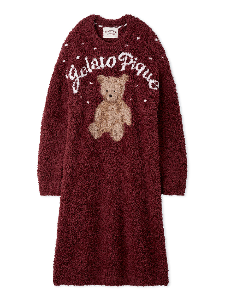 This Snow Bear series dress is perfect for staying cozy with family, friends, or someone special during the warm holiday season. It features a relaxing cut crafted with the long-pile ‘Gelato’ fabric. The front features a sitting bear and swirling snowflakes rendered in jacquard. The eye-catching logo jacquard extending all the way to the shoulders, when a subtle candy cane pattern adds seasonal flair at the collar. Available in two colors: Ivory, and Red, this cute dress will be your favorite loungewear item for the winter.
