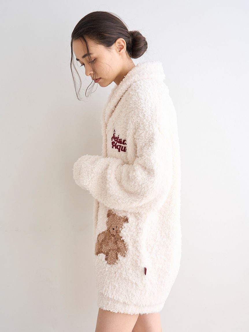 This Snow Bear series shawl cardigan is perfect for enjoying quality time with family, friends, or someone special during the holiday season. Crafted from long-pile ‘Gelato’ fabric, its relaxed silhouette gently wraps around you up to the neck. The front features a jacquard print of facing bears and a sagara embroidered logo on the chest. The subtle candy cane pattern inside the collar adds a charming touch. Pair it with bottoms or accessories from the same collection, or share it as a perfect holiday gift.