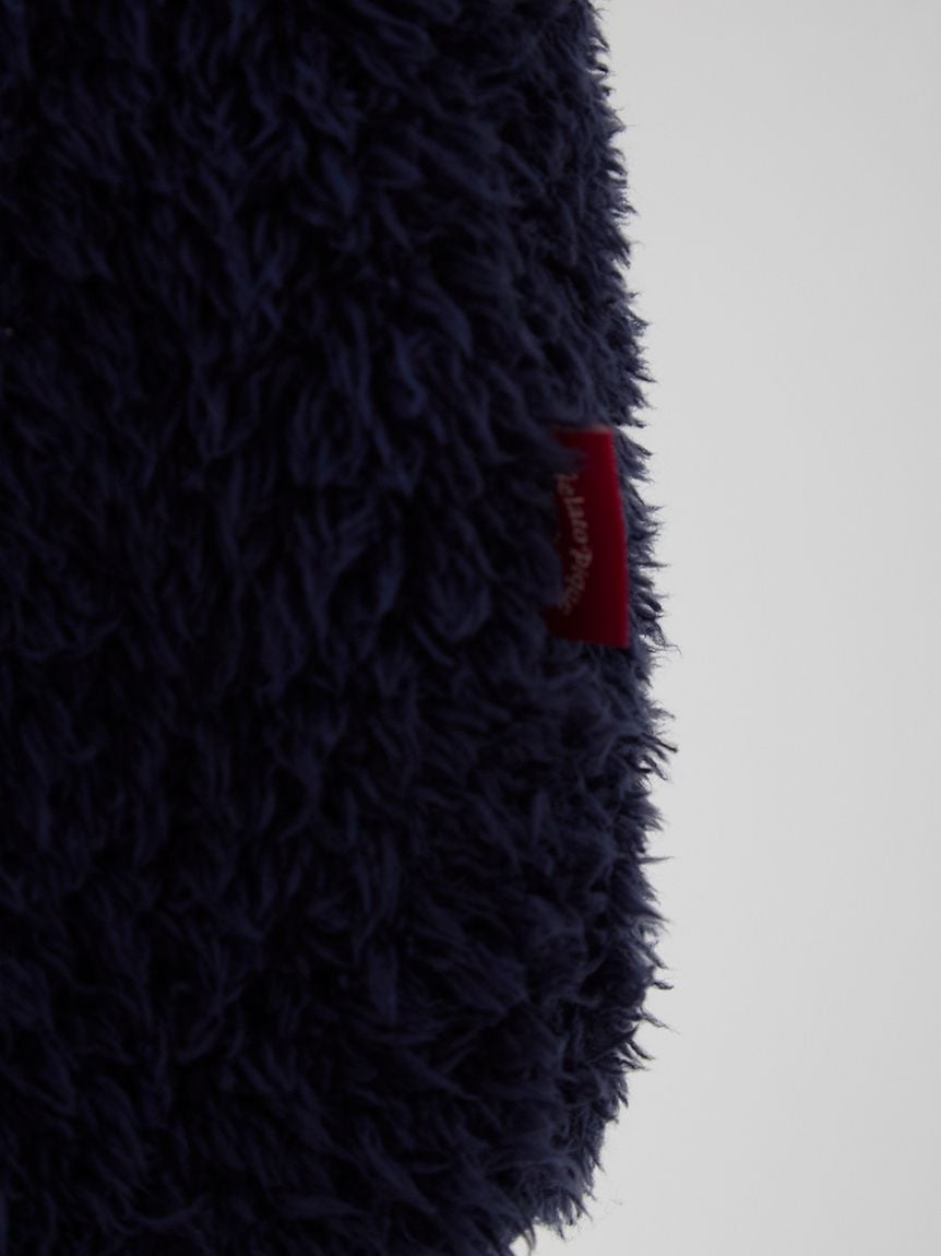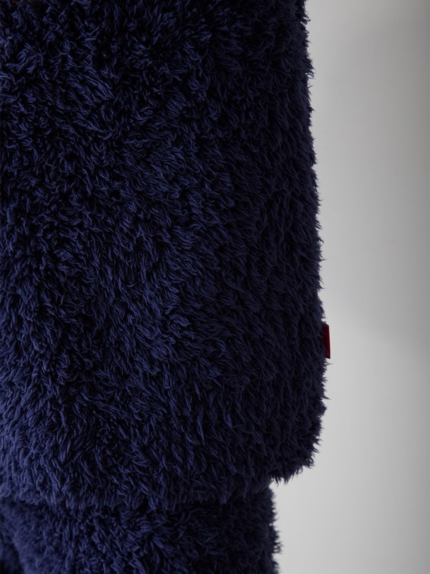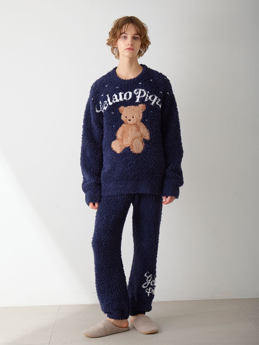 This HOMME pullover from the Snow Bear series is perfect for enjoying quality time with family, friends, or someone special during the holiday season. Crafted from long-pile ‘Gelato’ fabric, it features a relaxing cut. The front showcases a sitting bear and swirling snowflakes in a jacquard pattern, while the eye-catching logo jacquard extending all the way to the shoulders. A subtle candy cane pattern at the collar also adds seasonal flair. We recommend pairing this item with the pants from the same collection.