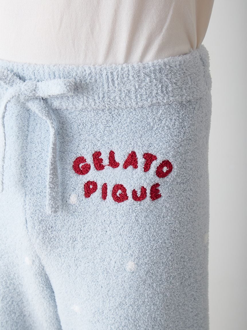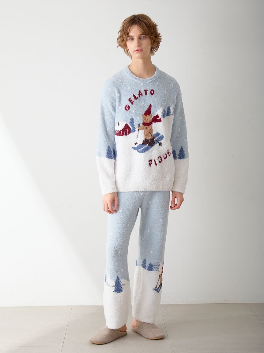 This bear-themed loungewear series is perfect for spending the cozy holiday season with family, friends, and loved ones. These HOMME long pants feature a bear skiing down a snowy mountain and delivering gifts to loved ones. The snow is crafted with long-pile "Gelato" yarn, and a sagara embroidered logo on the left hip adds a rich texture. This item emphasizes the bear's expression wearing a red scarf and knit cap, as well as the background to tell the story. Available in two colors: daytime mint and night time navy, finish the look by pairing with the pullovers and cardigans from the same collection. Ladies' size are also available.