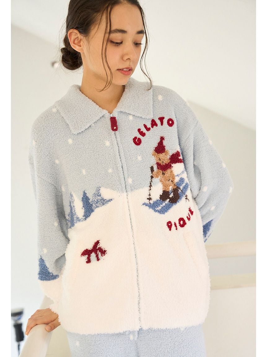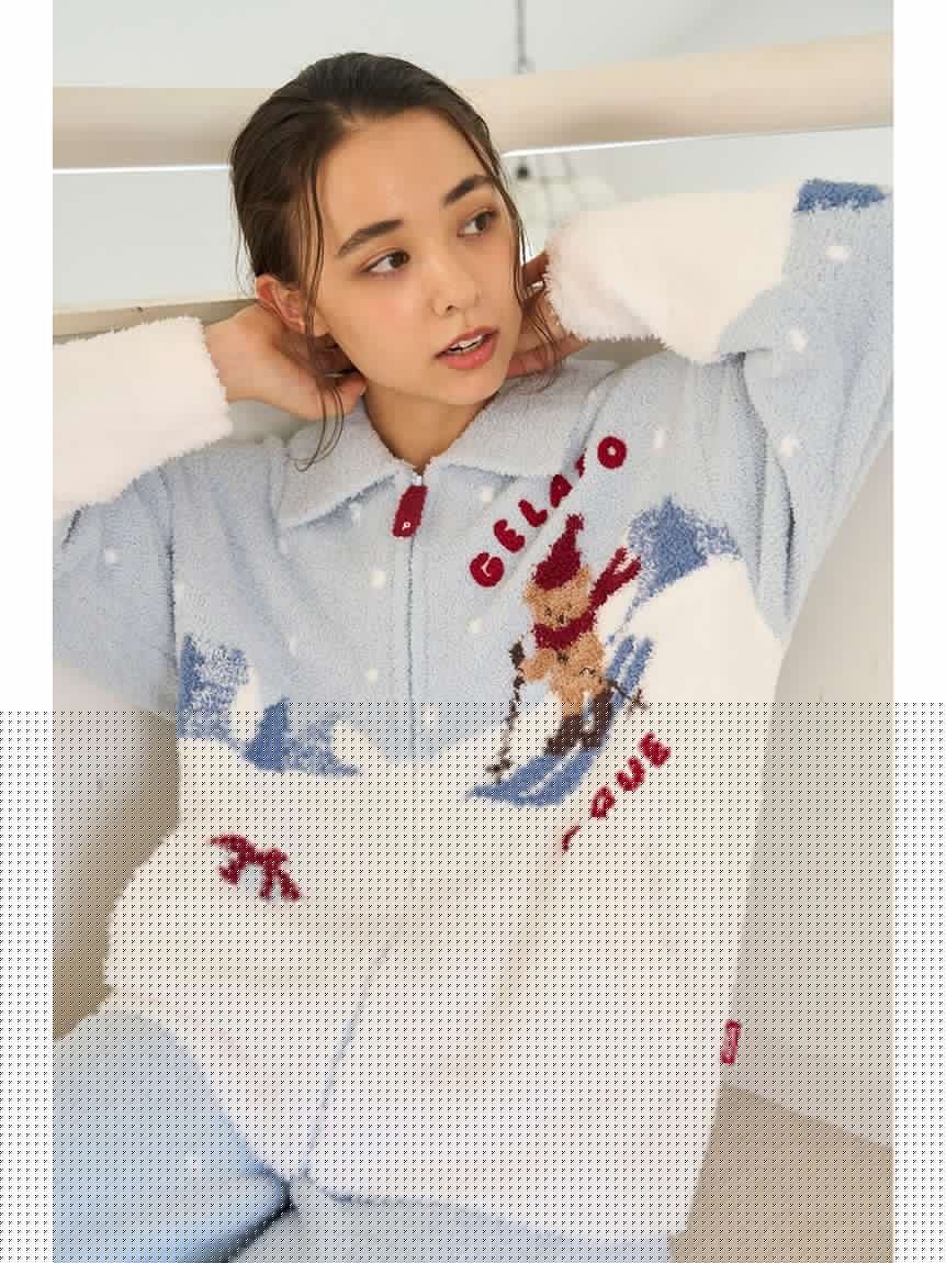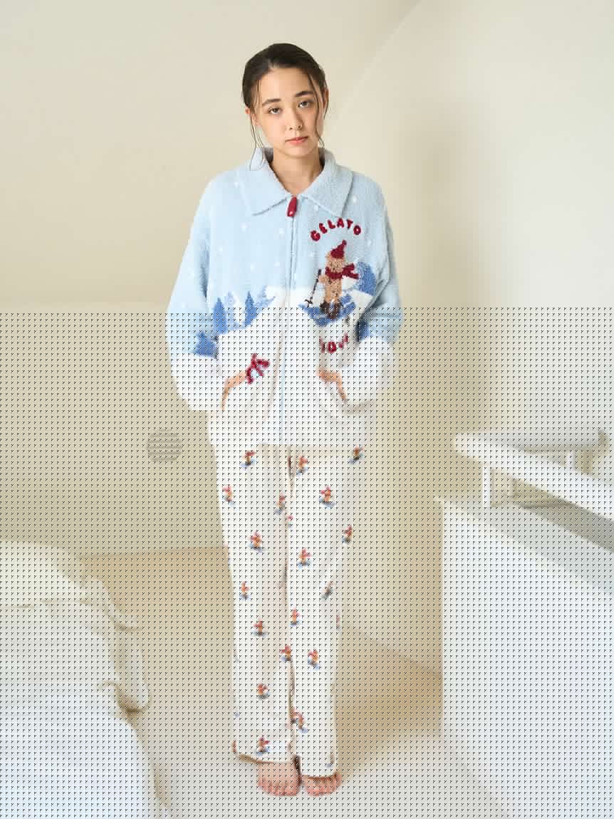 This bear-themed loungewear series is perfect for spending the cozy holiday season with family, friends, and loved ones. This collared cardigan features a bear skiing down a snowy mountain and delivering gifts to loved ones. The snow is made with long-pile "Gelato" yarn, and the chest features a sagara embroidered logo. The collar keeps you warm all the way to your neck, and the zipper has the same design as the bear's scarf, adding a cute touch. This item emphasizes the bear's expression wearing a red scarf and knit cap, as well as the background to tell the story. Available in two colors: daytime mint and night time navy, we recommend pairing it with the long pants from the same collection. Men's size is also available.