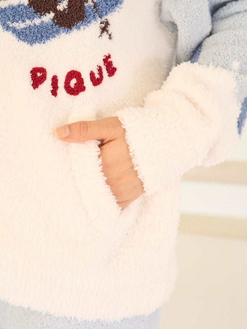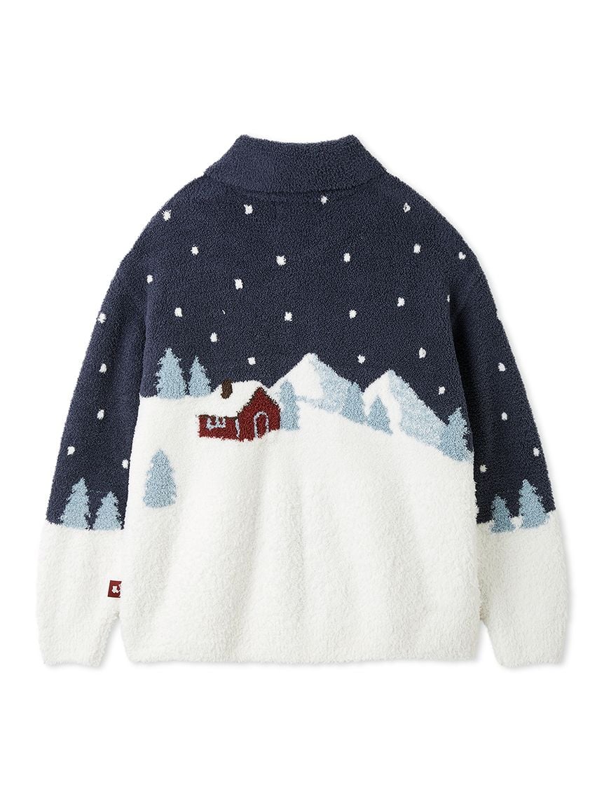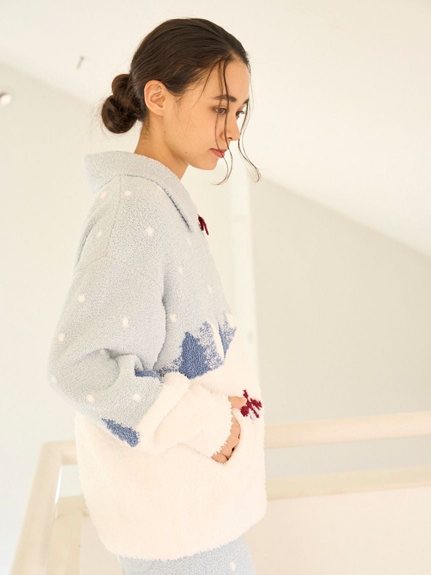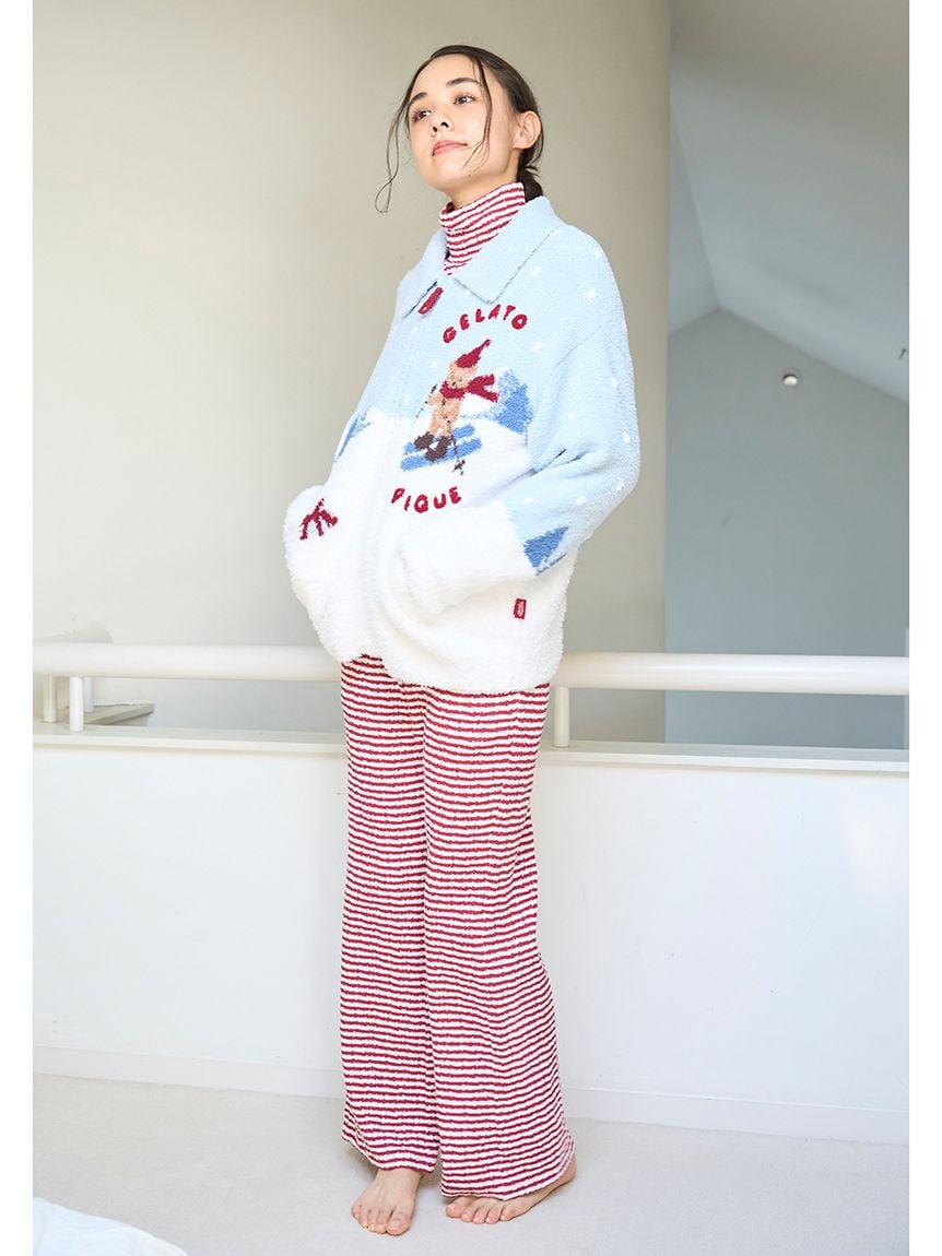 This bear-themed loungewear series is perfect for spending the cozy holiday season with family, friends, and loved ones. This collared cardigan features a bear skiing down a snowy mountain and delivering gifts to loved ones. The snow is made with long-pile "Gelato" yarn, and the chest features a sagara embroidered logo. The collar keeps you warm all the way to your neck, and the zipper has the same design as the bear's scarf, adding a cute touch. This item emphasizes the bear's expression wearing a red scarf and knit cap, as well as the background to tell the story. Available in two colors: daytime mint and night time navy, we recommend pairing it with the long pants from the same collection. Men's size is also available.