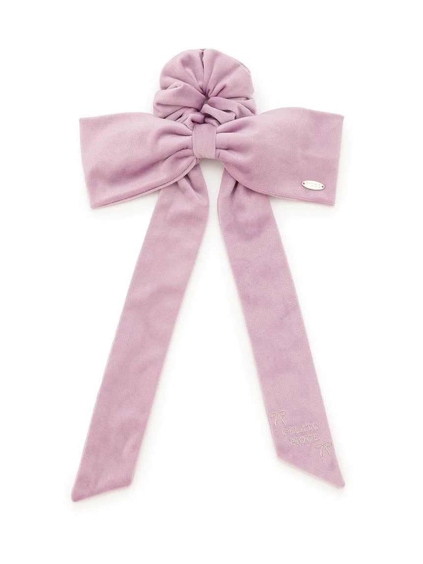 Hair Scrunchie made with calm lavender colored Velour fabric featuring a large ribbon, decorated with logo embroidery and plate. The long length of ribbon adds charm to your hair movement. Don't forget to check other hair scrunchies or the handle pouch from the same collection, as they would also make a great gift.