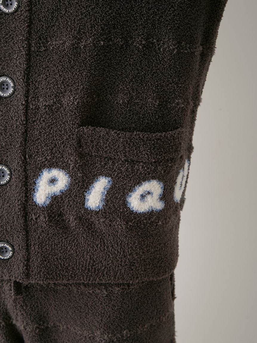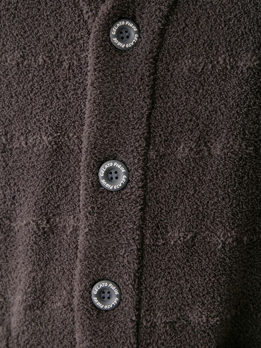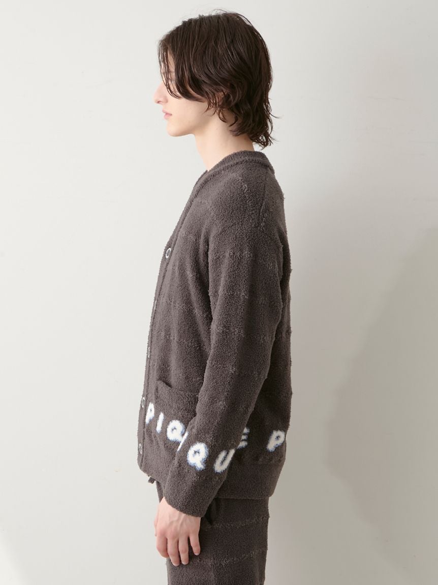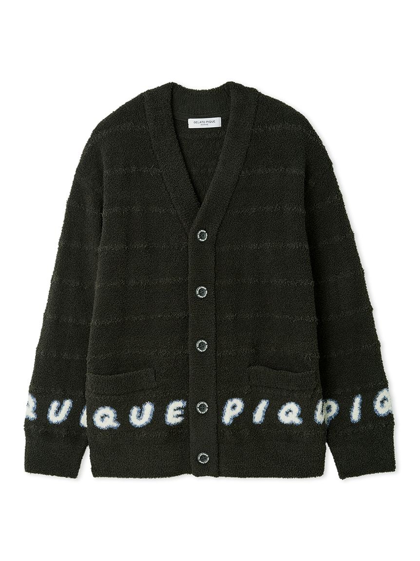 This fall Halloween collection, a once-a-year treat, features HOMME's signature colors. This loose-fitting cardigan is made from soft 'BABY MOCO' fabric and features a logo jacquard at the hem for a pop of color. Part of the border is crafted with long-haired 'Gelato' yarn for a textured finish. Available in two colors: camel, inspired by toasted biscuits stuffed with pumpkin mousse, and dark gray, inspired by Halloween night, with a candy-like logo at the hem. Pair it with the long pants and tops from the same series.