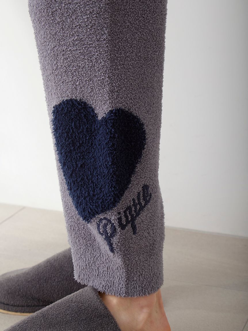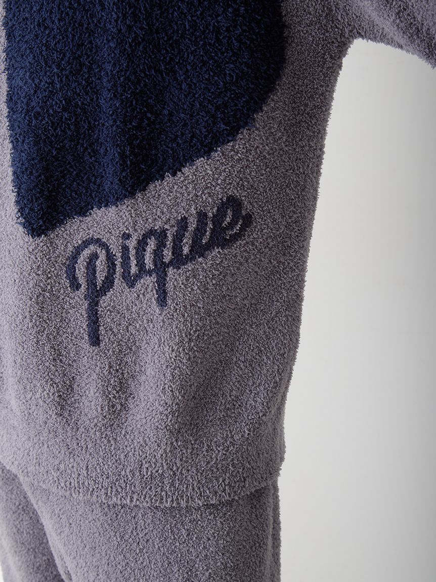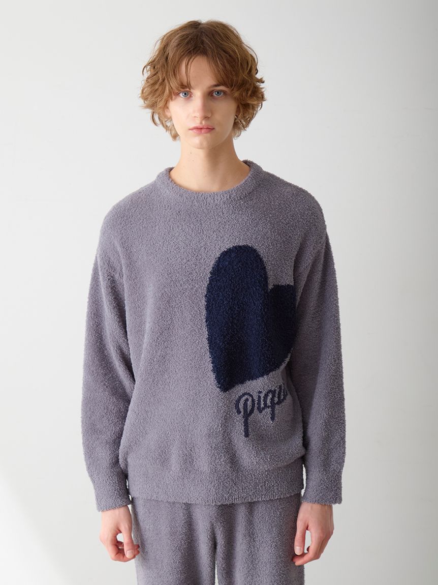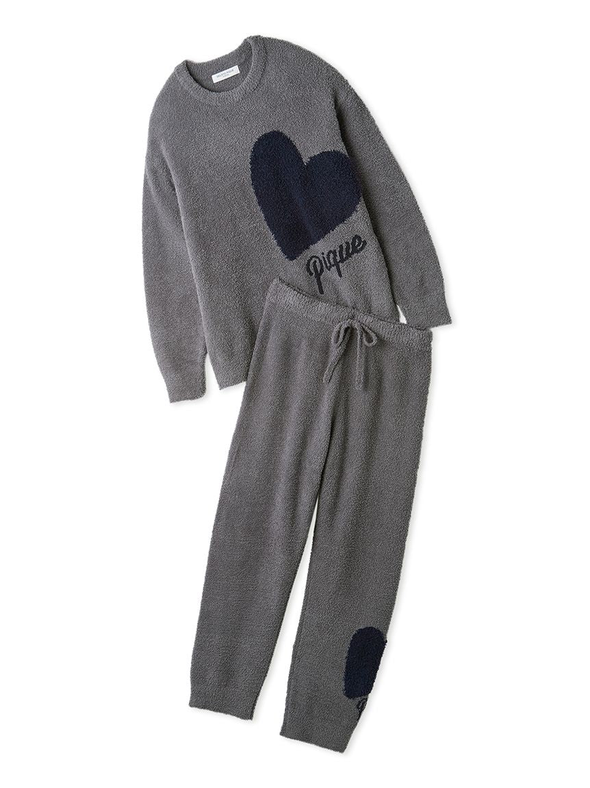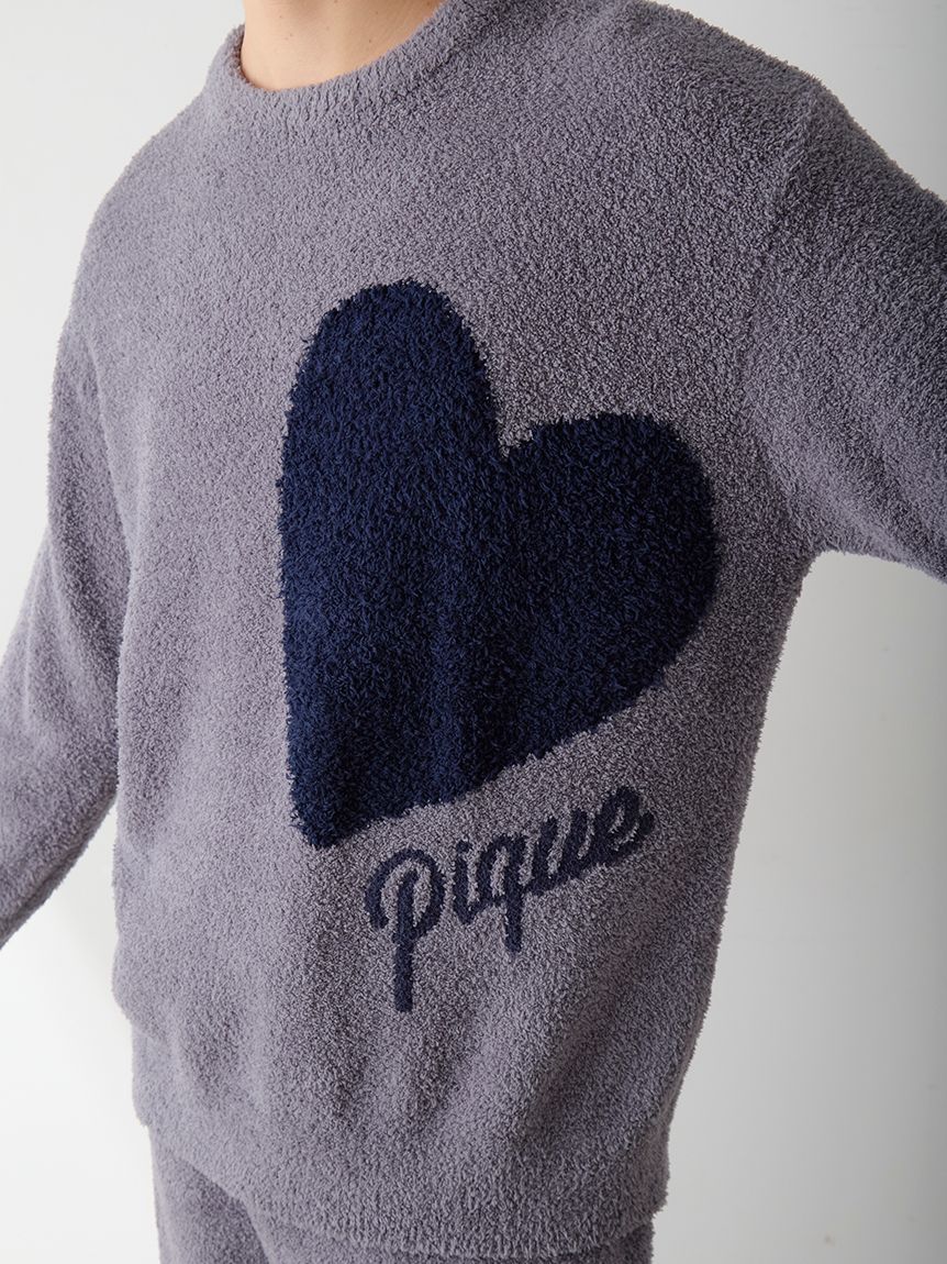 Introducing this soft knit loungewear set that will keep your heart warm during the cold season. This men's set includes a pullover with a large diagonal heart on the side and long pants with a small heart design at the hem, both featuring a Pique logo jacquard. We recommend wearing the unisex cardigan from the same collection as the outwear.