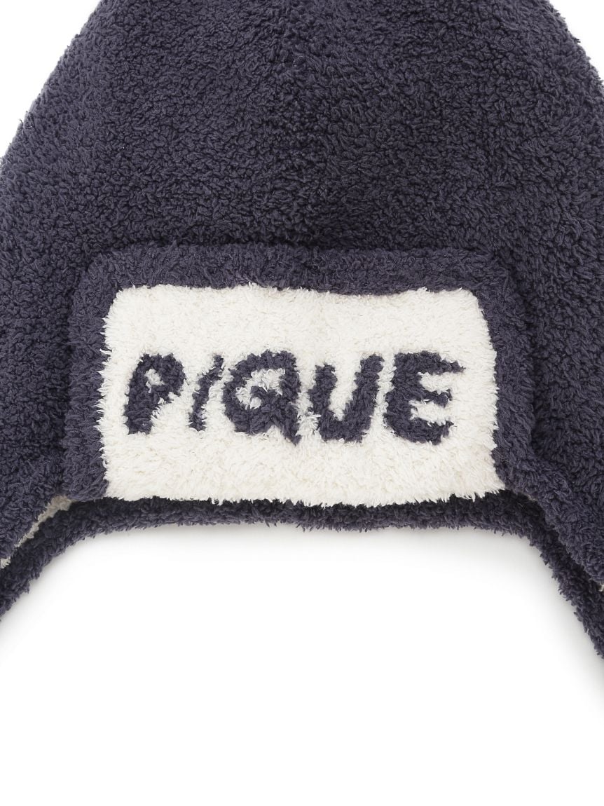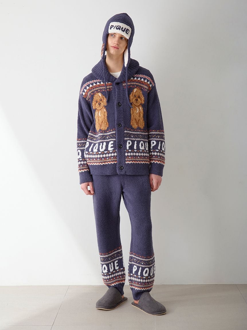This knit cap with ear flaps offers a soothing, smooth, powdery feel. The logo jacquard on the front fold and the Nordic pattern on the ear flaps create a warm, eye-catching look. The subdued navy color makes it perfect for short trips. Pair it with other knitwear and accessories from the same series.