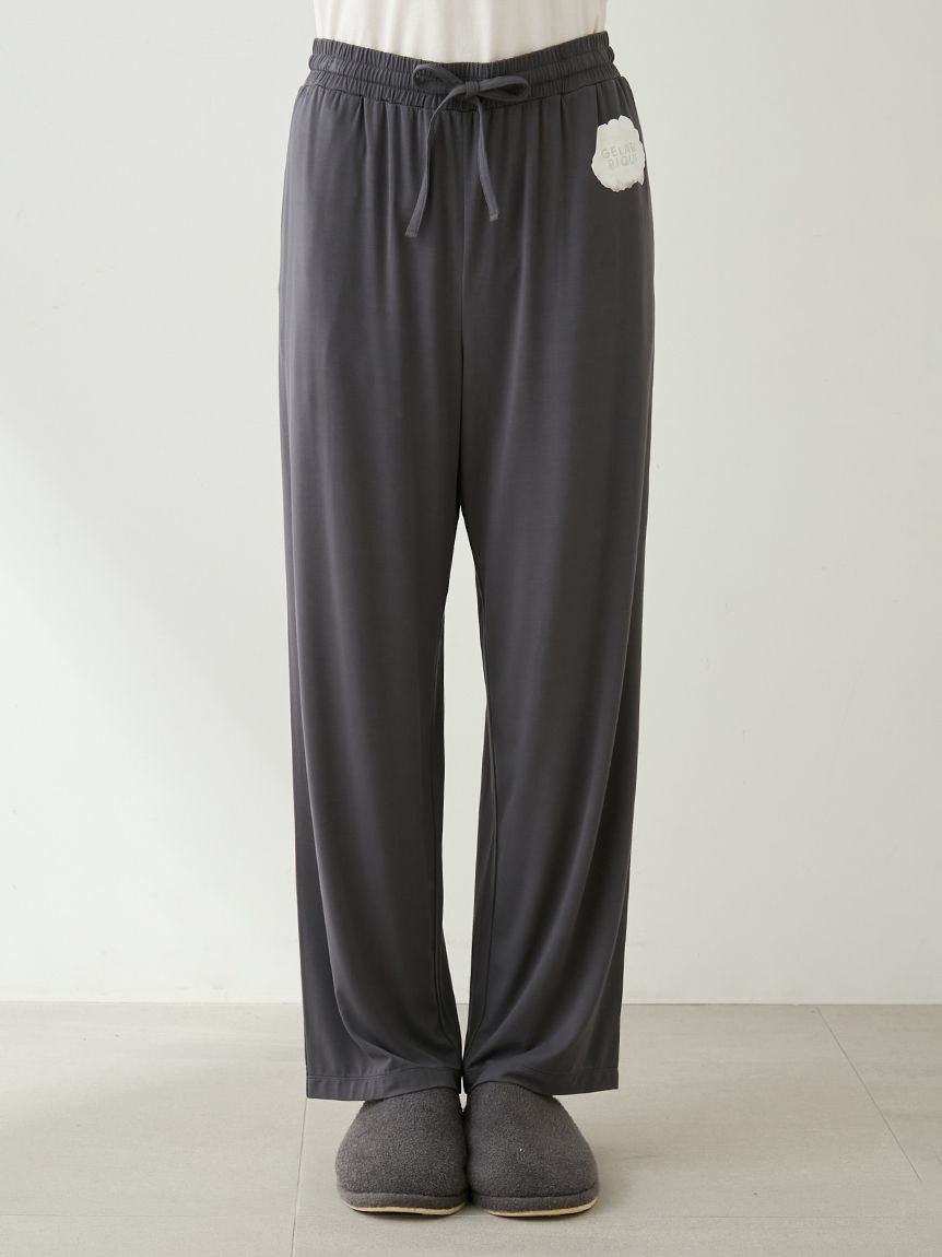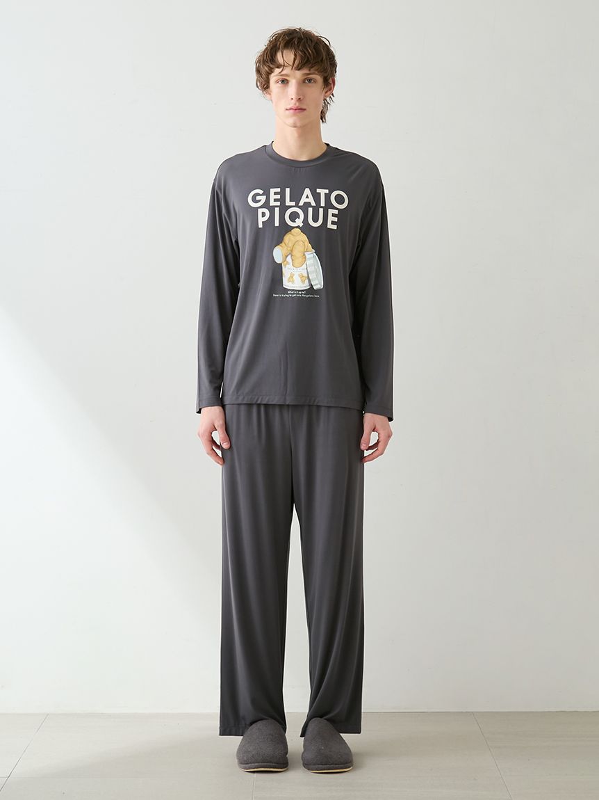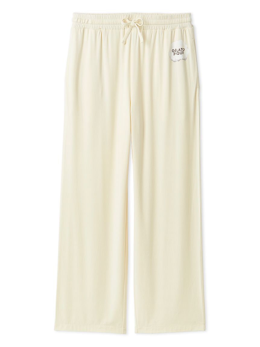 This series features HOMME bear and gelato graphics on a comfortable, smooth rayon top. These long pants feature a soft, flowing, straight silhouette and a fluffy gelato print on the left hip. This item matches the long-sleeved T-shirt featuring a bear jumping into a gelato box, as the design around the waist is inspired by the spilled gelato. Pockets are placed on both front sides and the back right. Available in cream and dark gray, this item along with the t-shirt would make a great loungewear set for yourself or as a gift.