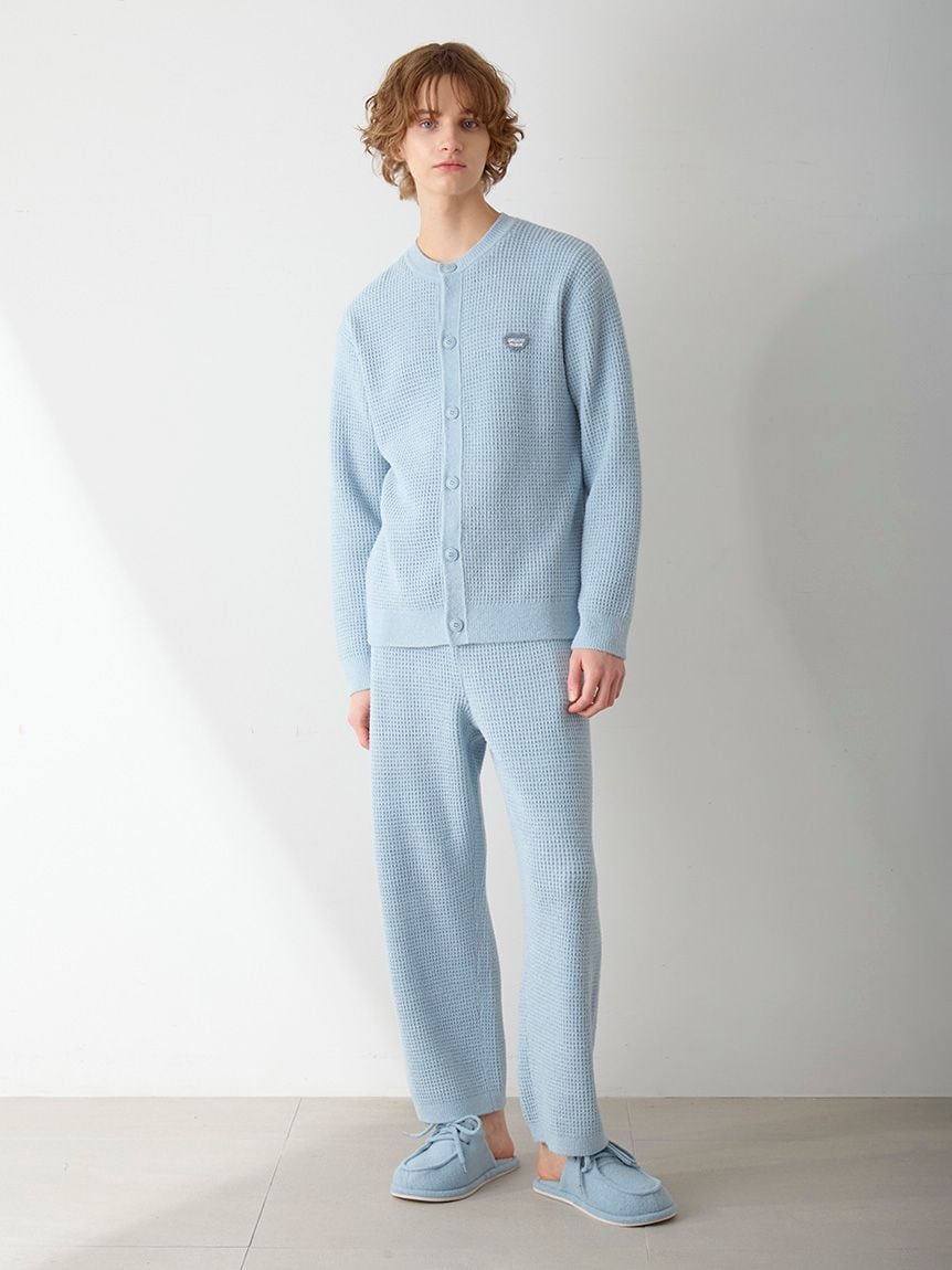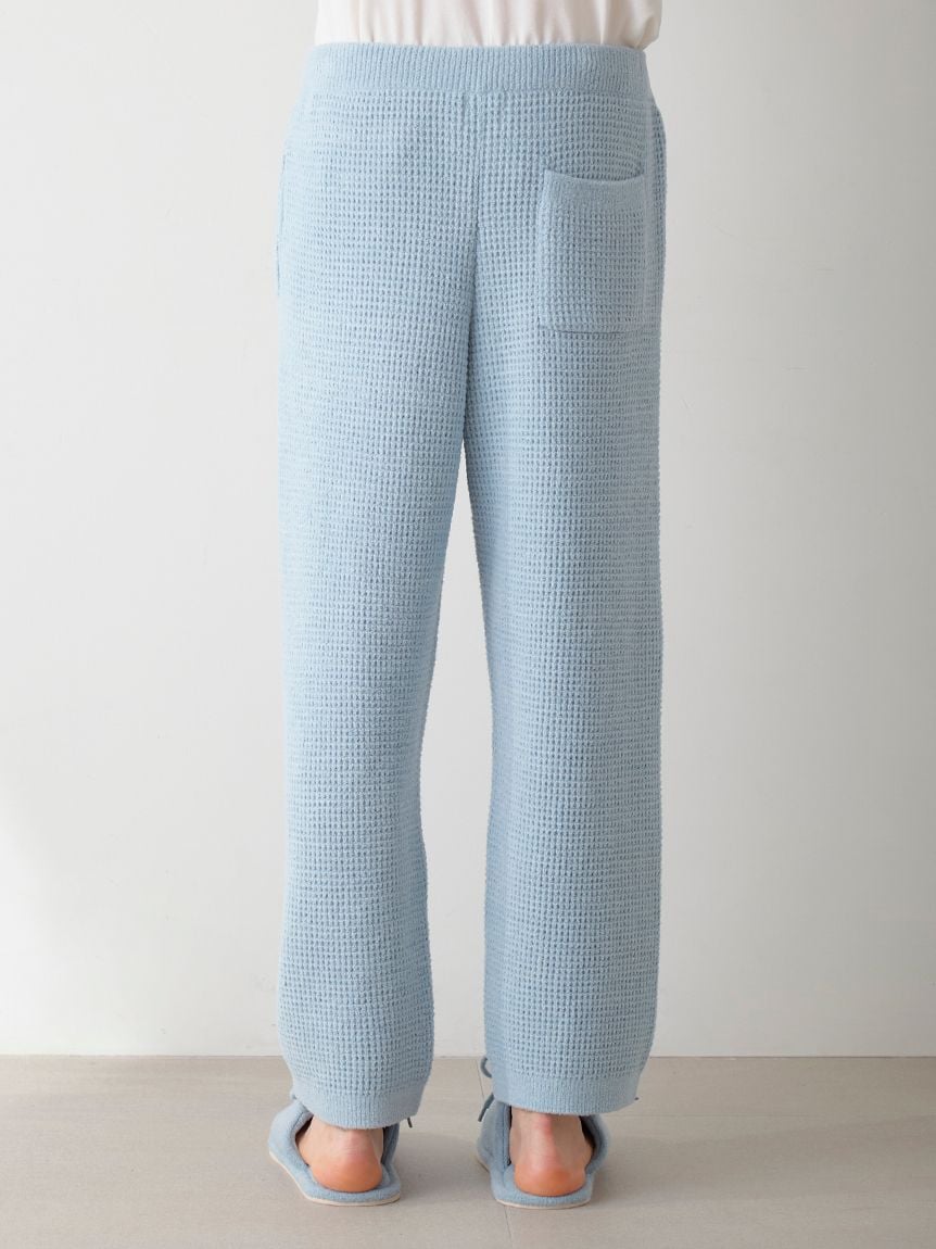 These HOMME series pants are made with soft, fluffy waffle knit yarn, exclusive to gelato pique. These long pants feature a relaxed silhouette and a comfortable fit, offering a soft, comforting waffle feel. A heart-shaped sagara embroidery in the same color as the body adds a playful touch to the left hip. Available in two colors: blue and gray. They coordinate well with the knit shirt and crew neck cardigan from the same series.