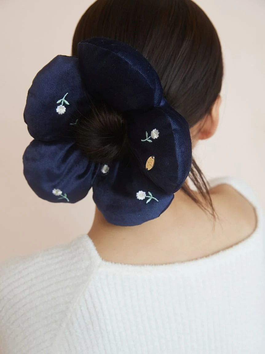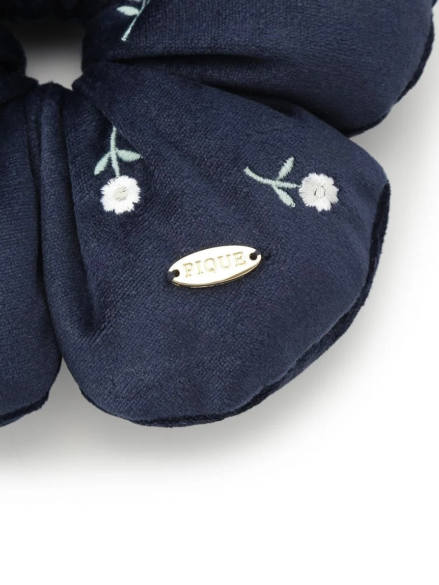 A hair scrunchie made with navy Velour fabric, finished with flower embroidery. A Gelato Pique logo plate adds accent to the flowery design. Don't forget to check other hair scrunchies or the handle pouch from the same collection, as they would also make a great gift.