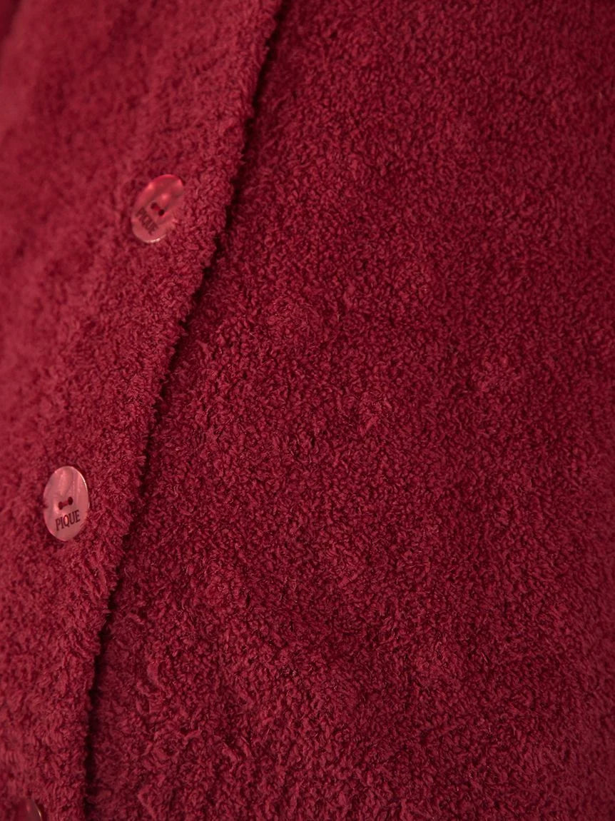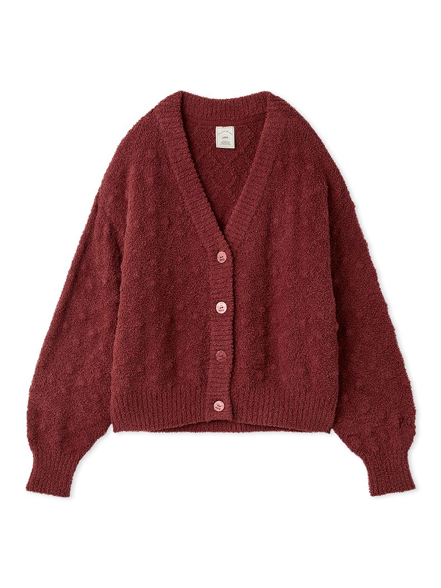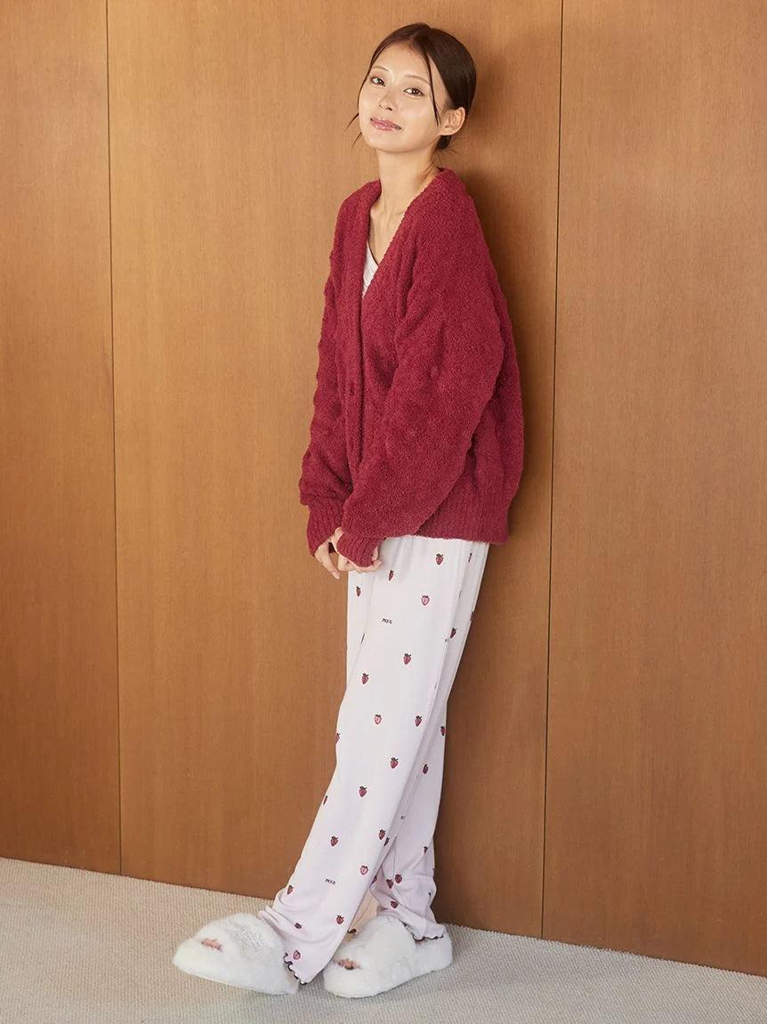 This patterned knit cardigan brings warmth with a juicy strawberry red color. The loose silhouette with wide armholes and the textured knit pattern, reminiscent of strawberries, create a cute presence. Enjoy pairing it with other items of the strawberry pattern collection, which will be released at the same time.