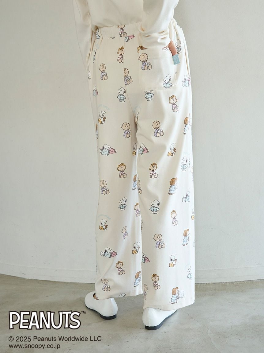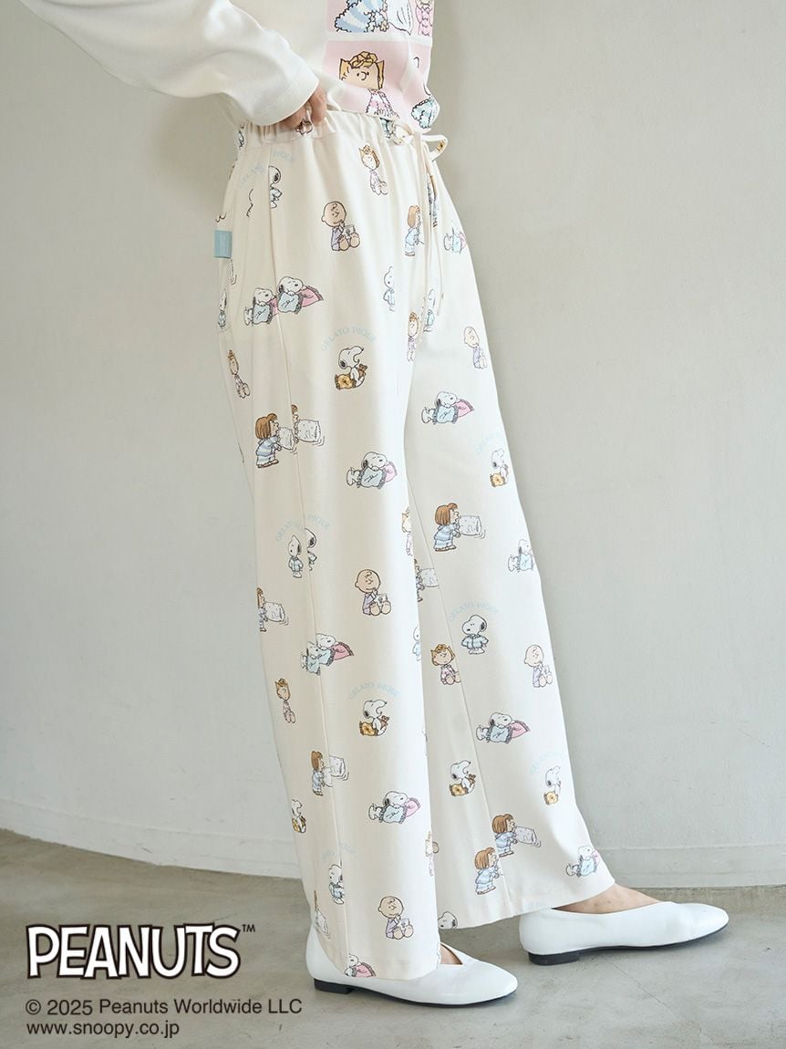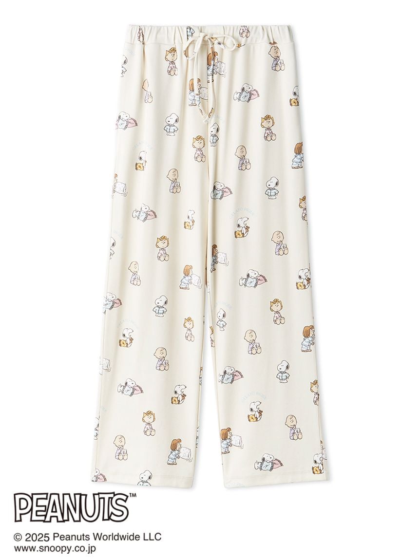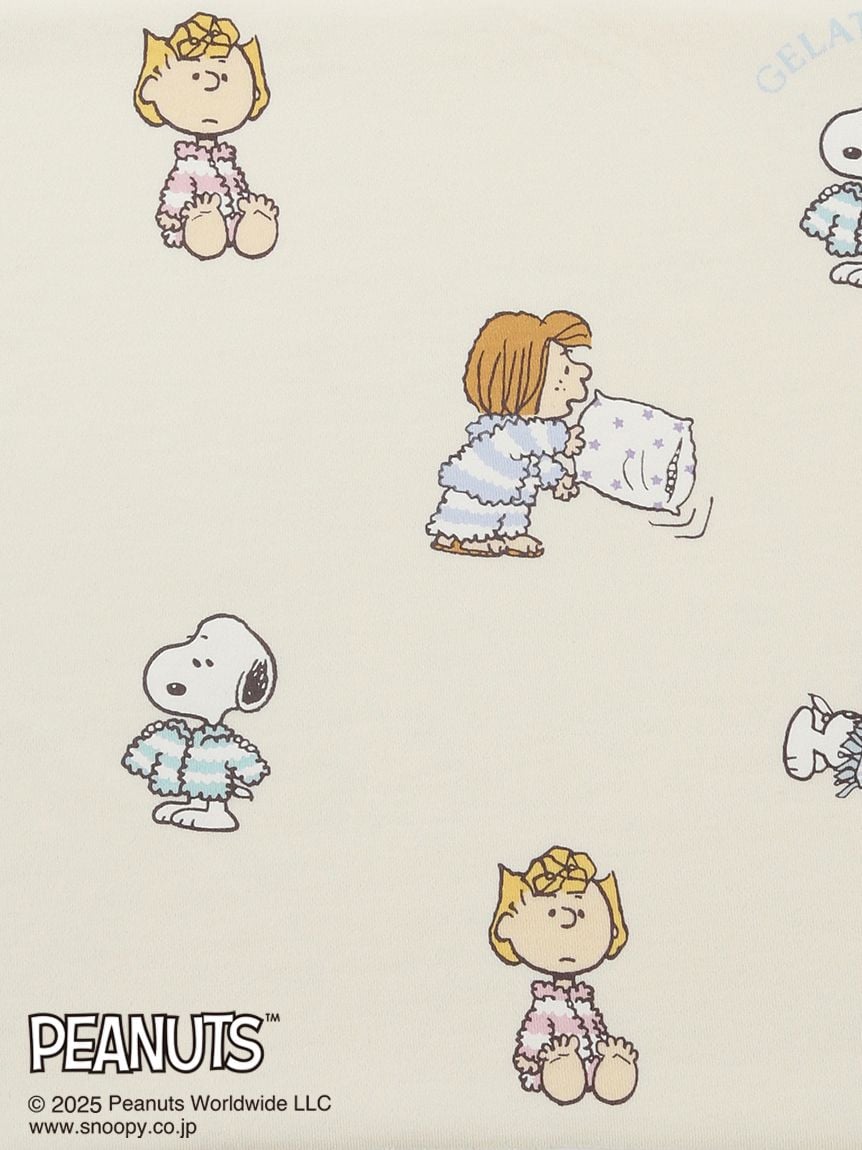 The new items from the PEANUTS and gelato pique collaboration series are perfect for the whole family. This collection features a special, original art exclusive to Gelato Pique, depicting PEANUTS characters enjoying a happy moment before bed. This pullover features Snoopy cozying up with his pillow, Charlie Brown eating an ice cream cone, Peppermint Patty having a pillow fight, and Sally Brown wearing Gelato Pique's signature pyajama. We recommend pairing this item with the all-over print pullover from the same series.