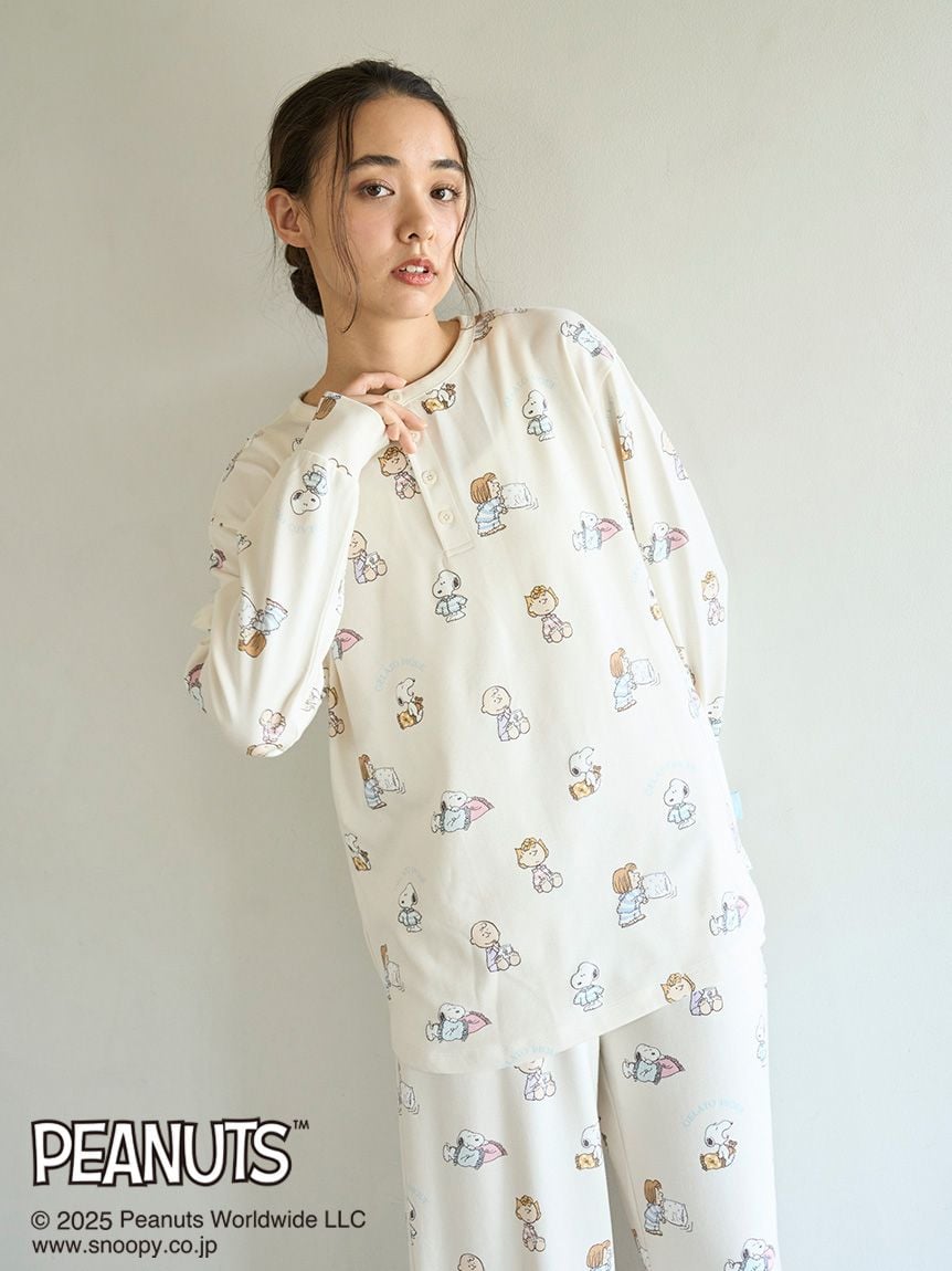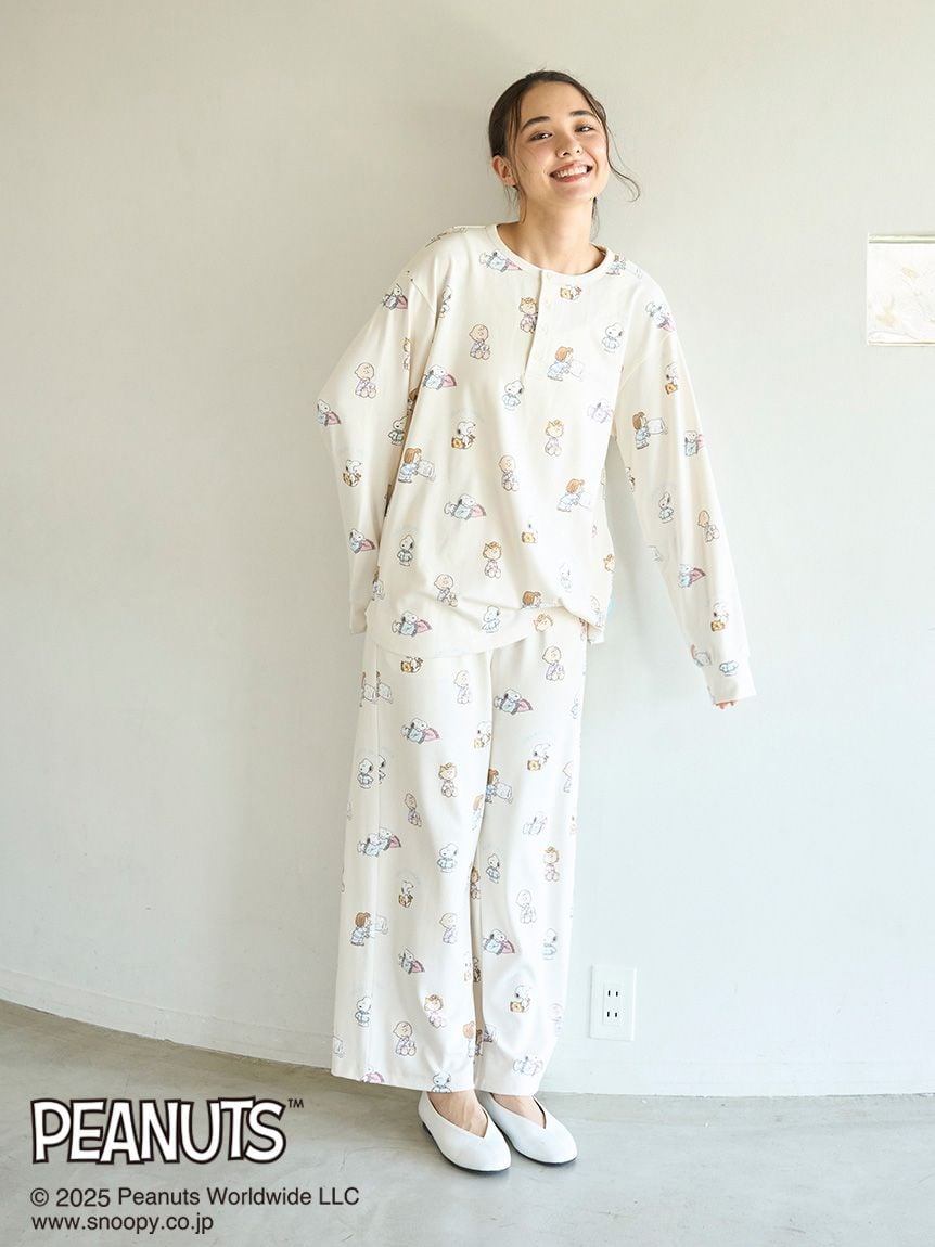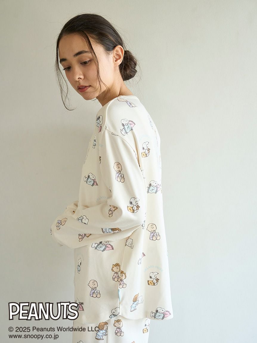 The new items from the PEANUTS and gelato pique collaboration series are perfect for the whole family. This collection features a special, original art exclusive to Gelato Pique, depicting PEANUTS characters enjoying a happy moment before bed. This pullover features Snoopy cozying up with his pillow, Charlie Brown eating an ice cream cone, Peppermint Patty having a pillow fight, and Sally Brown wearing Gelato Pique's signature pyajama. We recommend pairing this item with the all-over print long pants from the same series.