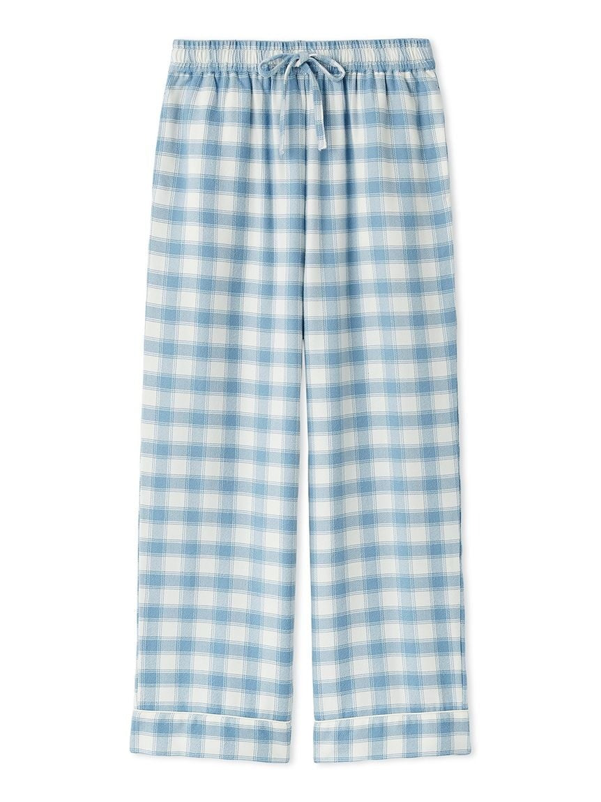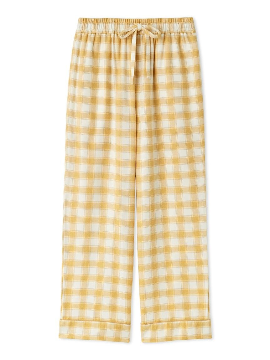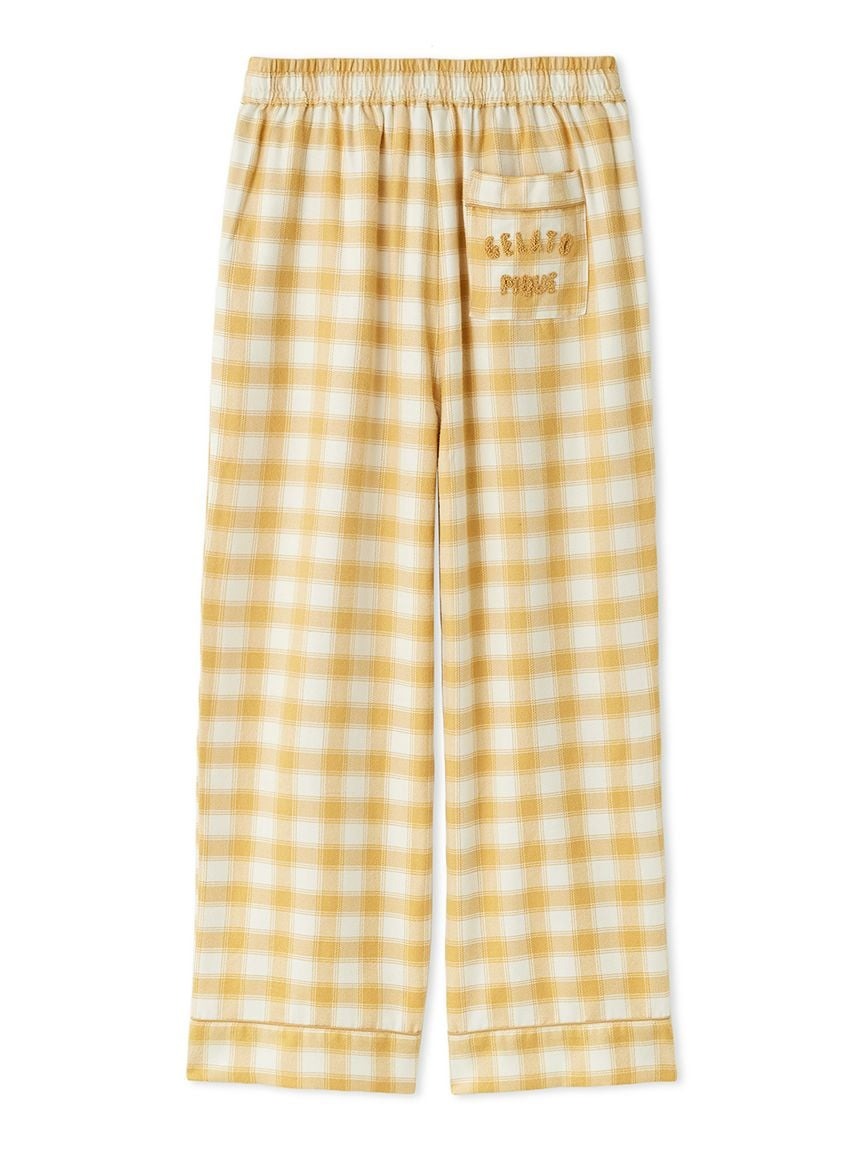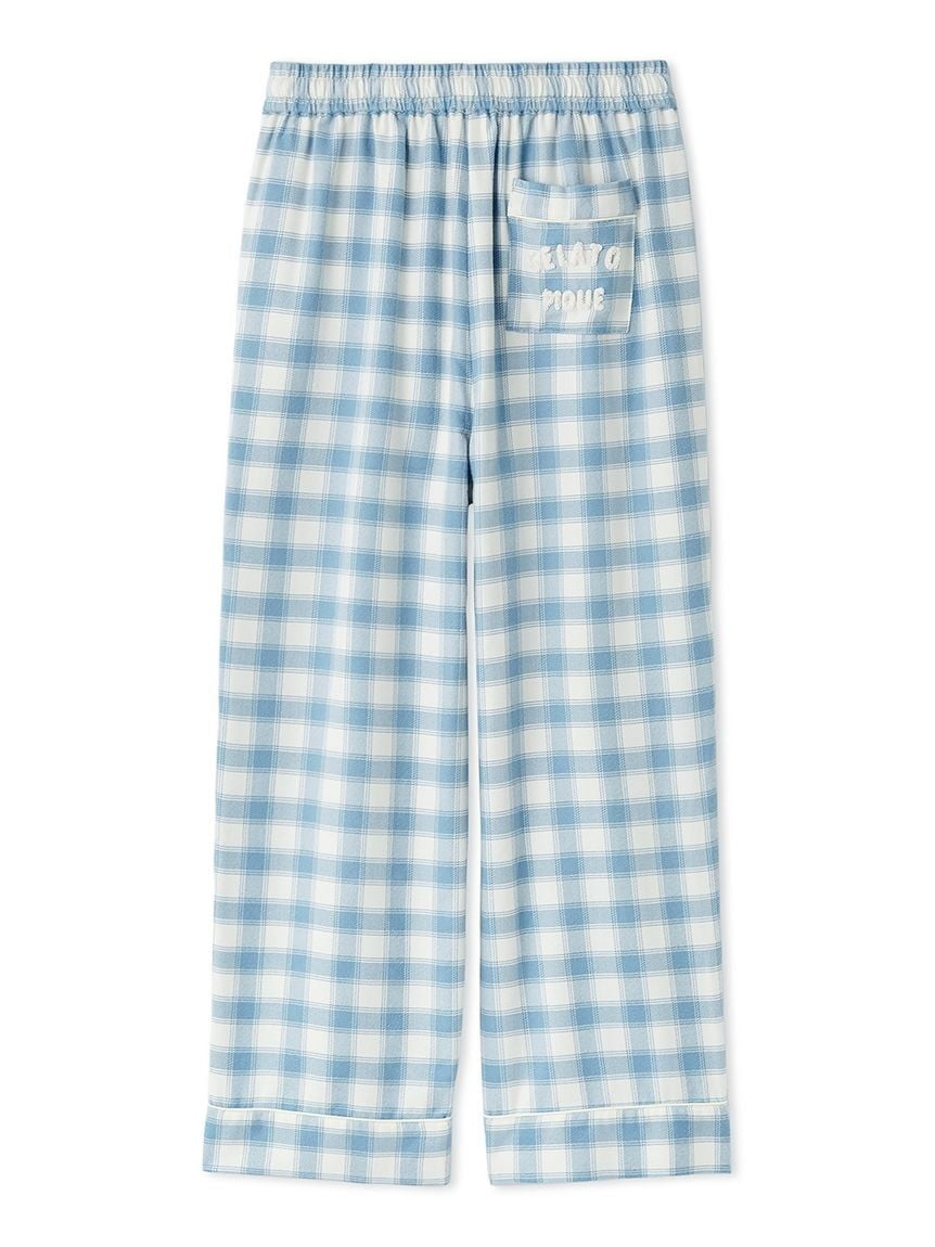 This casual flannel loungewear series features a bright check pattern inspired by the trendy preppy style. The long pants feature a cute matching waist ribbon and a refined design with piping on the hem cuffs and the right back pocket. Side pockets are included, and the back pocket also features satin stitching. The relaxed straight cut pairs well with a wide range of items like shirts and knit tops. Available in two colors: soft yellow and refreshing blue. We recommend pairing them with the matching shirt from the same series or other preppy knit items from the same collection.