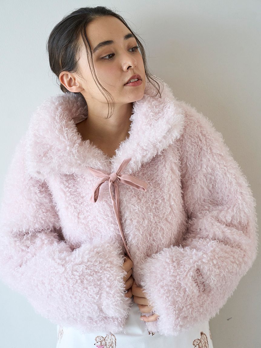 This bolero cardigan features a soft, curly boa reminiscent of a poodle. The elegant design features a ribbon at the collar for easy fastening. A large pink ribbon adds an accent to this item, so you can pair it with tops or dresses. We also recommend coordinating it with other ribbon poodle items from the same collection.