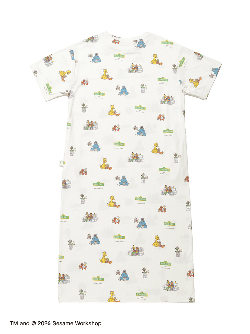 This short-sleeved dress features all-over prints of Elmo, Cookie Monster, Big Bird, Oscar, Ernie, and Bert. Each character is flanked by a fluffy item in a pique blue striped pattern. Crafted from a soft, off-white knit fabric, the dress features a relaxed fit with a flat silhouette. Pockets on both sides add extra point to the already cute item. We recommend pairing it with the cardigan from the same series.