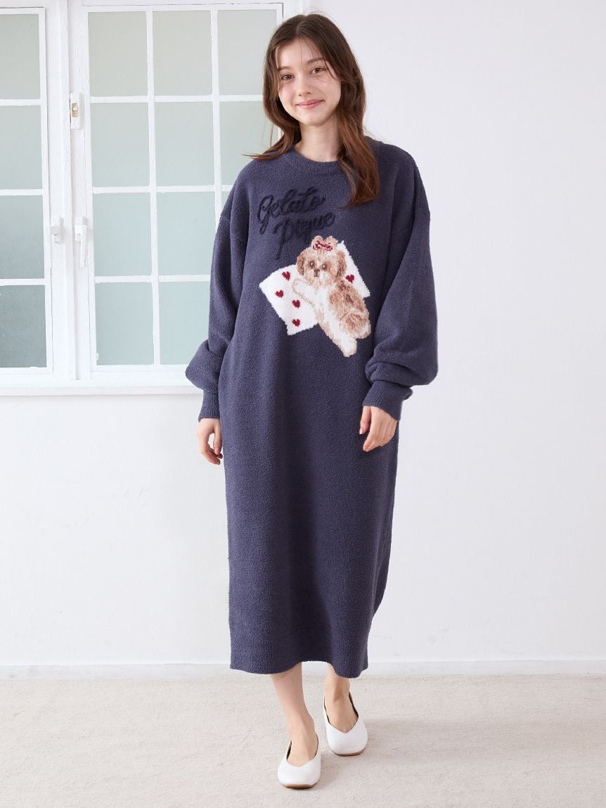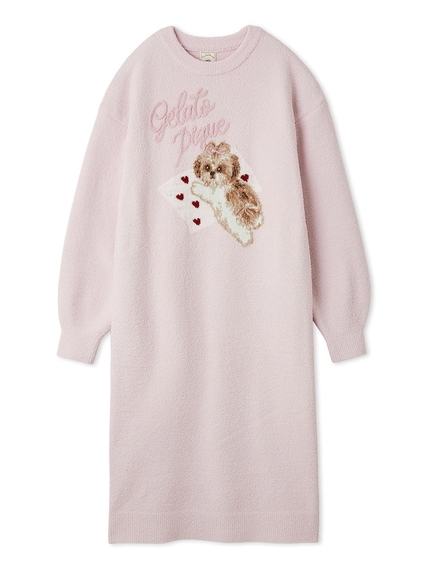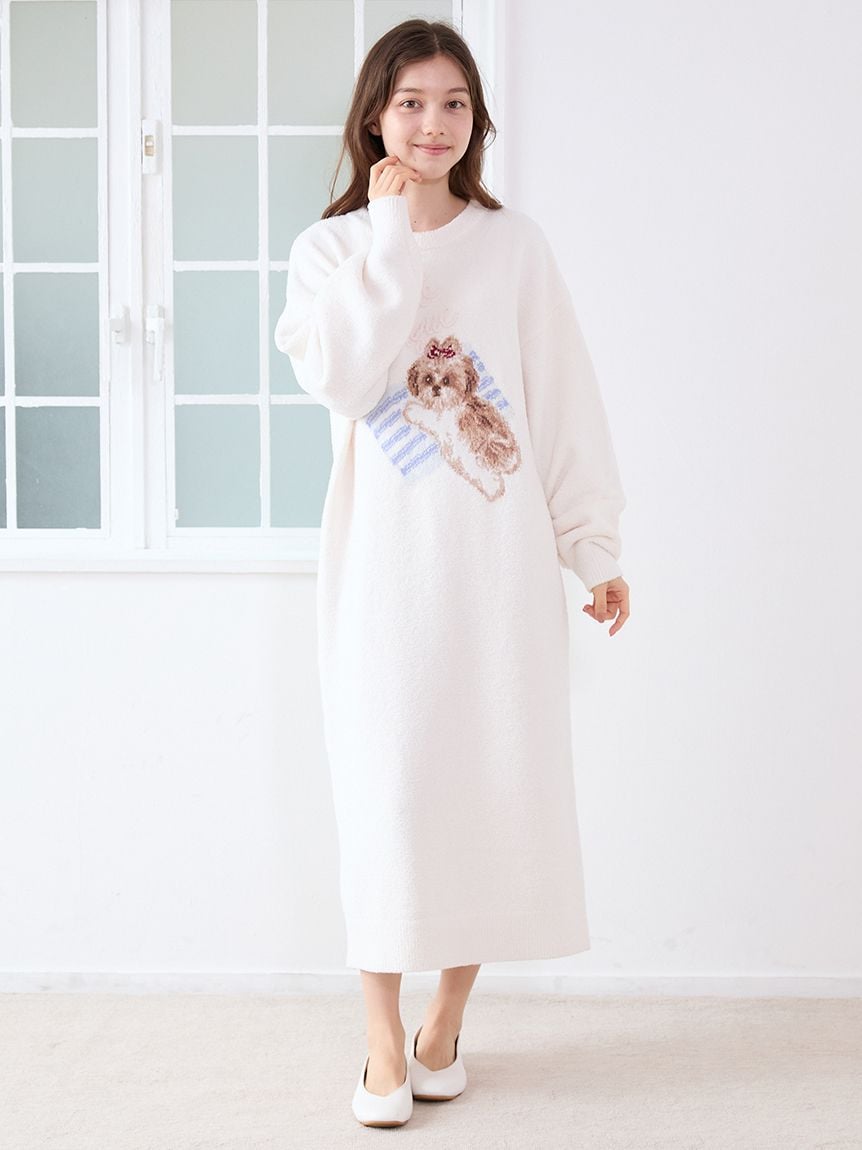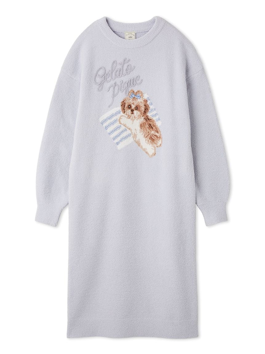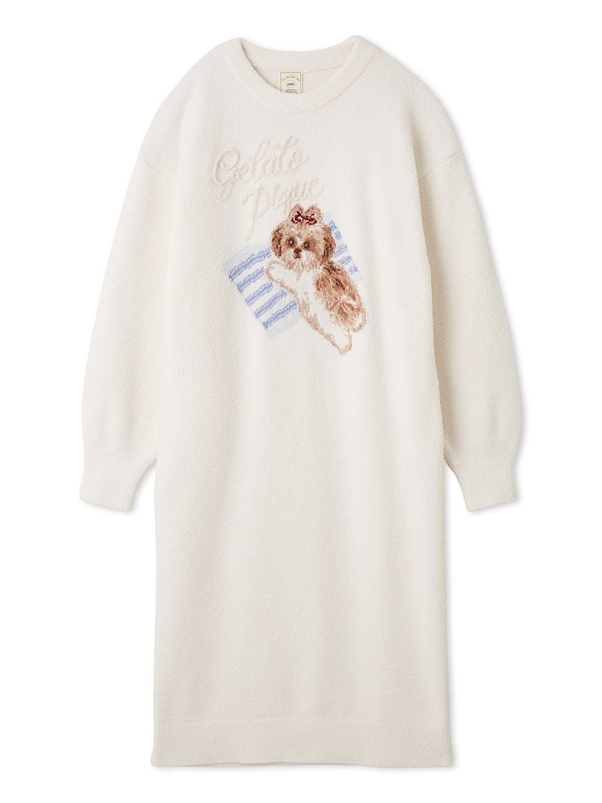 This jacquard knit series features a Shih Tzu snuggling up to your favorite pillow. The soft, fluffy design features a three-dimensional logo. Comfortable enough to wear on its own, the voluminous sleeves add a touch of style. The design of the Shih Tzu with a ribbon varies depending on the color scheme of the body. The off-white and blue versions feature striped pillows, while the online-exclusive navy color features hearts. This is also a recommended gift for Shih Tzu lovers.
