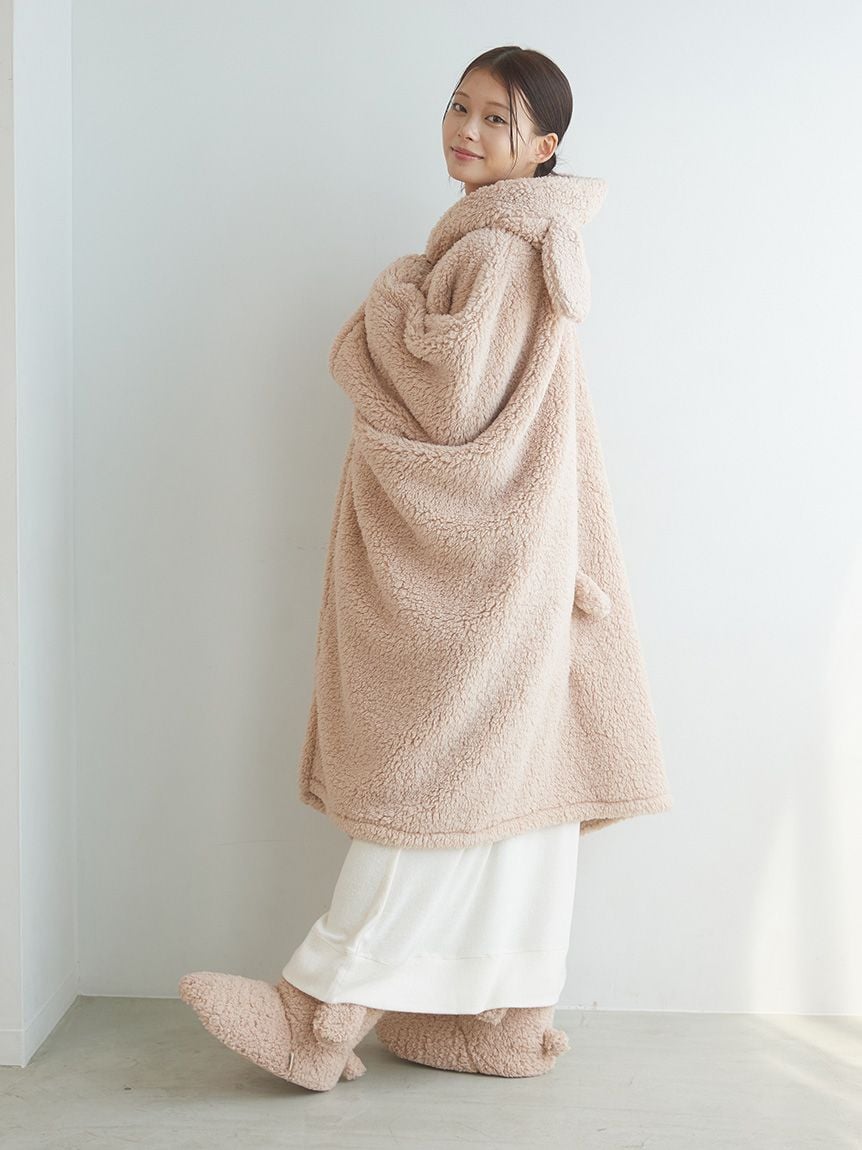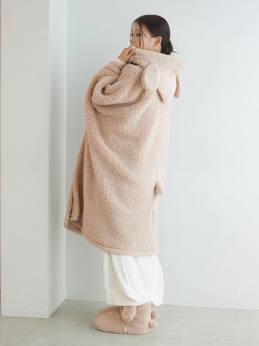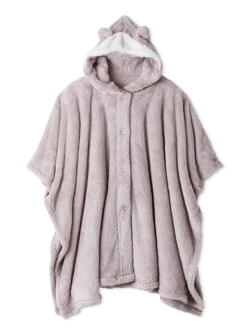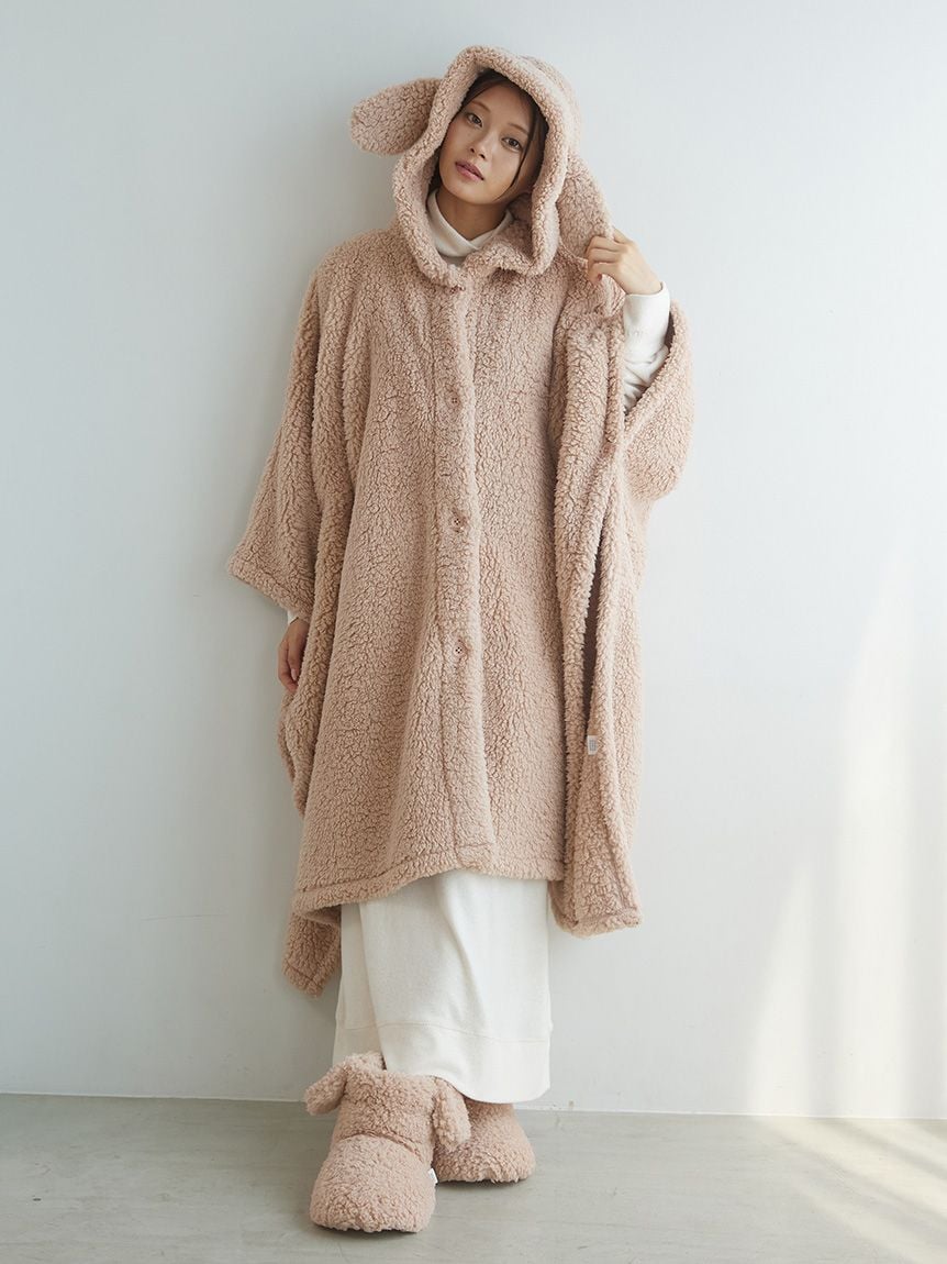 This "wearable blanket" is a hit every season, featuring a fluffy toy poodle and a soft ragdoll motif. The texture of the material is inspired by the fur of each breed. It's a comfortable poncho style that slips over your head, and the playful design features ears on the hood and a tail on the back. Pair it with the matching room boots for a cute, role-playing look. Available in beige with a toy poodle motif and light gray with a ragdoll motif.