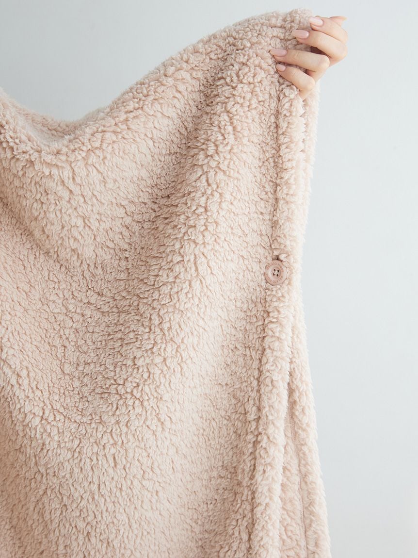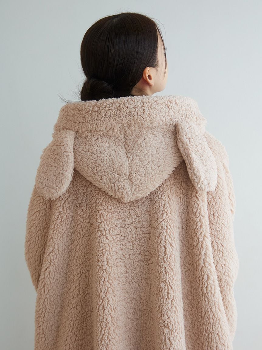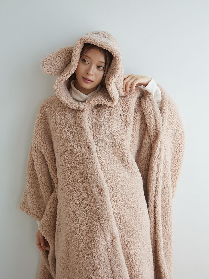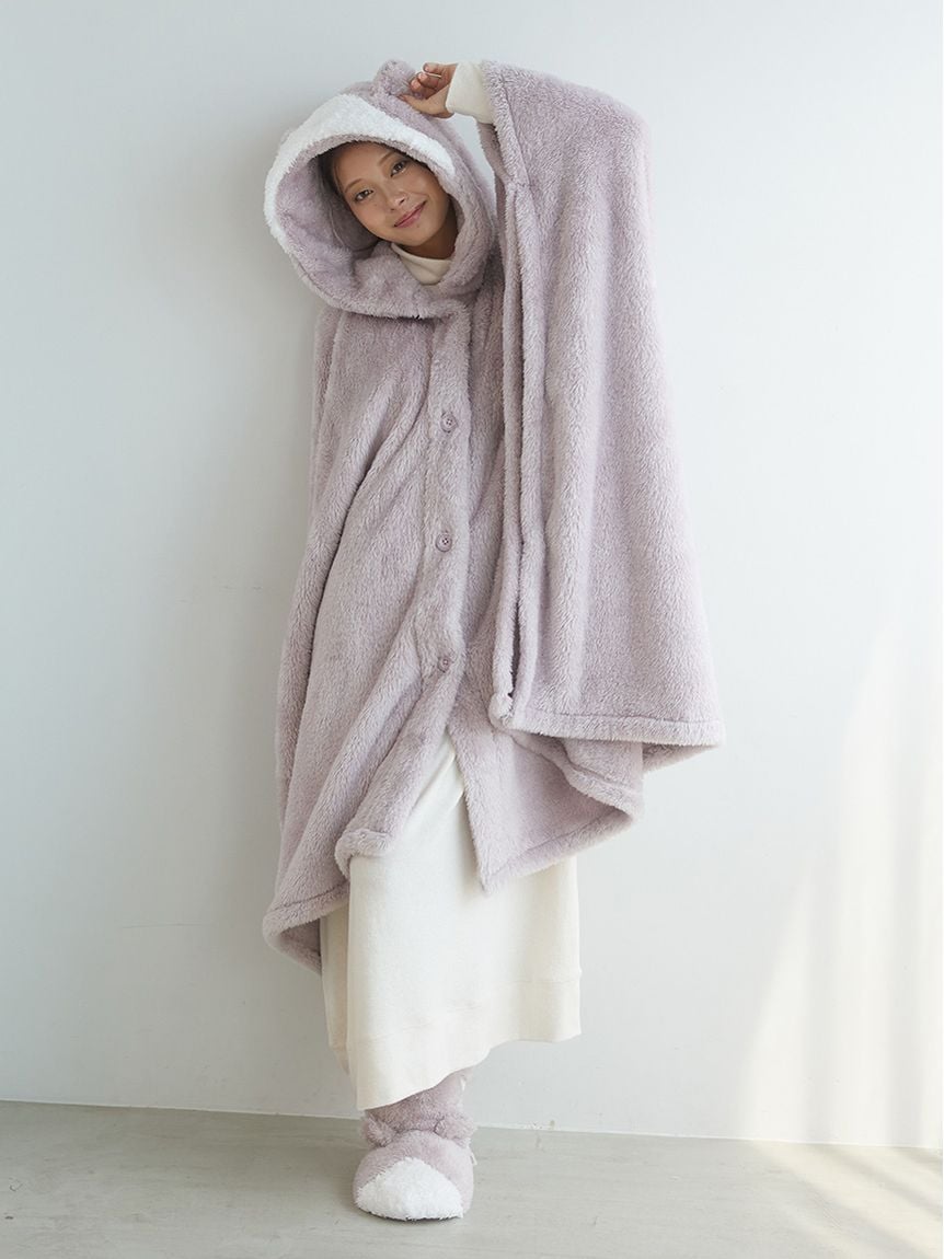 This "wearable blanket" is a hit every season, featuring a fluffy toy poodle and a soft ragdoll motif. The texture of the material is inspired by the fur of each breed. It's a comfortable poncho style that slips over your head, and the playful design features ears on the hood and a tail on the back. Pair it with the matching room boots for a cute, role-playing look. Available in beige with a toy poodle motif and light gray with a ragdoll motif.