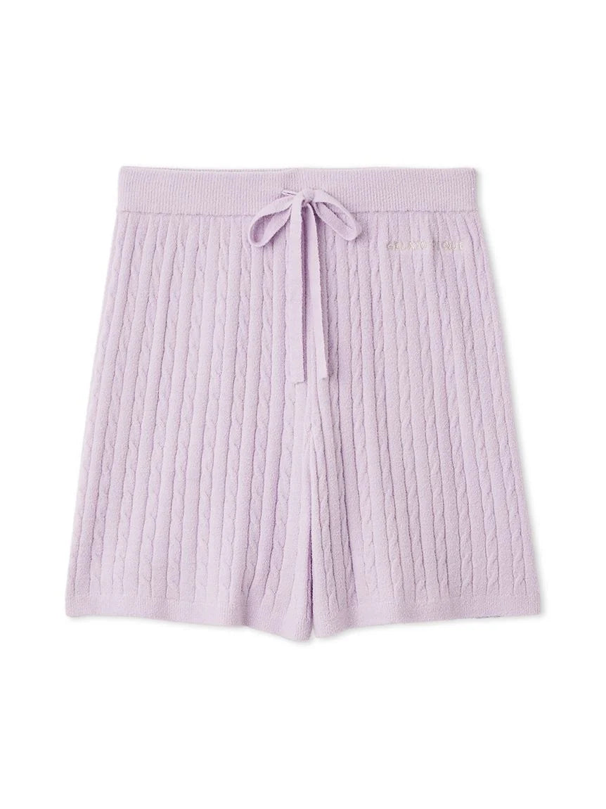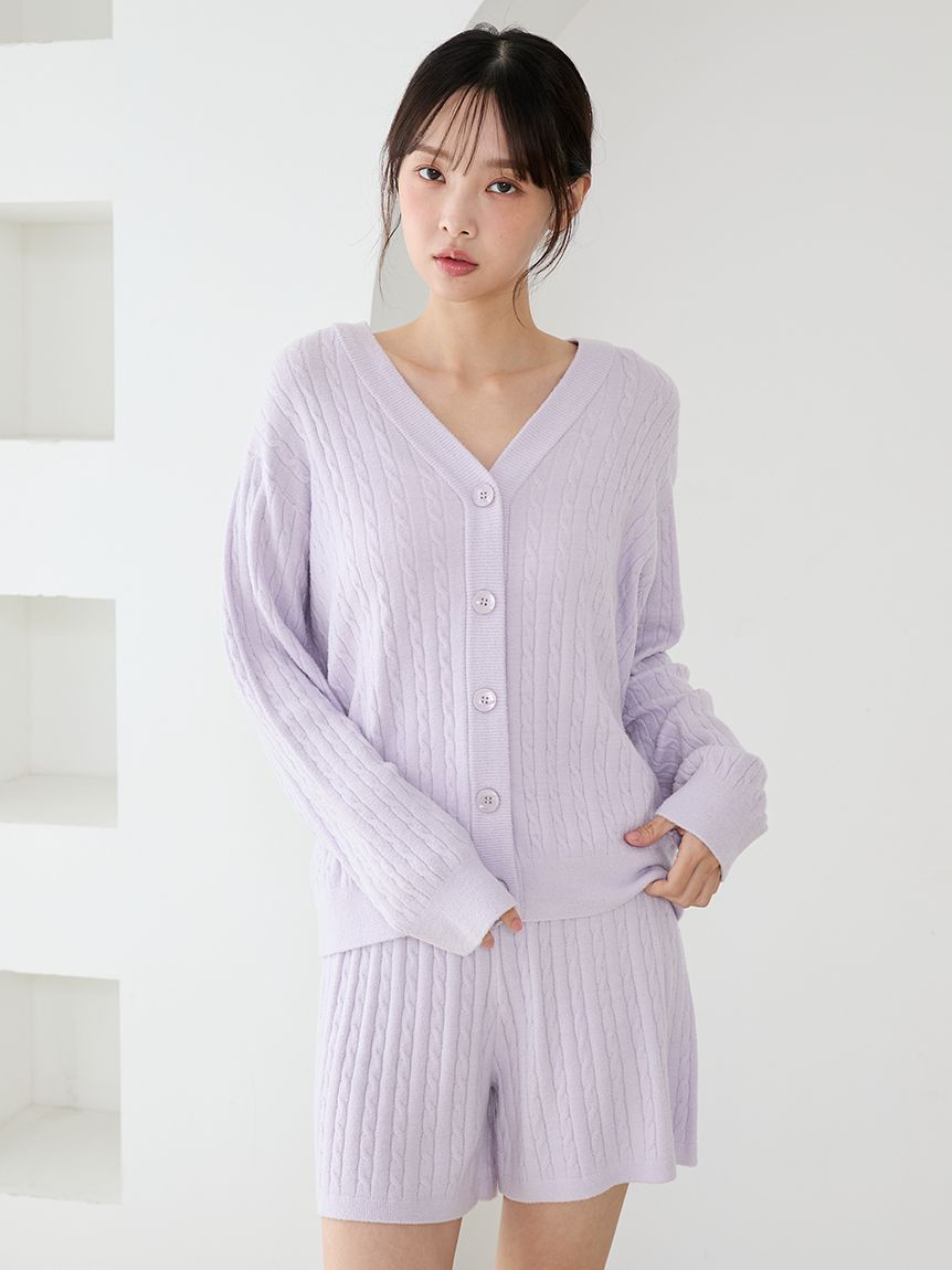 This is a series of light Aran knits using 'Smoothie Lite', which allows you to enjoy a smooth feel even in sweaty seasons. These shorts have a slightly longer length, giving them a sophisticated look, as well as a relaxing and comfortable fit. There is a pocket on the right back. We also paid attention to the contrasting colors that evoke early summer. Available in three colors: cool lavender, vibrant pink, and calm navy, we recommend pairing them with the pullover or cardigan from the same series.